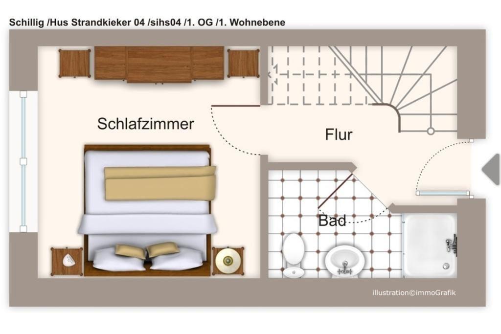 Das Apartment verfügt über kostenfreies WLAN. Die Aufteilung der drei Ebenen des Feriendomizils ergibt sich folgendermaßen: Schlafzimmer mit Doppelbett, Bad mit Dusche und Abstellraum liegen im 1. Geschoss, Wohnschlafbereich mit Doppelschlafcouch, offene Küche und Balkon mit herrlichem Nordsee-Blick auf der 2. Etage und zur 3. Ebene gehören ein 2. Schlafzimmer mit 2 Einzelbetten und ein 2. Bad mit Dusche.
