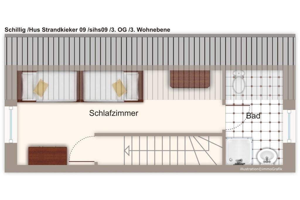 Die Apartmentanlage „Hus Strandkieker“ in Schillig beherbergt individuelle Maisonette-Apartments: Über drei Wohnebenen und auf 75 qm Wohnfläche finden bis zu 4 Urlaubsgäste hier ihr Urlaubszuhause. Vom Balkon der gemütlichen 3-Zimmer Ferienwohnung aus hat man einen herrlichen Blick auf die Nordsee.