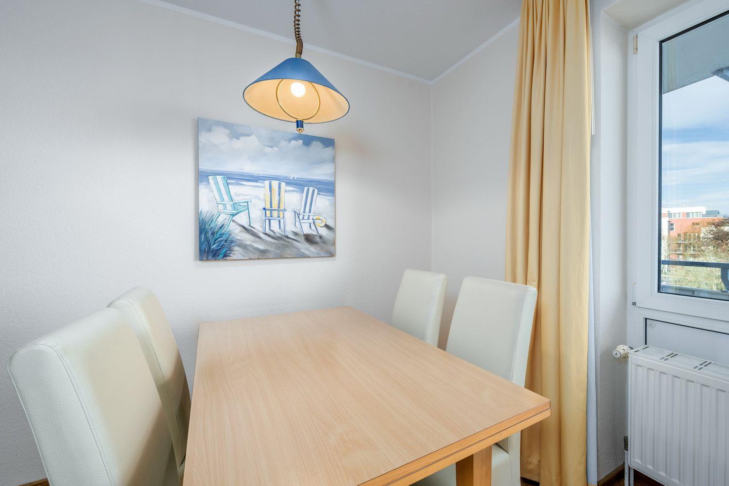 Das komfortable Apartment mit Duschbad besteht aus 2 Schlafzimmern mit Doppelbett bzw. Einzelbett, einem Wohnbereich mit Doppelschlafcouch und einem Balkon mit Blick auf die Nordsee.
