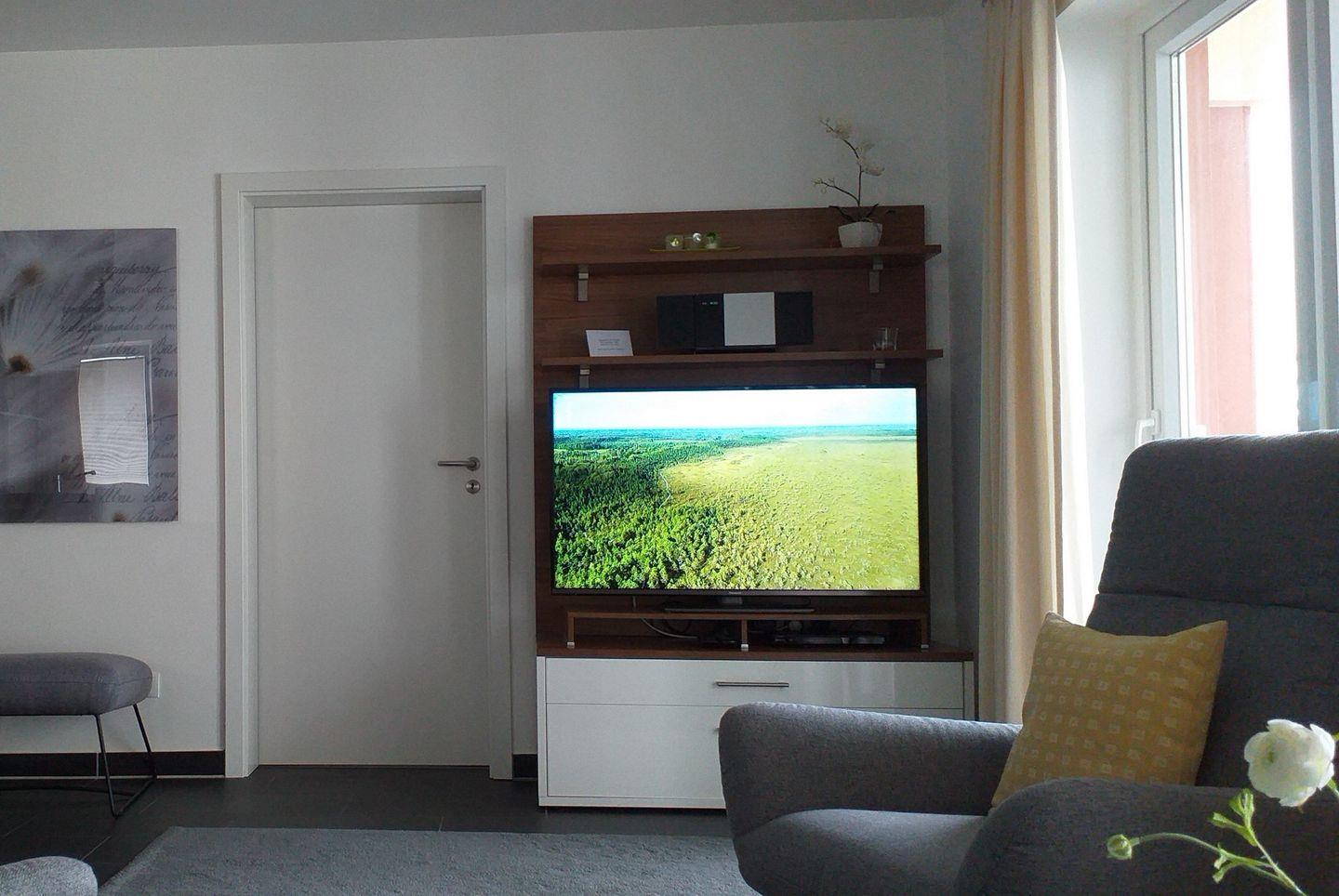 Die Ferienwohnung besteht aus zwei Schlafzimmern mit Doppelbetten (1,80 x 2,00 m und 1,60 x 2,00 m) und Verdunklungsmöglichkeiten, einem Wohnbereich mit großem SMART-TV (50 Zoll), einem hochwertigen Bad mit Dusche, Badewanne, Sauna, Fußbodenheizung, Föhn und Kosmetikspiegel und einem Südbalkon mit idyllischem Ausblick.
