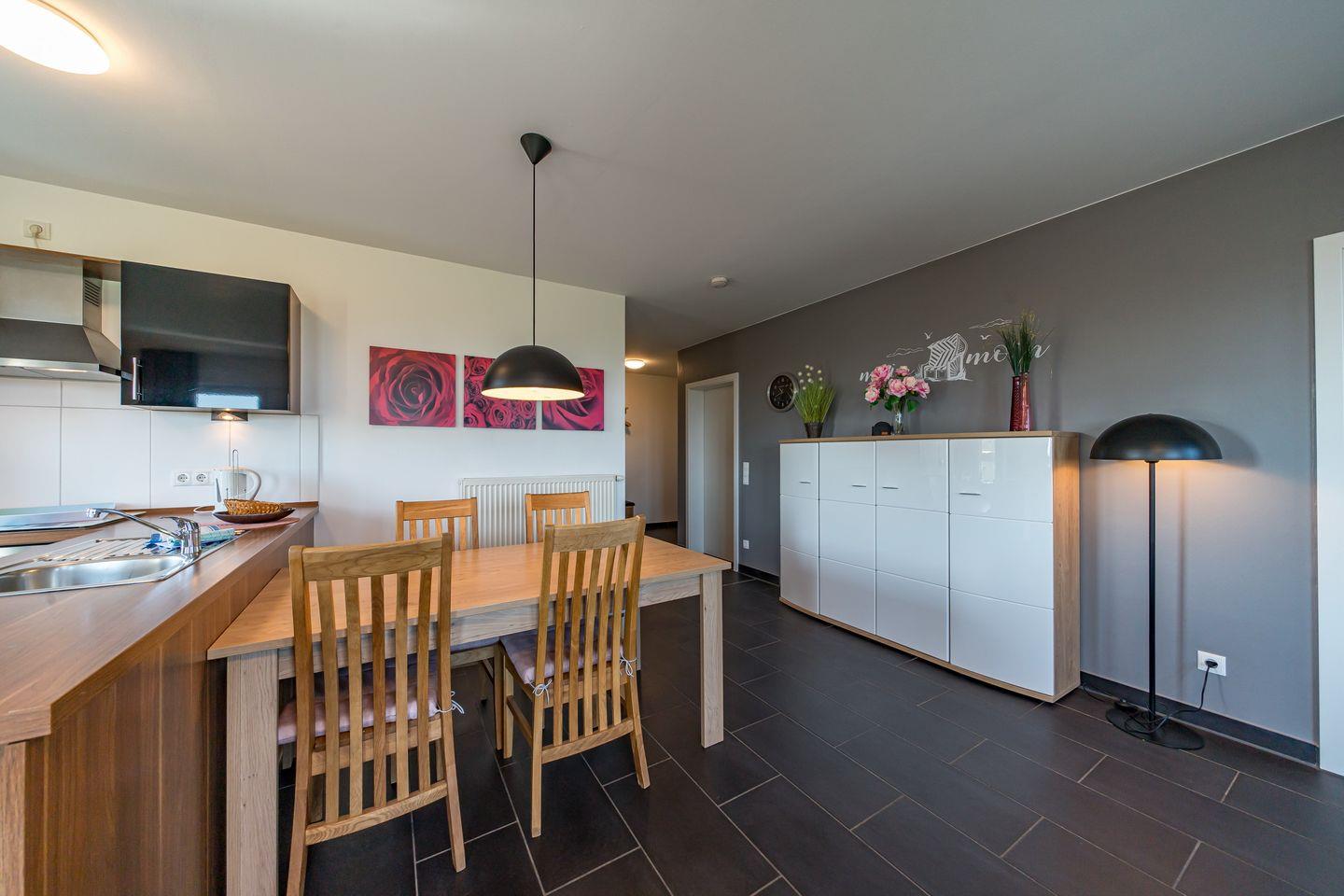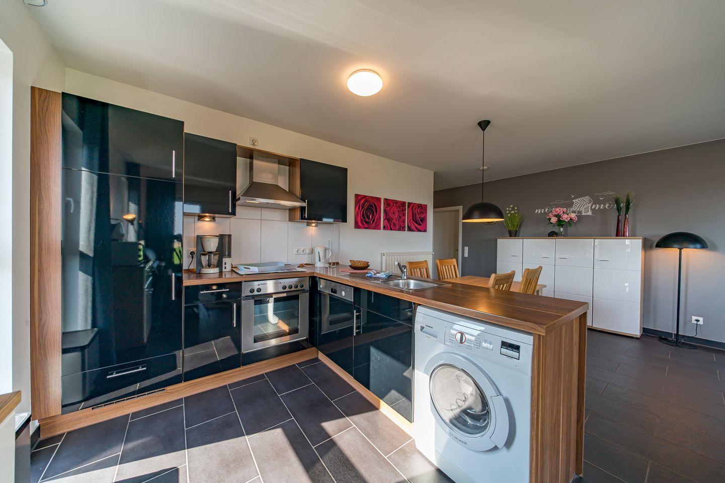 Das harmonisch gestaltete Apartment verfügt außerdem über eine voll ausgestattete offene Küche mit Ceranherd und Backofen, Geschirrspüler und Tiefkühlfach, Wasserkocher, Kaffeemaschine, Toaster und Waschmaschine.