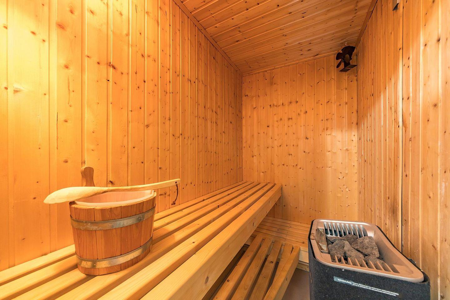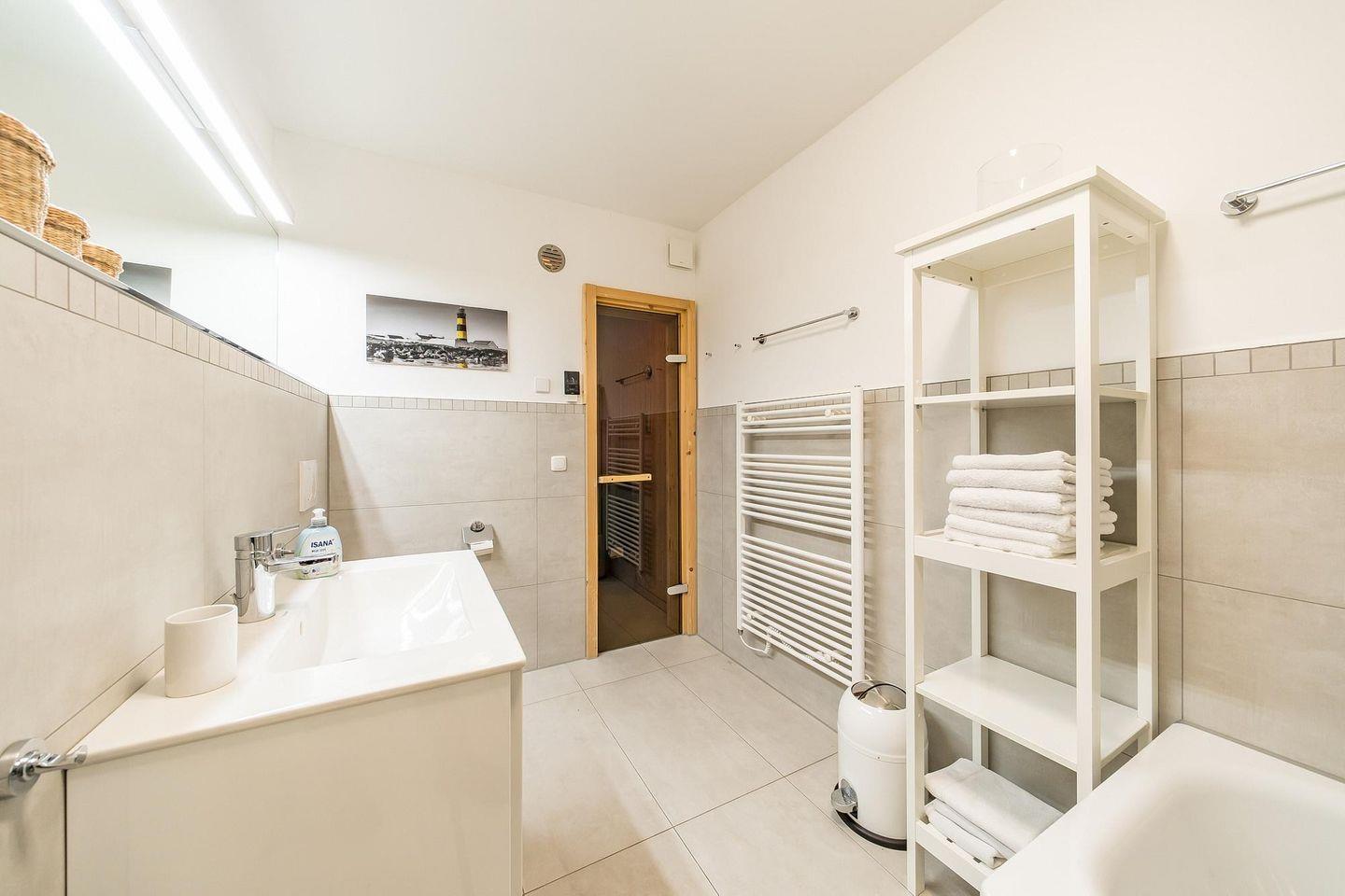 Die zweite Ebene beinhaltet zwei separate Schlafzimmer mit einem Doppelbett bzw. zwei Einzelbetten sowie das hochwertige Badezimmer mit Sauna, Badewanne, Waschtisch, WC, begehbarer Dusche, Handtuchwärmer, Kosmetikspiegel, Föhn und Waschmaschine mit Trocknerfunktion.