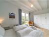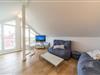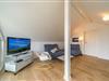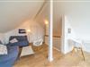 Auf der dritten Wohnebene, im Dachgeschoss des Ferienhauses und ganz privat gelegen, befindet sich ein drittes Schlafzimmer mit Doppelbett und einem Galerie-Wohnbereich mit SMART-TV und überdachtem Balkon. Von hier aus genießt ihr einen tollen Blick bis zum Meer und dem typischen Nordseedeich!