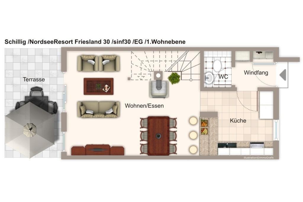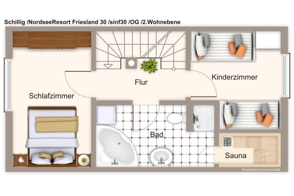 Das liebevoll eingerichtete Ferienhaus im skandinavischen Stil verläuft über drei Wohnebenen und befindet sich in Haus 30, in nordöstlicher Lage. Das Haus liegt unmittelbar an der ‚Graft‘, einem idyllischen Wasserlauf, der durch das Resort verläuft. Das weitläufige Grundstück der Ferienanlage grenzt im Nordosten direkt an den Deich. Die Nordsee und der feine Sandstrand sind nur 200 m entfernt. Hier gibt es nahezu keinen Autoverkehr. Genießt das wohltuende Meeresklima bei ausgiebigen Spaziergängen oder gemütlichen Stunden im geschützten Strandkorb. Zahlreiche Einkaufsmöglichkeiten, Restaurants und Cafés sind bequem zu Fuß oder mit dem Fahrrad zu erreichen. In der Umgebung locken tolle Freizeit- und Familienangebote wie z. B. das 2.500 qm große Thalasso Meeres SPA in Horumersiel oder der beliebte Wasserskilift Hooksiel mit großer Sonnenterrasse. Unser Familien-Tipp: Macht eine geführte Wattwanderung!