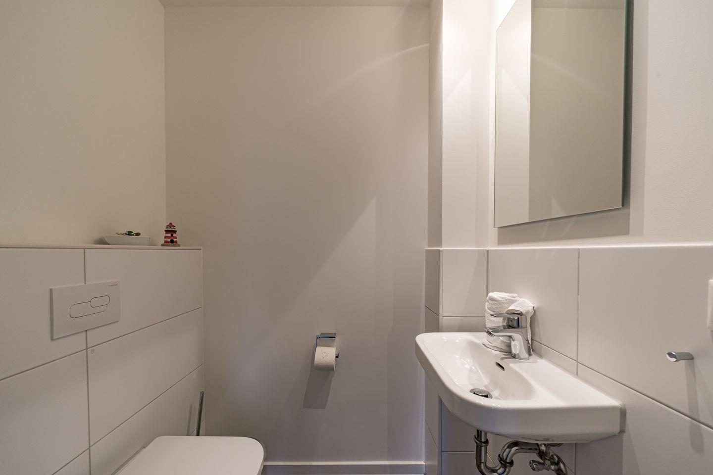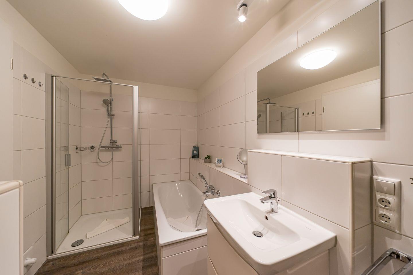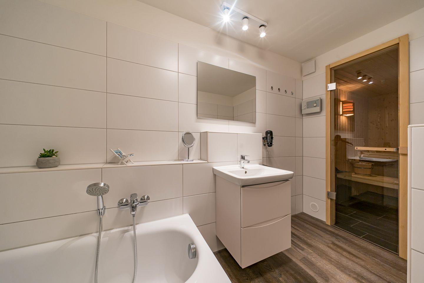 Ein stilvolles Badezimmer mit Badewanne, Fußbodenheizung, Regendusche, WC, Waschtisch, Kosmetikspiegel und Föhn sowie ein separates Gäste-WC stehen euch zur Verfügung. Ein weiteres Highlight ist die eigene Sauna im Badezimmer des Hauses.