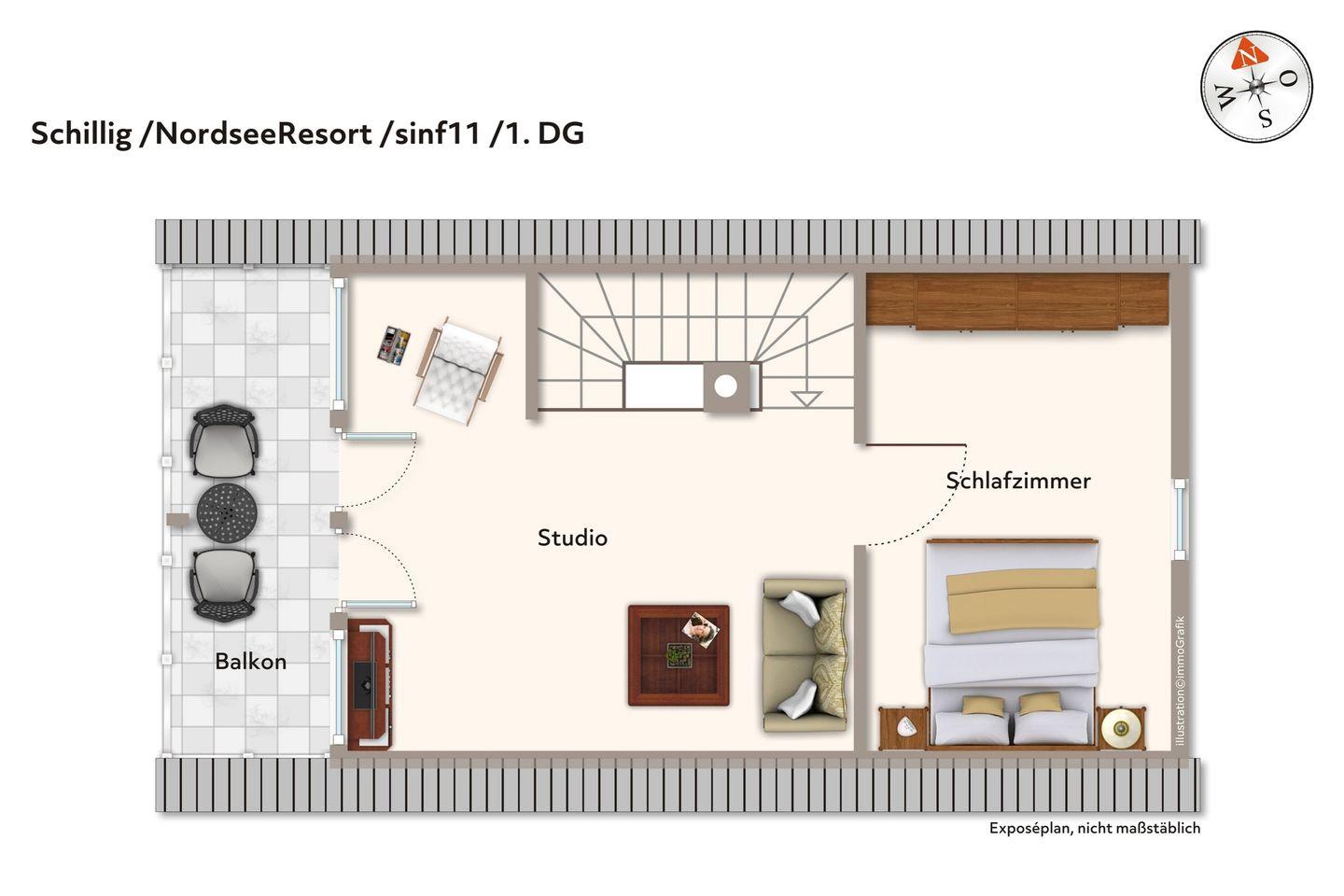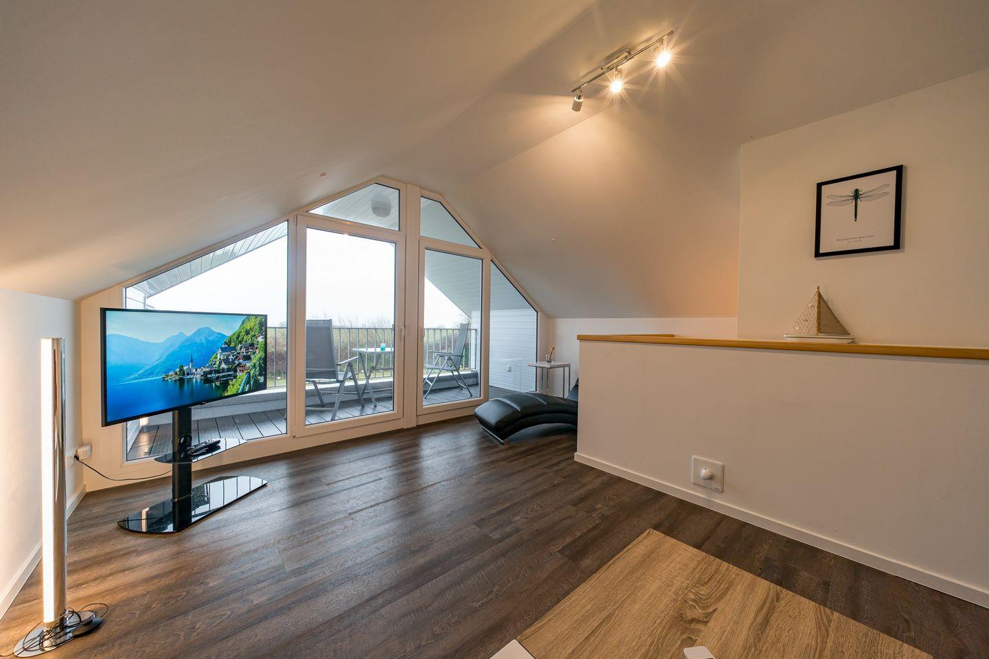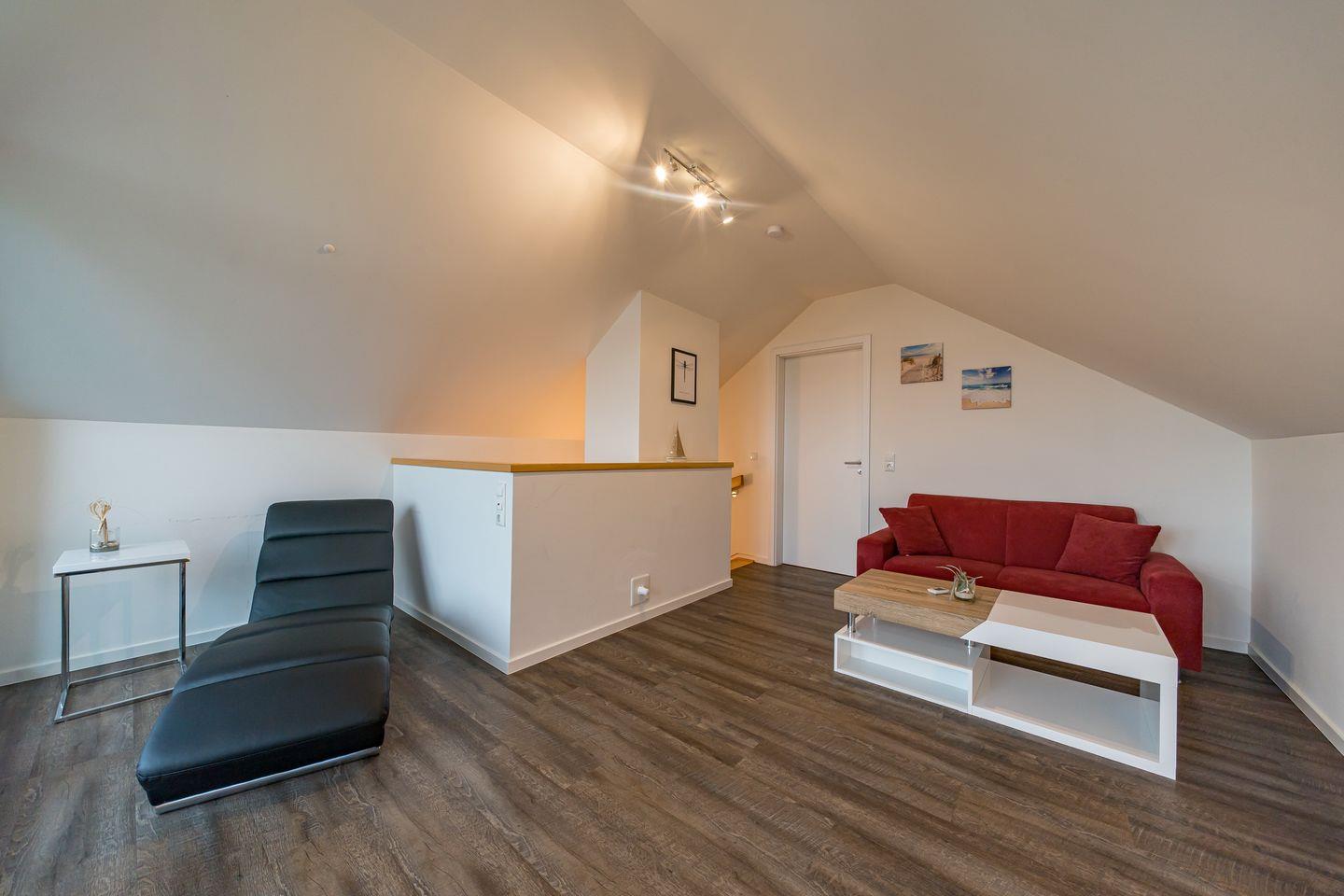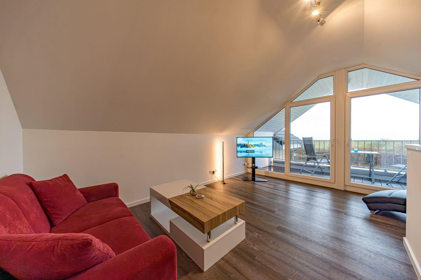 Ein überdachter Balkon - nach Norden gelegen - und mit Blick zum Meer und dem vorgelagerten Deich verspricht Nordseefeeling pur. Der überdachte Balkon befindet sich im Dachgeschoss und ist von einem weiteren Wohnbereich auf der Galerie aus begehbar. Hier stehen euch ein Flatscreen-TV, Sofaecke und eine Relax-Liege zur Verfügung.
