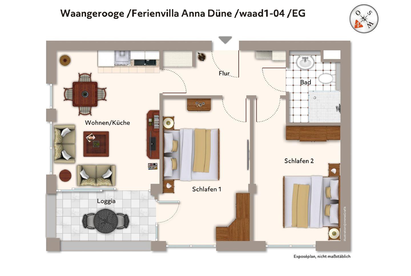 Die 61 m² große und barrierearme 3-Zimmer Ferienwohnung ist für bis zu 5 Personen geeignet. Besonders hervorzuheben ist die Loggia in Süd-West-Lage.
