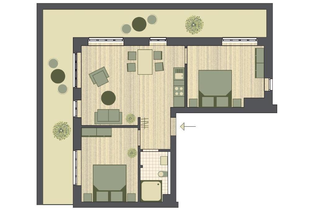 Die 75 m² große 3-Zimmer Ferienwohnung ist für bis zu 5 Personen geeignet. Besonders hervorzuheben ist der sagenhaft große, sonnige Balkon in Süd-West-Lage, der sich über zwei Seiten des großzügigen Apartments erstreckt.