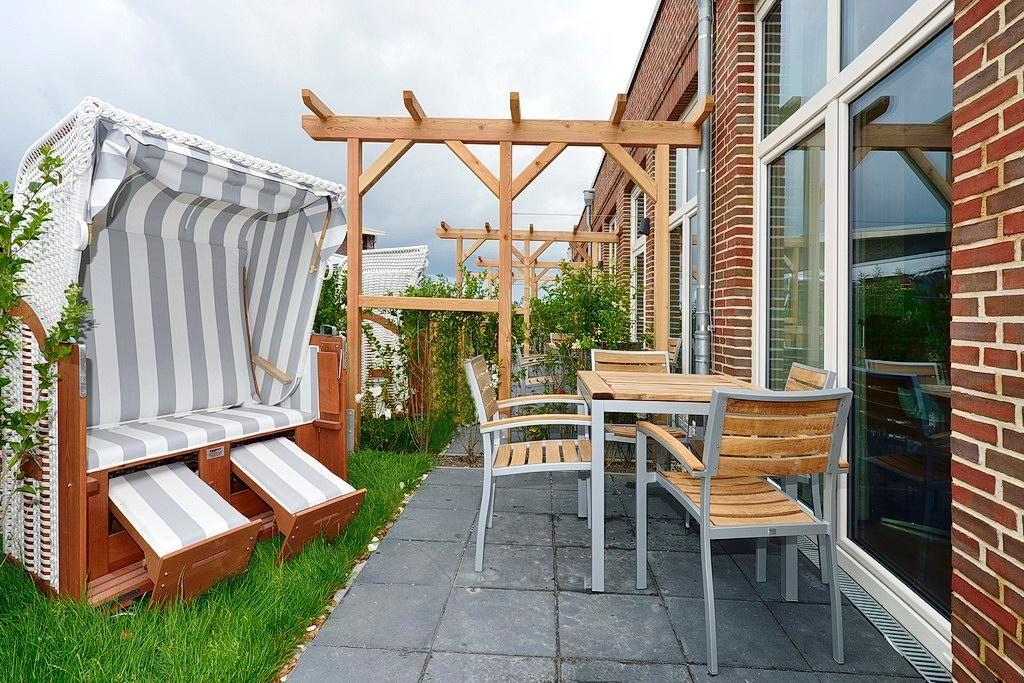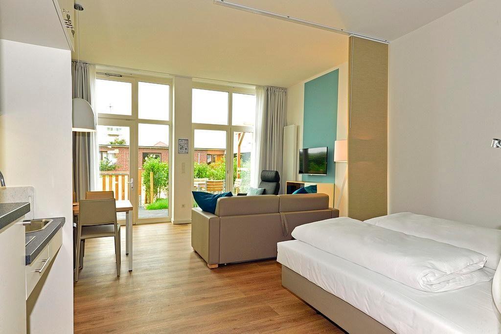 Das Apartment ist mit einer kleinen, aber feinen Pantryküche ausgestattet. Diese verfügt u. a. über ein Gefrierfach, eine Kaffeemaschine, einen Toaster und einen Wasserkocher. Das stilvolle und behindertenfreundliche Bad ist mit einer großzügigen Dusche und Sitzgelegenheit ausgestattet. Der Spiegel über dem Waschtisch ist verstellbar und neben dem WC befinden sich Griffe. Zudem sind Badeingang und alle weiteren Türen im Apartment 95 cm breit. Im Badezimmer befinden sich zudem ein Föhn und Kosmetikspiegel. Das moderne Wohn- und Schlafzimmer bietet euch einen großen Flatscreen-TV, eine HiFi-Anlage und eine Einzelschlafcouch. Ein Kinderbett kann gegen Entgelt im Wohnbereich aufgestellt werden. Nach einem erholsamen Urlaubstag könnt ihr auf der westseitigen Terrasse entspannen. Das Apartment verfügt neben den Gartenmöbeln für 4 Personen über einen eigenen Strandkorb auf der Terrasse.