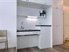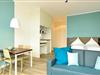 Das Apartment ist mit einer kleinen, aber feinen Pantryküche ausgestattet. Diese verfügt u. a. über ein Gefrierfach, eine Kaffeemaschine, einen Toaster und einen Wasserkocher. Das stilvolle und behindertenfreundliche Bad ist mit einer großzügigen Dusche und Sitzgelegenheit ausgestattet. Der Spiegel über dem Waschtisch ist verstellbar und neben dem WC befinden sich Griffe. Zudem sind Badeingang und alle weiteren Türen im Apartment 95 cm breit. Im Badezimmer befinden sich zudem ein Föhn und Kosmetikspiegel. Das moderne Wohn- und Schlafzimmer bietet euch einen großen Flatscreen-TV, eine HiFi-Anlage und eine Einzelschlafcouch. Ein Kinderbett kann gegen Entgelt im Wohnbereich aufgestellt werden. Nach einem erholsamen Urlaubstag könnt ihr auf der westseitigen Terrasse, ausgestattet mit einem Strandkorb, entspannen.