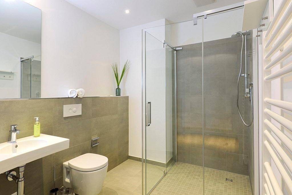 Das Apartment ist mit einer kleinen, aber feinen Pantryküche ausgestattet. Diese verfügt u. a. über ein Gefrierfach, eine Kaffeemaschine, einen Toaster und einen Wasserkocher. Im stilvollen Badezimmer befinden sich eine große, begehbare Dusche sowie ein Waschtisch mit Föhn und Kosmetikspiegel.