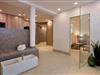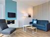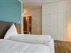 Das moderne Apartment verfügt über ein Wohn-/Schlafzimmer mit Doppelbett und Einzelschlafcouch, einen großen Flatscreen-TV und eine HiFi-Anlage. Der Schlafbereich mit dem Doppelbett lässt sich durch ein Schiebeelement vom Wohnbereich separieren. Ein Kinderbett kann gegen Entgelt im Wohnbereich aufgestellt werden.