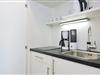 Das barrierearme Apartment ist mit einer kleinen, aber feinen Pantryküche ausgestattet. Diese verfügt u. a. über ein Gefrierfach, eine Kaffeemaschine, einen Toaster und einen Wasserkocher. Im stilvollen Badezimmer befinden sich eine große, begehbare Dusche sowie ein Waschtisch mit Föhn und Kosmetikspiegel.