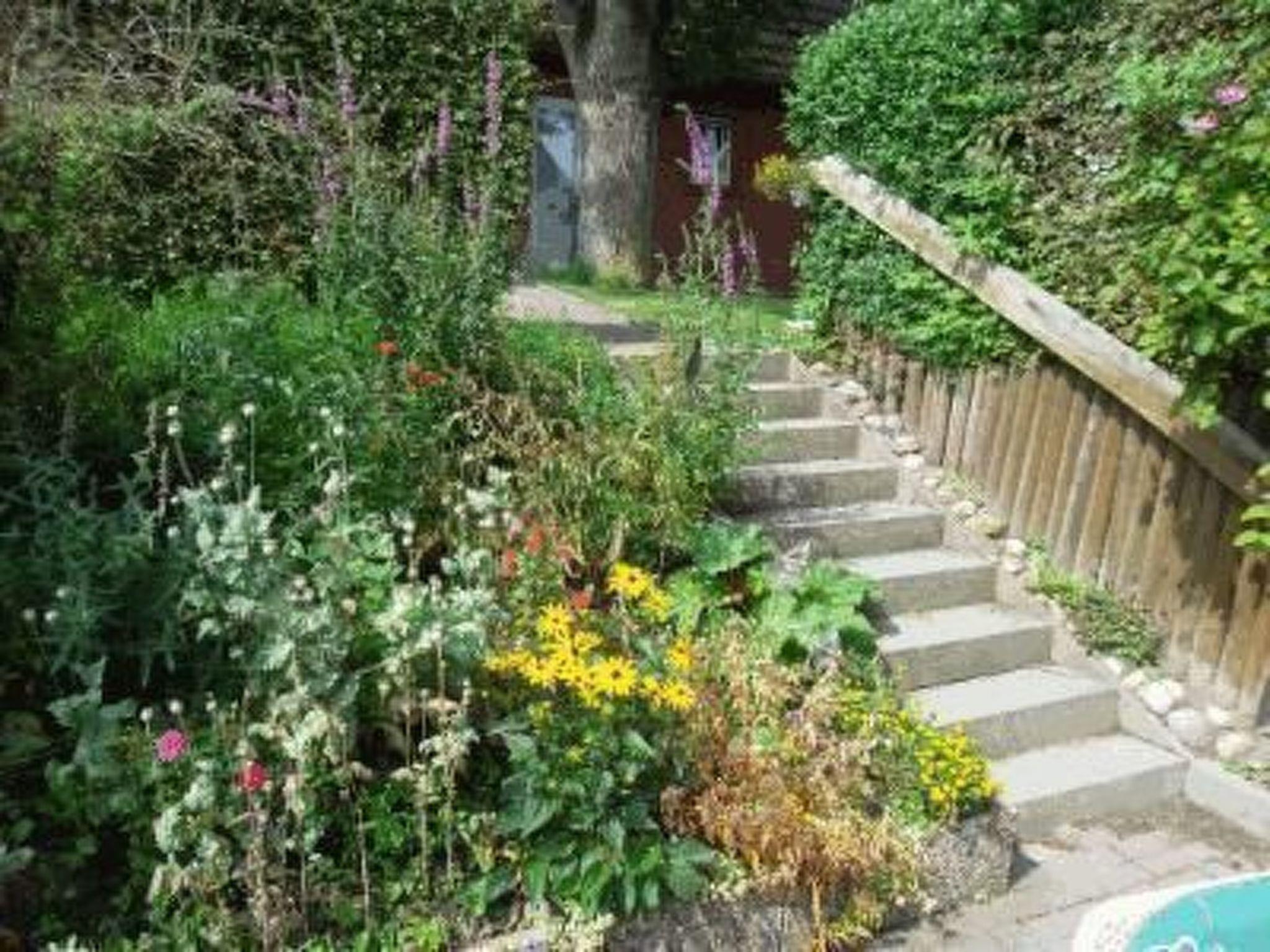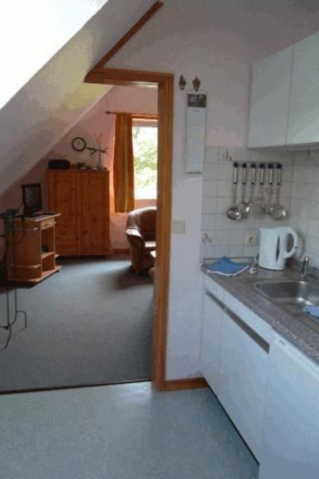 The house provides accommodation for two people on the raised ground floor. At the top there is a living room, then a little hallway with space for coats, shoes, suitcases and other items. The hallway provides access to the kitchen and dining space and the little shower room. The kitchen is equipped with a stove, oven, coffee machine and fridge. There is no dishwasher. Then there is the living room and bedroom. The beds measure 90 x 200cm and are set up one behind the other as alcove beds, separated from the living room by a curtain.