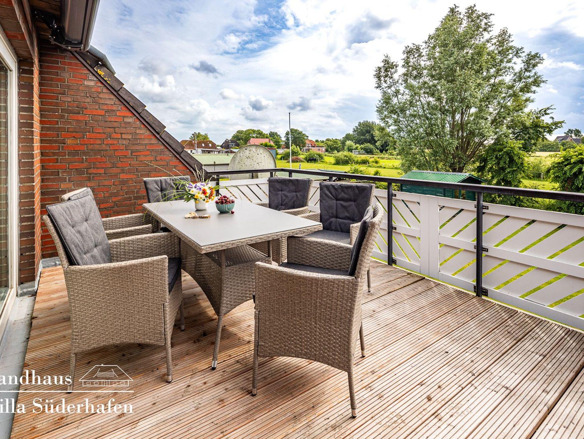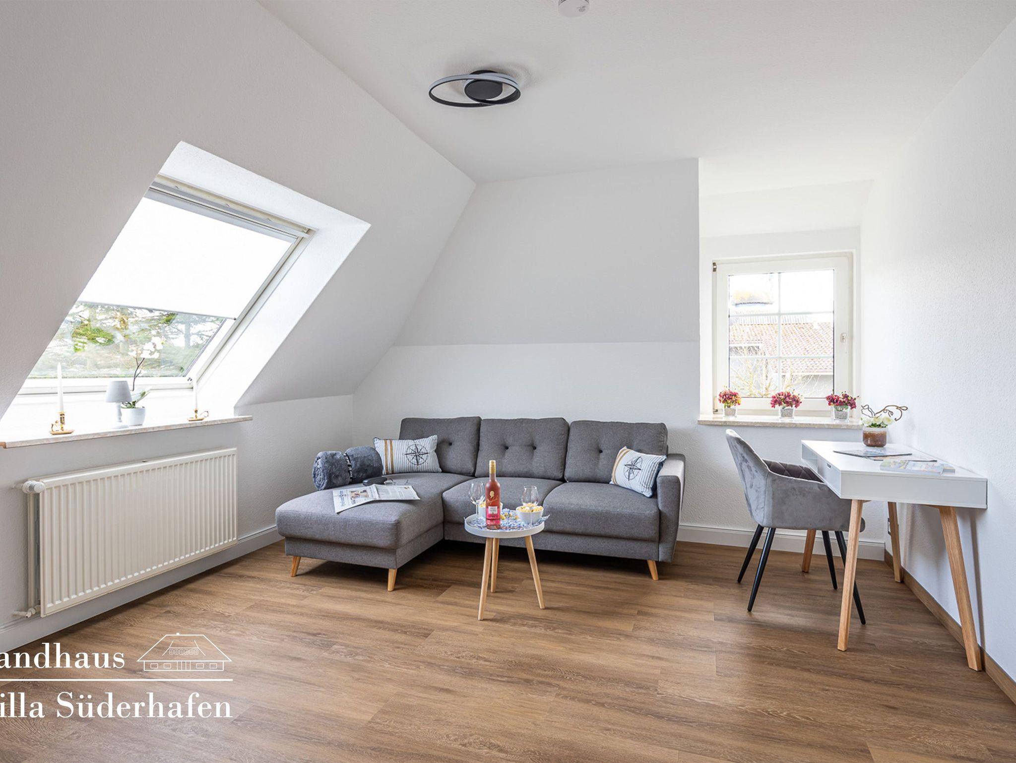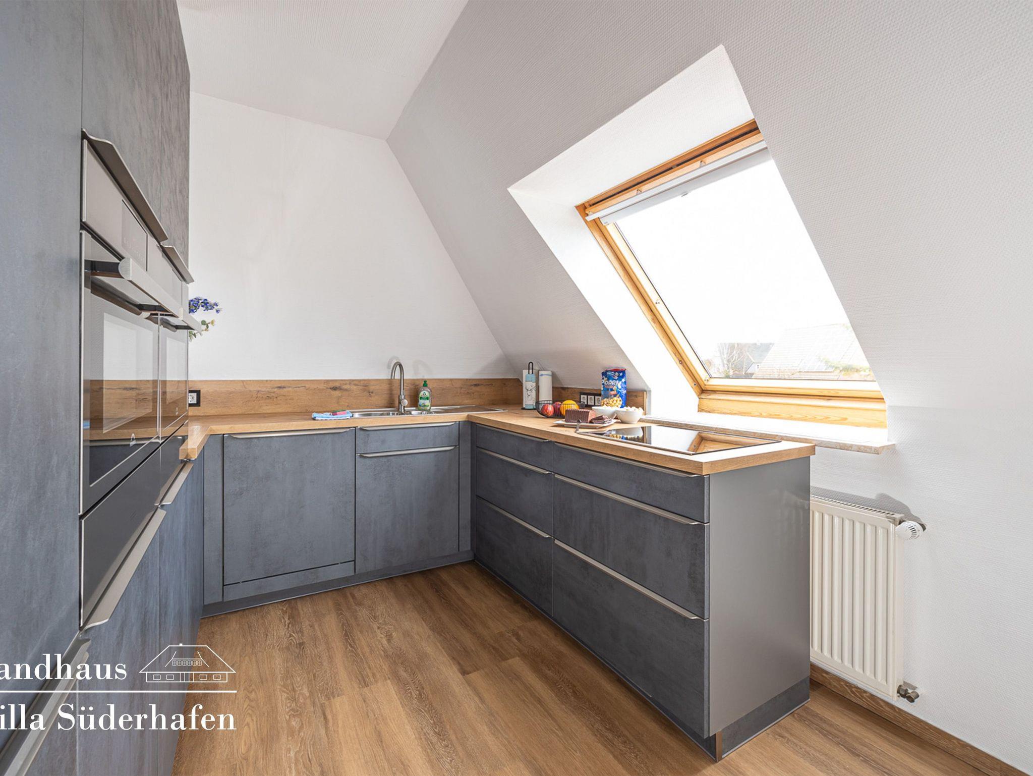 Gemeinsam mit ihrer Familie oder ihren Freunden nutzen Sie den Wohn- und Essbereich, die Dachterrasse mit Blick über die Wiesen bis zum Deich und die komplett ausgestattete Küche.