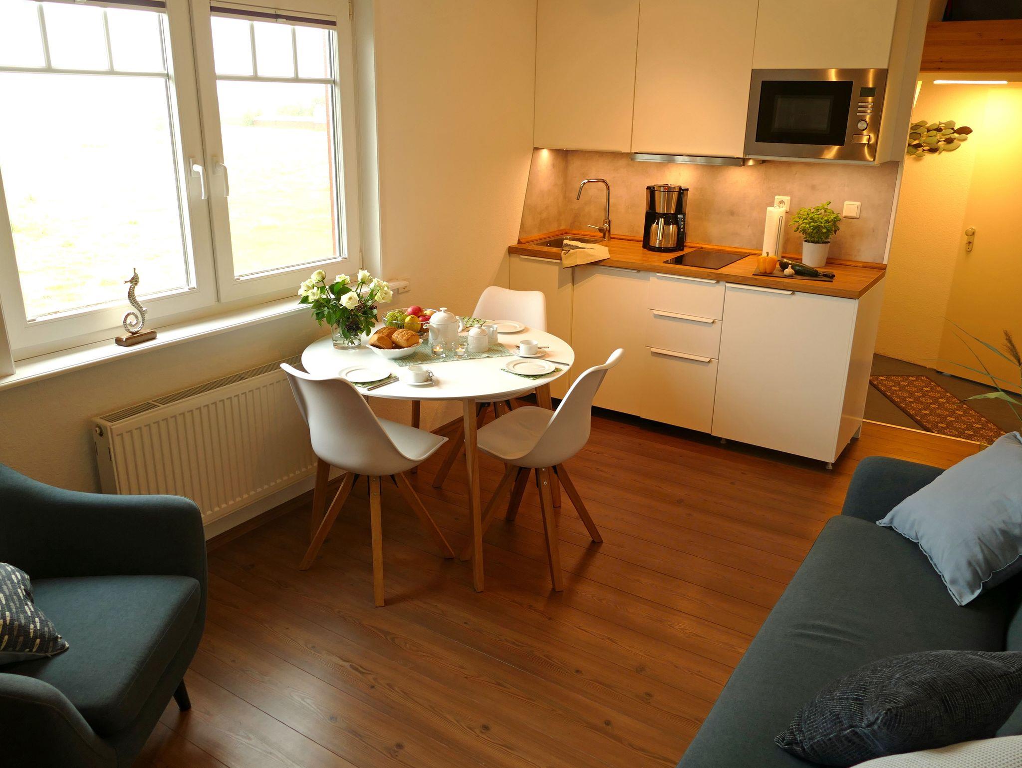 Ihre Ferienwohnung im ersten Stock erreichen Sie ganz bequem über eine separate Außentreppe. Dort erwartet Sie ein großzügiger, einladender Wohnbereich mit gemütlicher Sitzecke und TV perfekt für entspannte Abende. Die angrenzende Essecke und die moderne Einbauküche bieten alles, was Sie für gemeinsame Mahlzeiten benötigen. Zwei liebevoll eingerichtete Schlafzimmer mit komfortablen Doppelbetten sorgen für erholsamen Schlaf. Das Badezimmer ist mit einer Dusche und WC ausgestattet, damit es Ihnen an nichts fehlt.