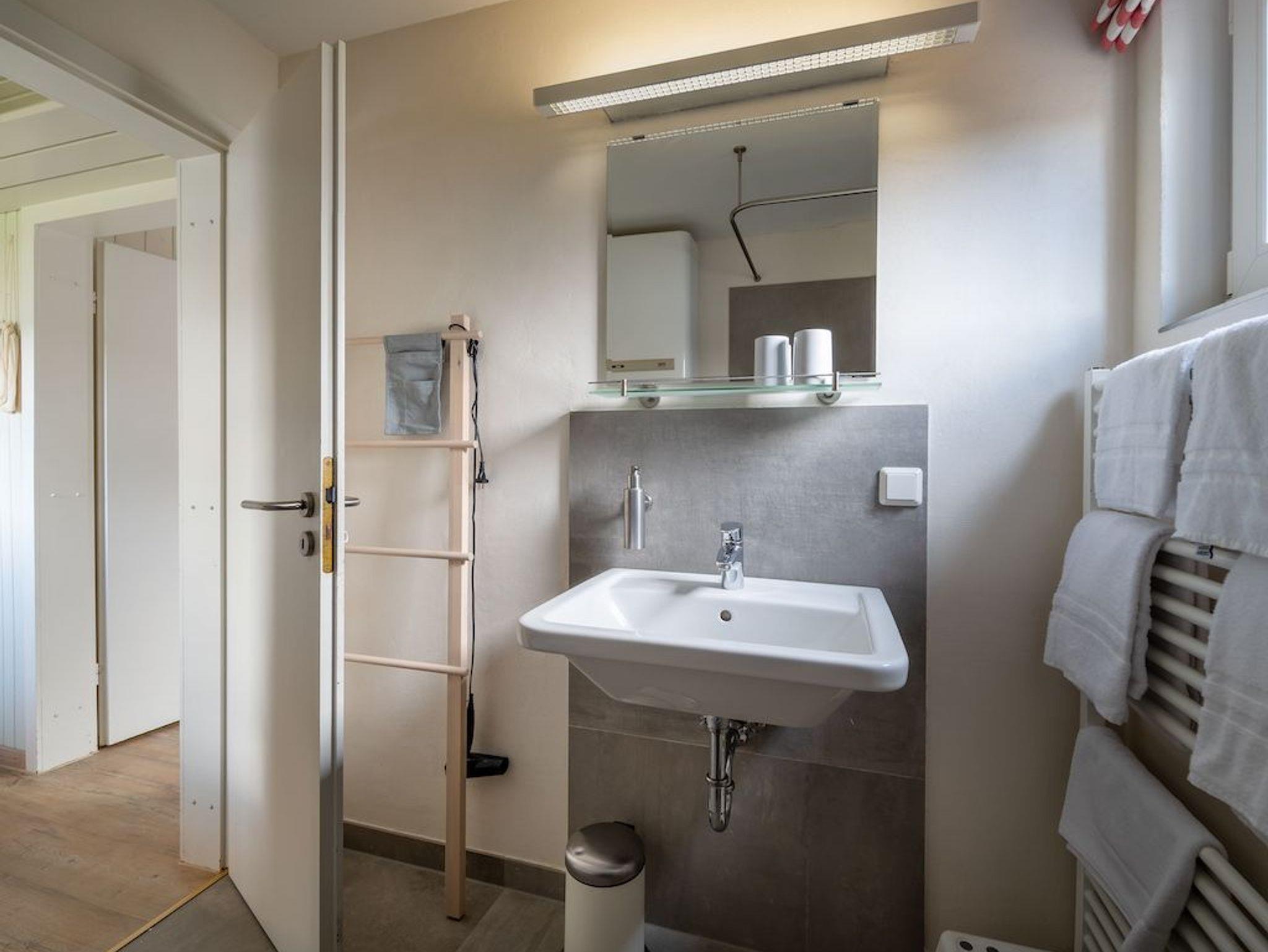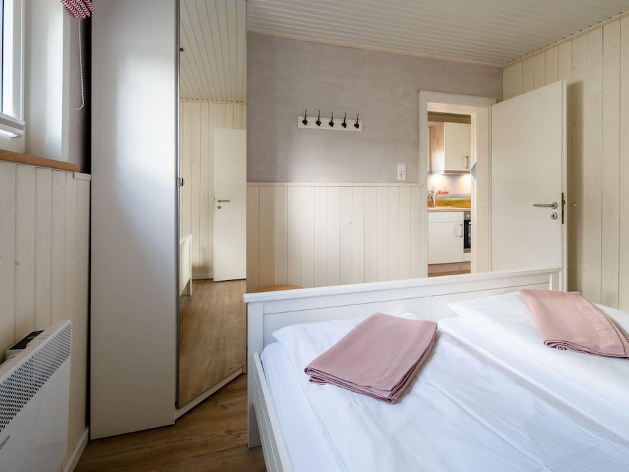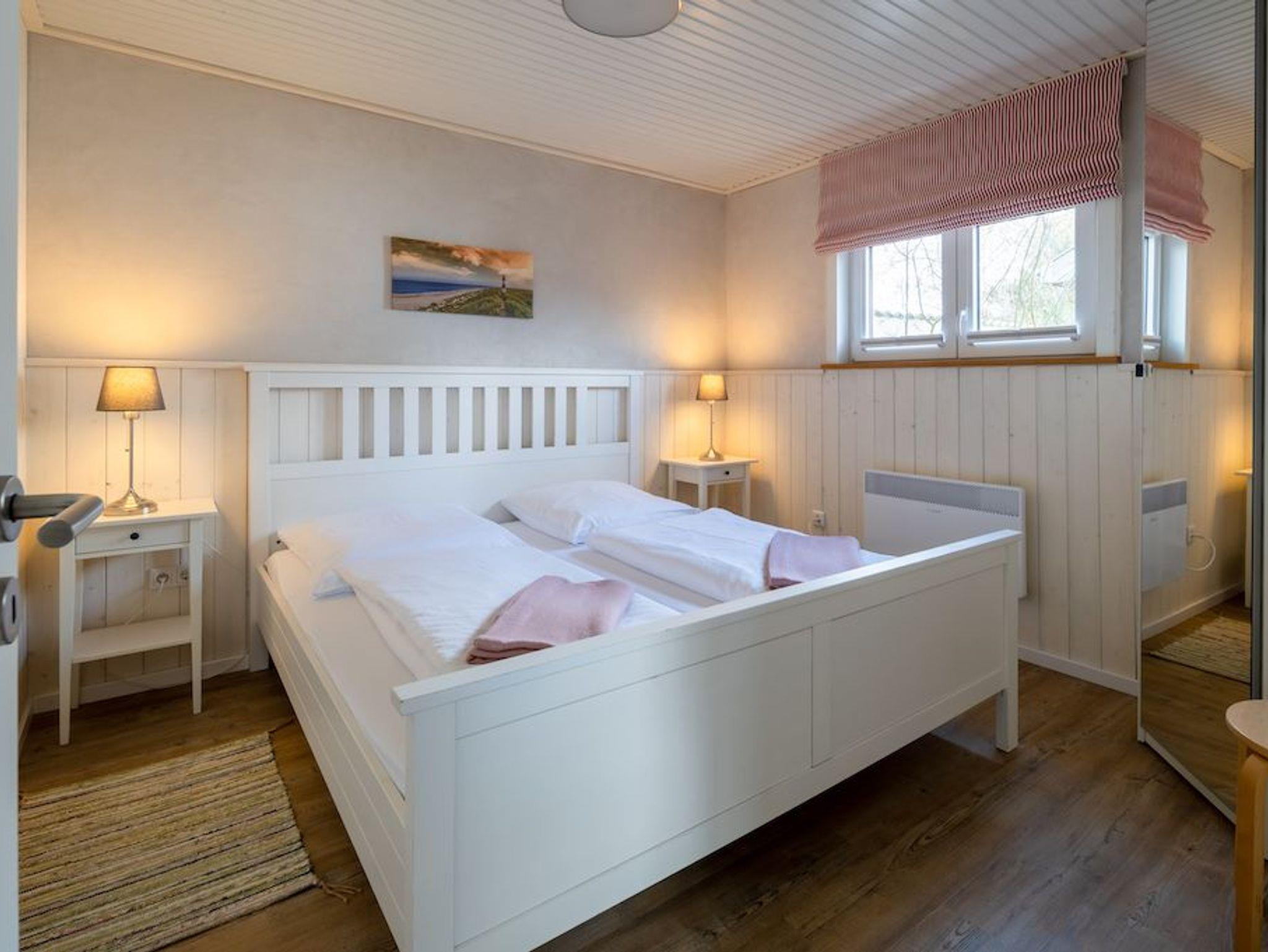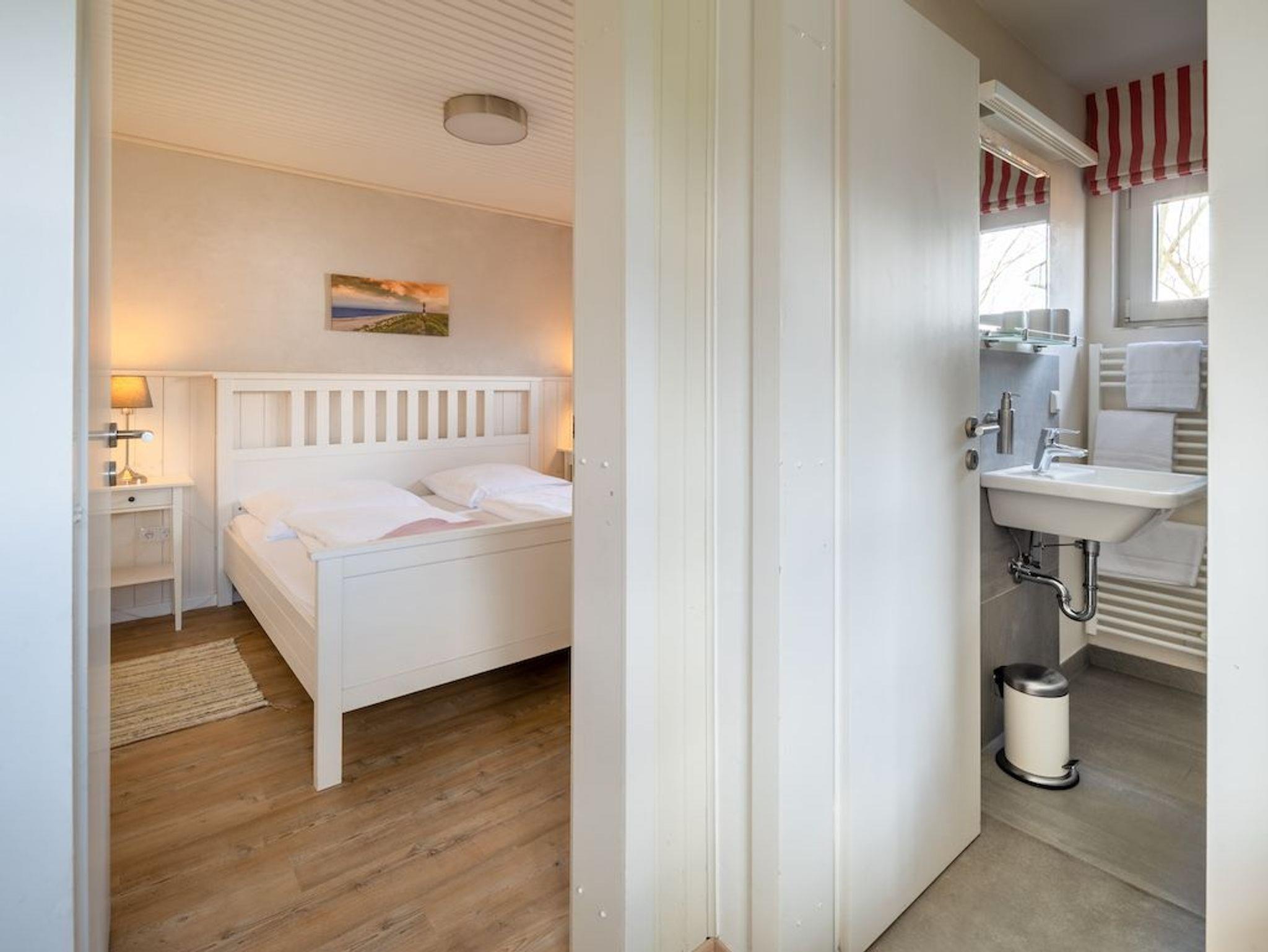 Das Schlafzimmer verfügt über ein Doppelbett (180x200cm) und ein weiteres Schlafzimmer mit ausziehbarem Doppelbett (160x200cm) sorgen für angenehmen Schlafkomfort für bis 4 Personen. Ein schönes Duschbad mit ebenerdiger Dusche, Fön, hängendem WC und beheiztem Handtuchwärmer bieten modernes Urlaubswohngefühl. Ein eigener PKW-Stellplatz, der mit dem Namen des Hauses gekenzzeichnet ist und Waschmaschine/Trockner im Gemeinschaftsserviceraum stehen ebenfalls zur Verfügung. Fahrräder können geschützt abgestellt werden. EIne Erstausstattung an Bettwäsche und Handtüchern kann optional für 20€ pro Person hinzugebucht werden.