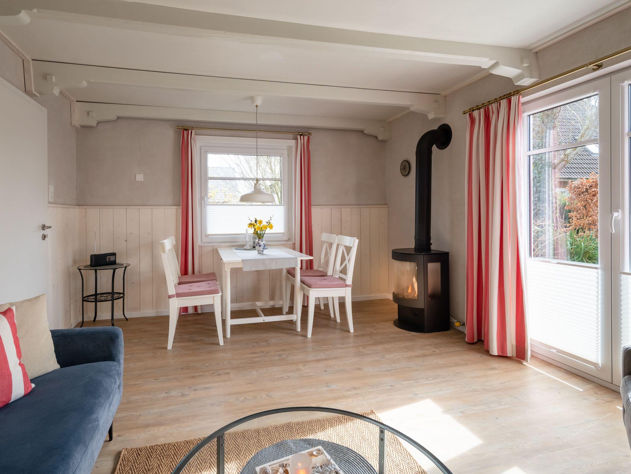 Erleben Sie einen erholsamen Urlaub in Haus Inge, einem eingeschossigen Ferienhaus für bis zu 4 Personen. Das Haus verfügt über ein Wohnzimmer, zwei Schlafzimmer, eine Küche und ein Duschbad. Ein Gaskaminofen im Wohnzimmer sorgt für wohlige Wärme. Die Einbauküche ist mit Herd/Ceranfeld, Backofen, Spülmaschine, Kaffeemaschine, Wasserkocher und Toaster ausgestattet.