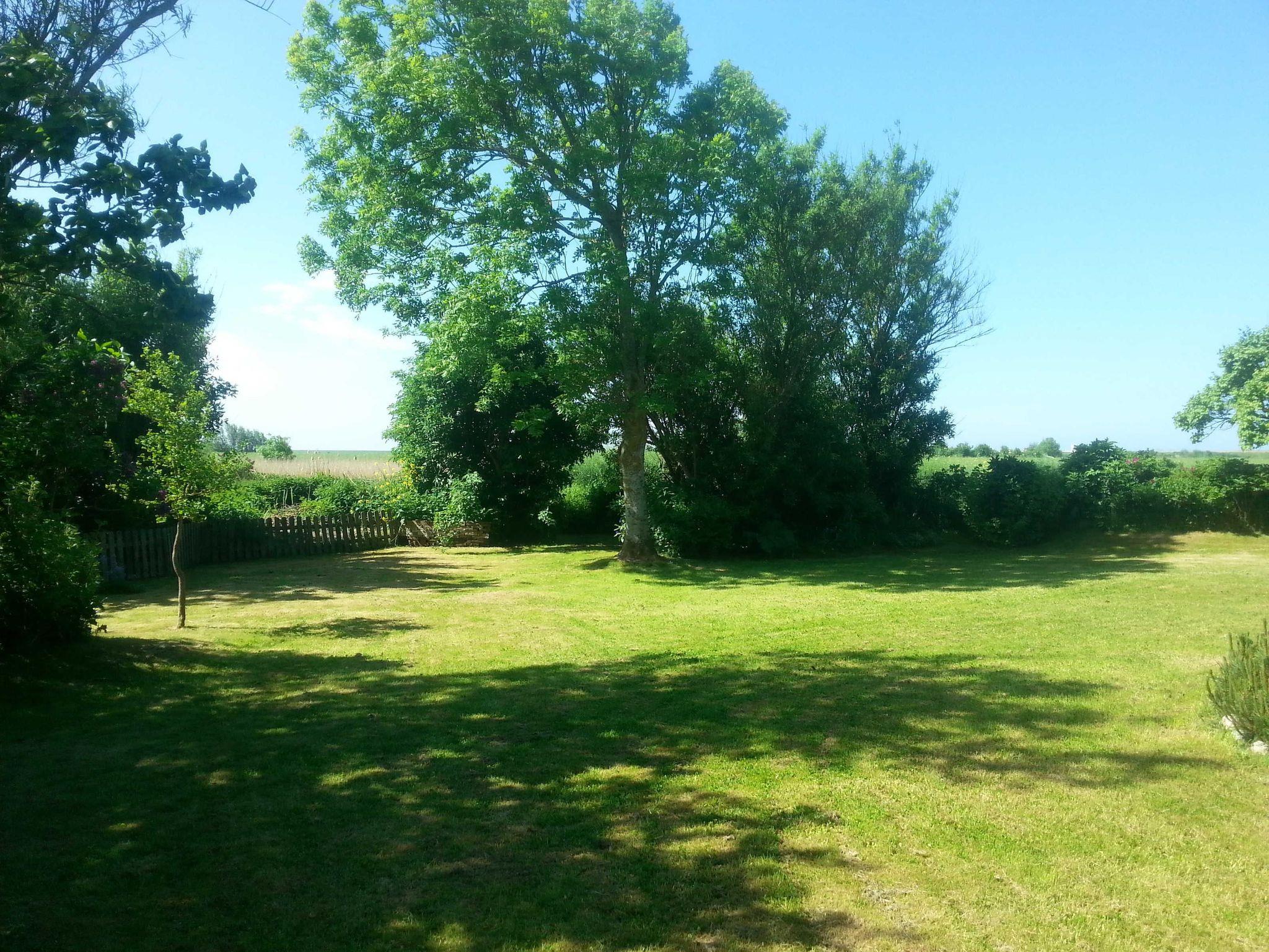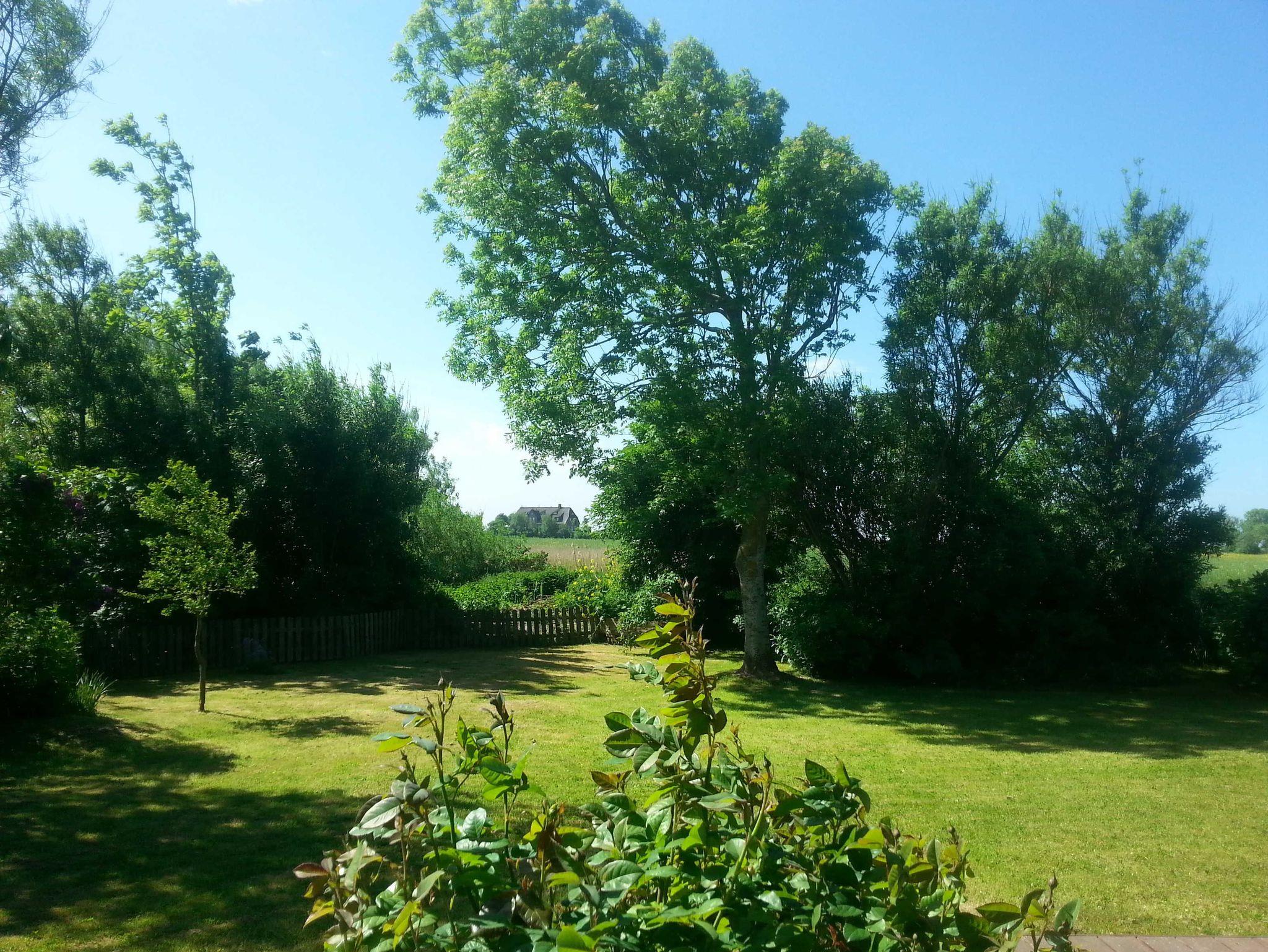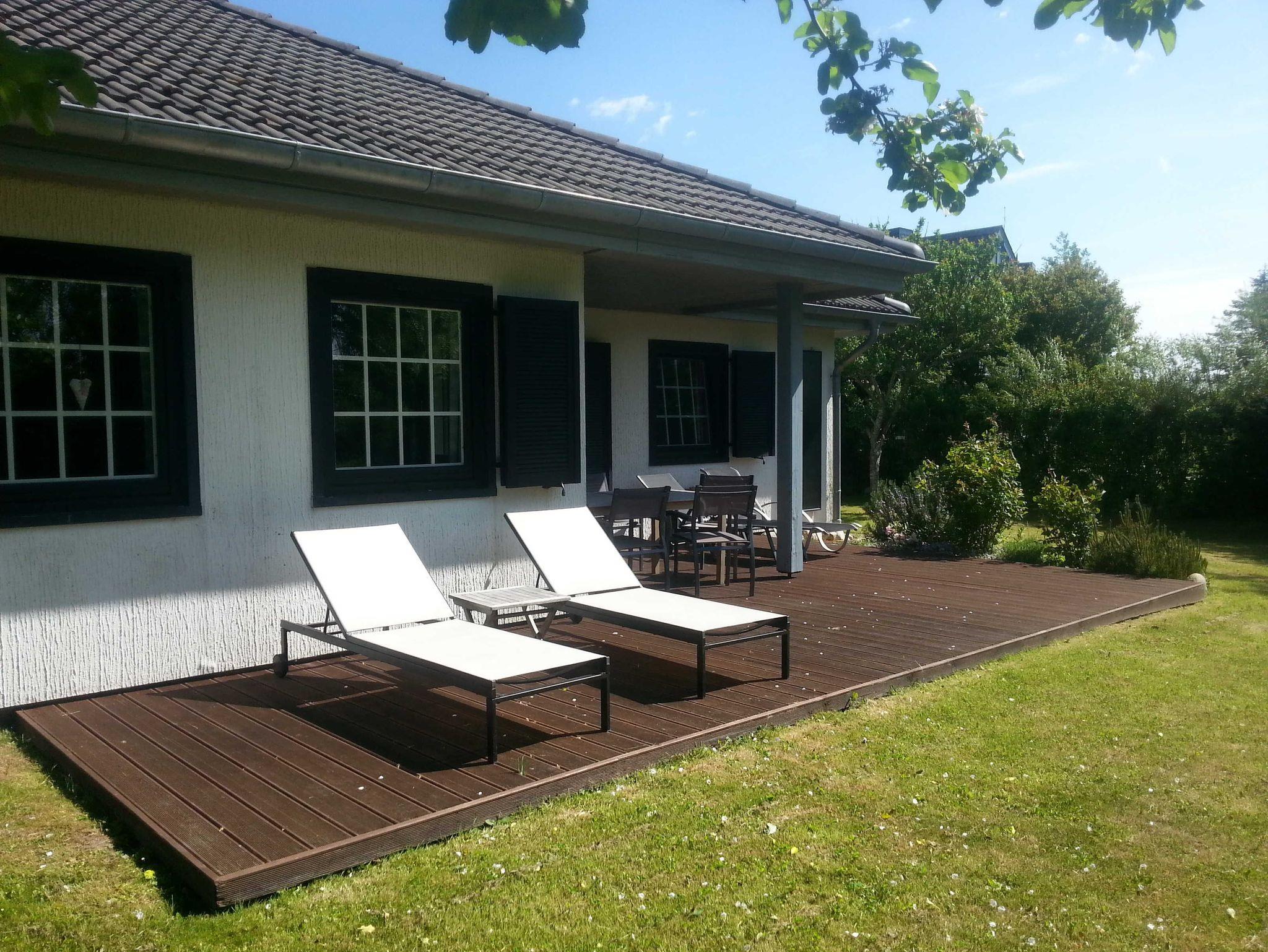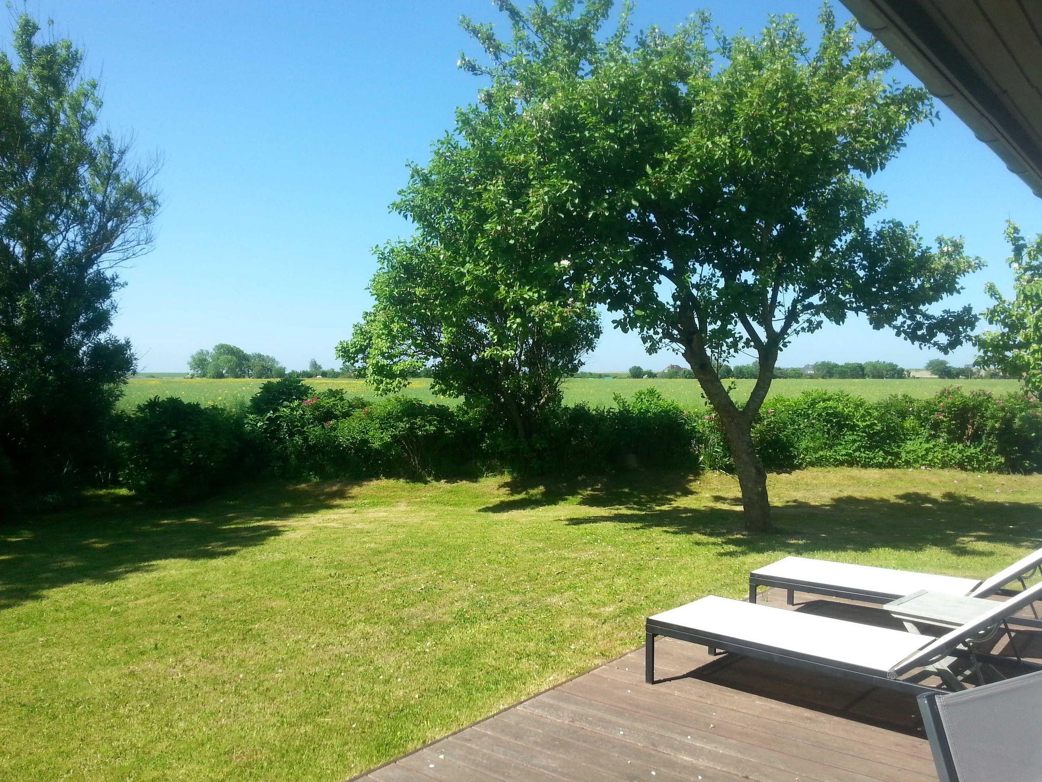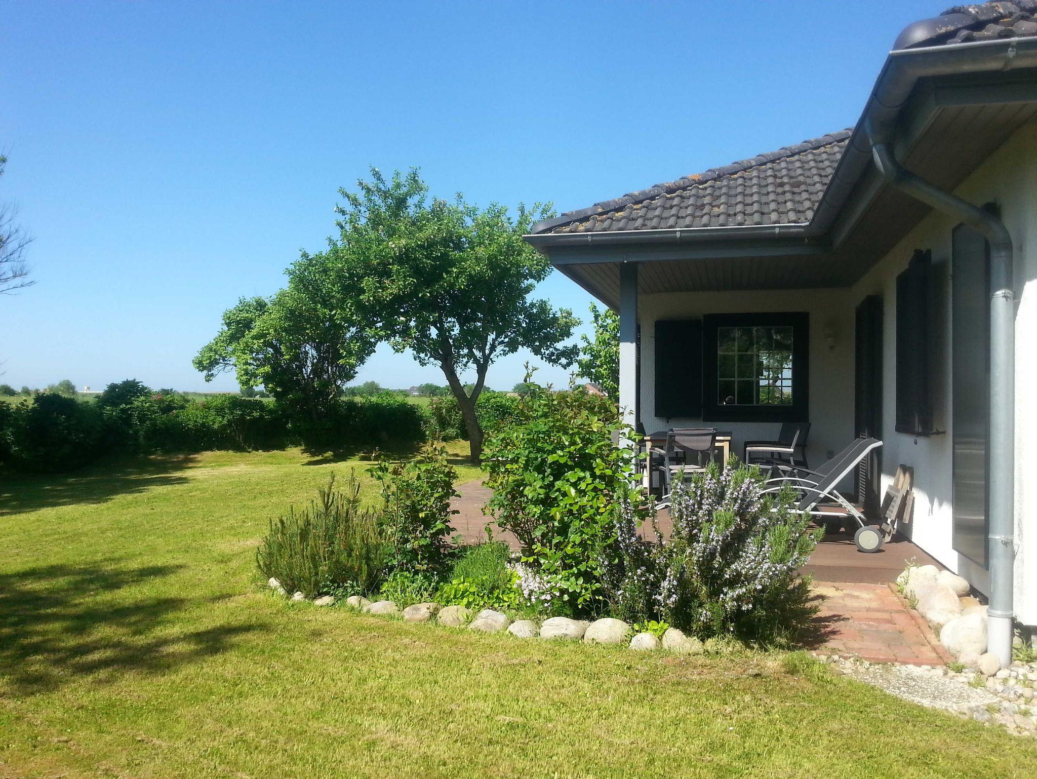Die 20 m² große Holzterrasse, vollmöbliert inkl. Strandkorb befindet sich in einem traumhaften Garten und bietet Zugang zu einer sonnigen Liegewiese, die nach Süden ausgerichtet ist. Von hier aus genießen Sie einen herrlichen Weitblick über die Felder bis hin zum Außendeich.