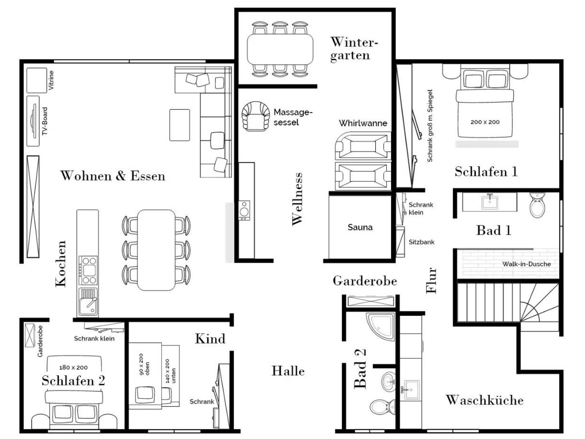 Um den Aufenthalt für bis zu sechs Personen so luxuriös wie möglich zu machen, ist die Wohnung mit Annehmlichkeiten wie Sauna, Whirlwanne, Regendusche, Walk-in-Dusche, Kamin und Wintergarten ausgestattet. Aber auch allerhand technischen Rafinessen wie einem Dampfgarer, ein Induktionsherd, ein Waschtrockner oder mehreren Flat-TVs gehören zur umfangreichen Ausstattung. Der moderne Grundriss mit ausreichendem Platzangebot sorgt für großzügiges und entspanntes wohnen im Urlaub.