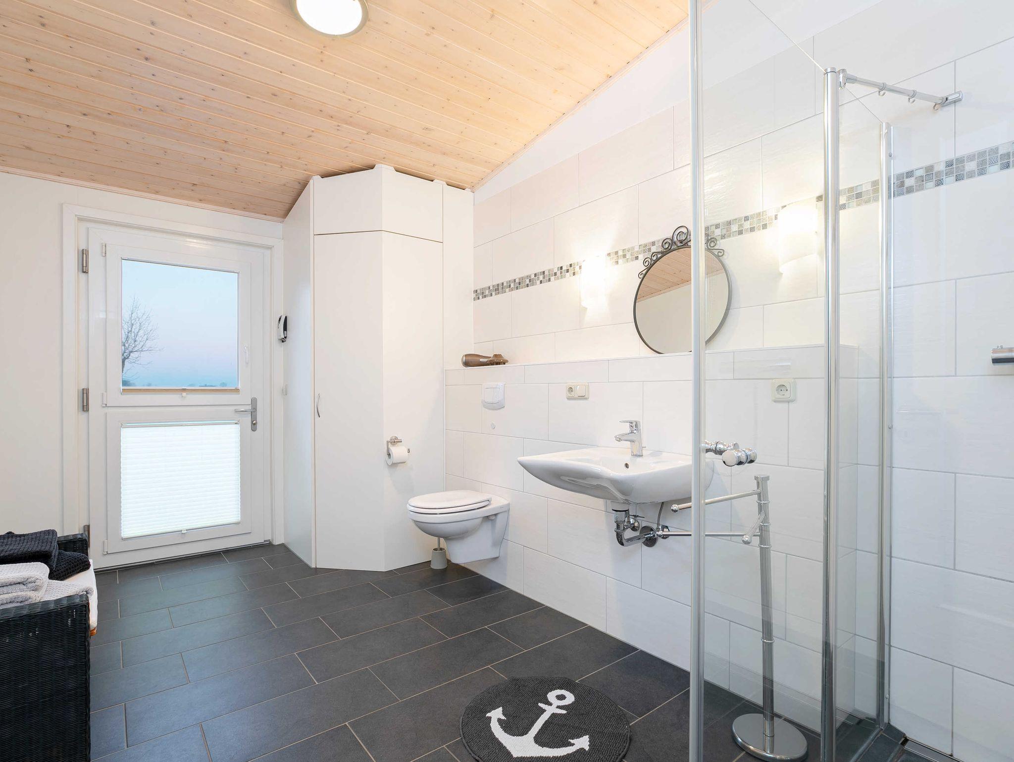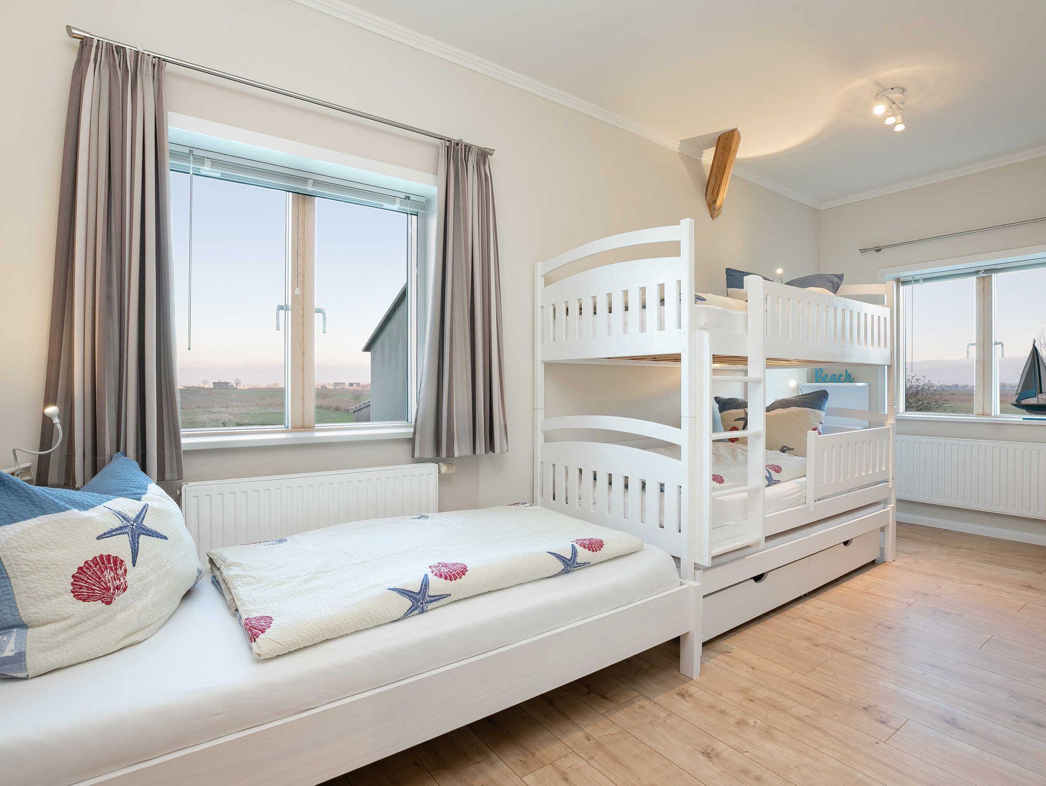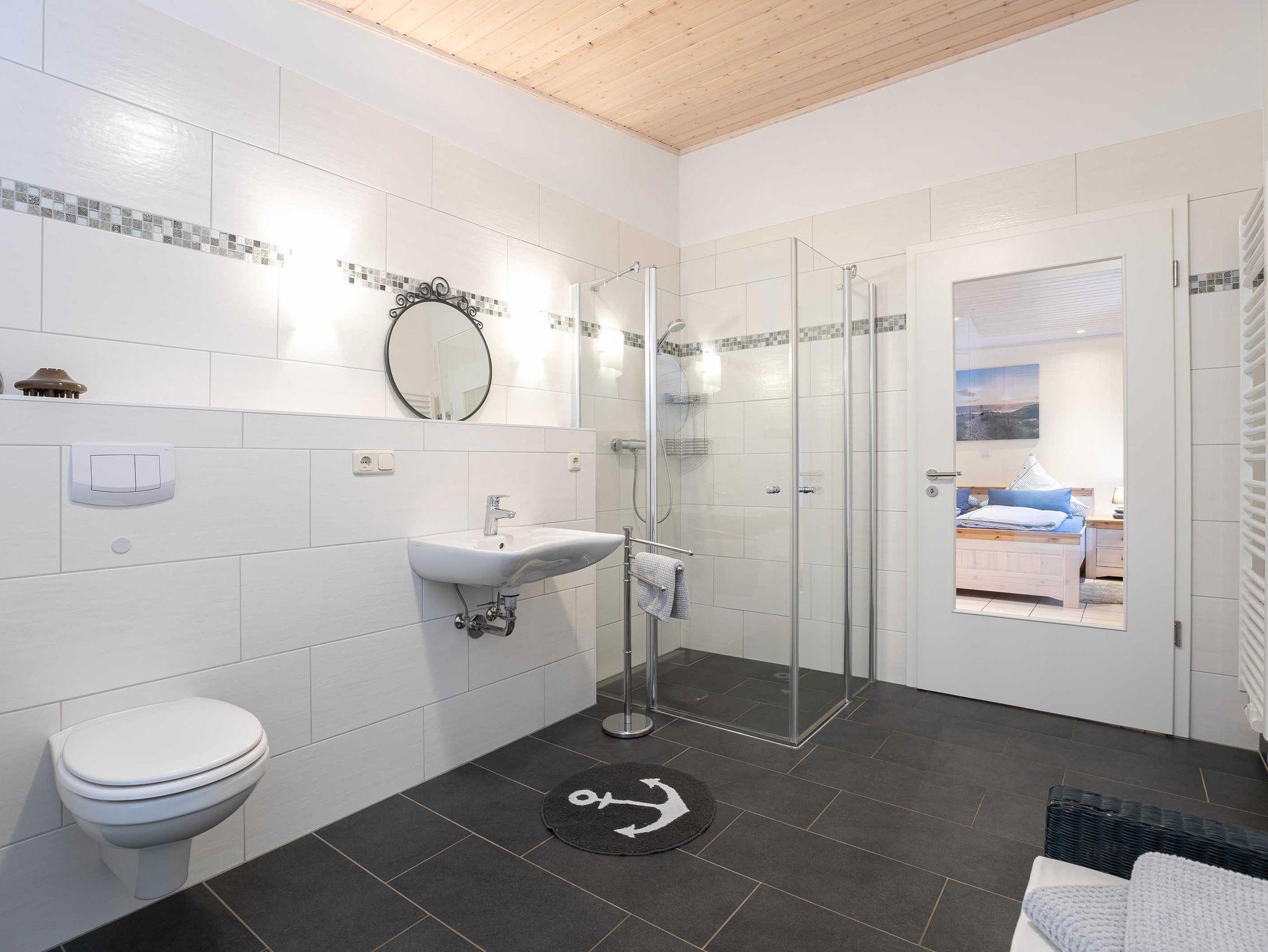Hier ist alles im modernen Landhausstil in den Farben grau/weiß eingerichtet und mit maritimen Accessoires gestaltet.