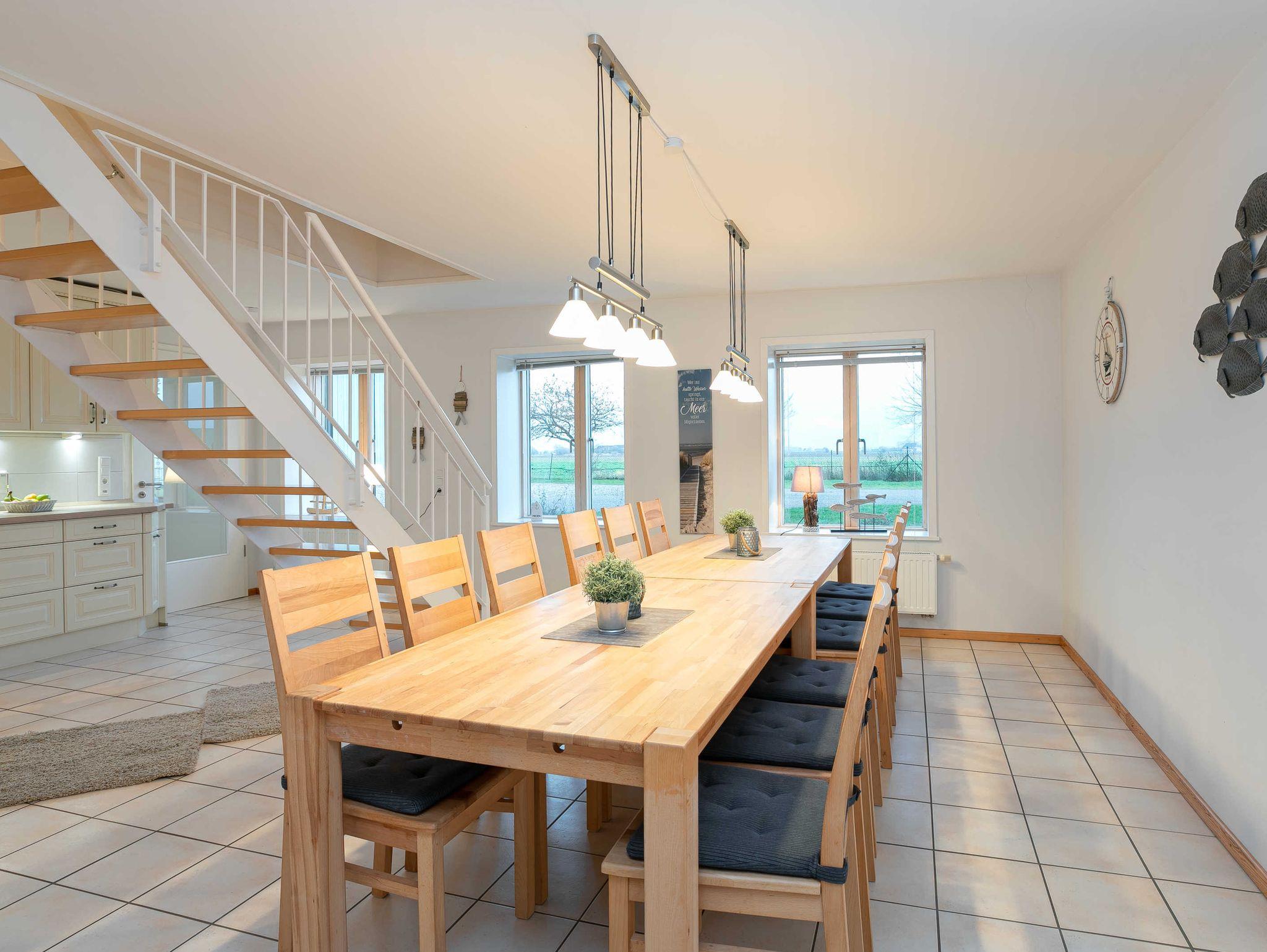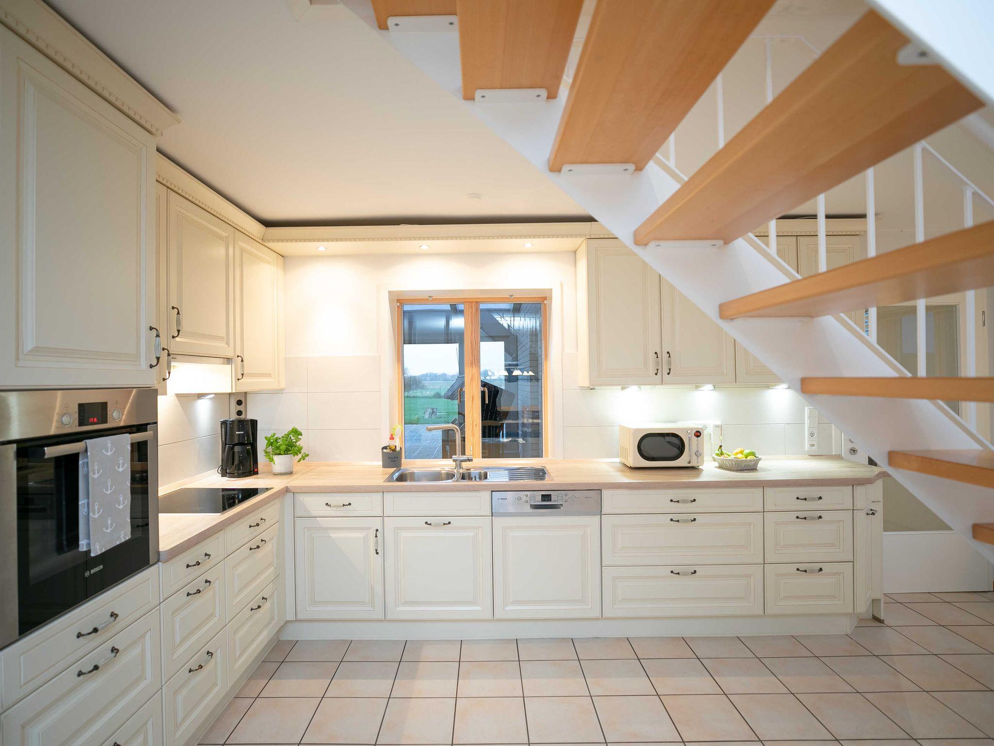 Du betrittst die Wohnung von der Westseite über den Eingangsflur/die Waschküche in die anschließend großzügige komplett ausgestattete Landhausküche, ausgestattet mit 2 massiven Esstischen und dazugehörigen Stühlen (Kernbuche) für 12 Personen.