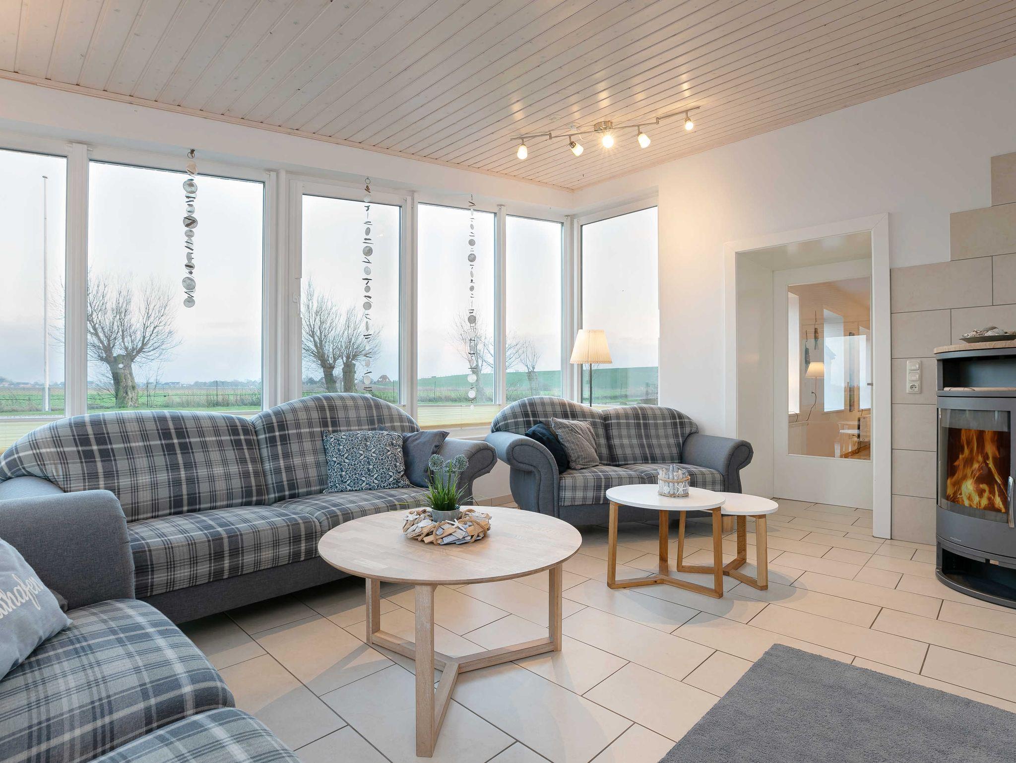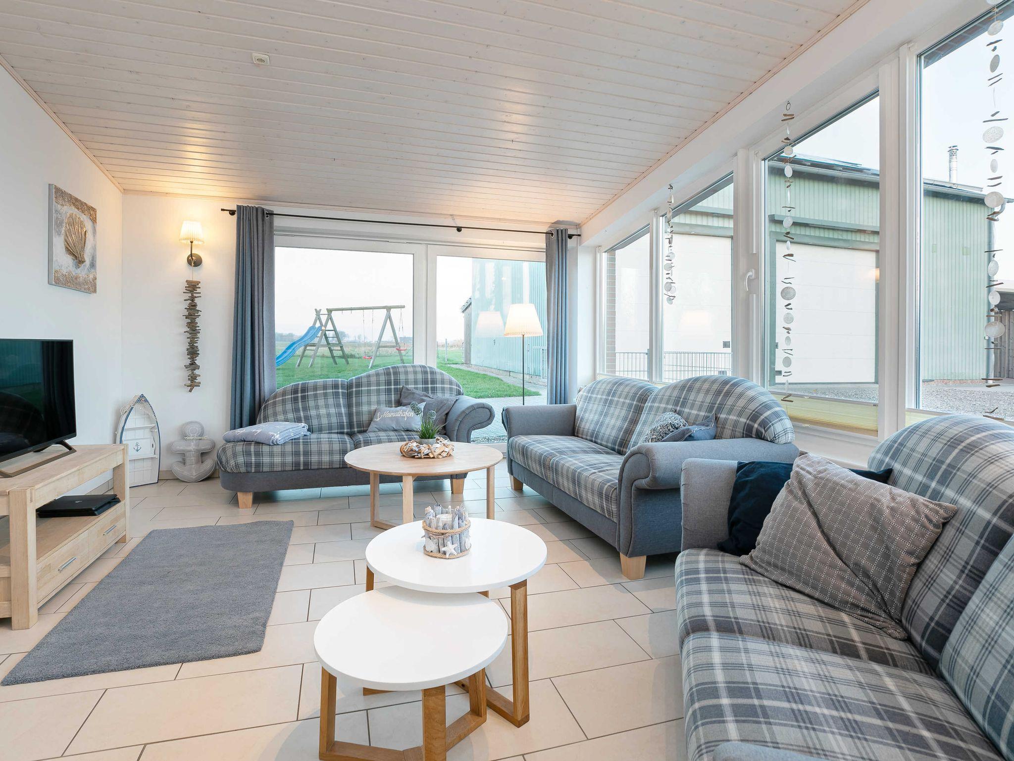 Von der Küche aus kannst Du es Dir auf blau/grau gehaltenen Polstermöbeln im Wintergarten gemütlich machen. Hier findest Du einen tollen Kaminofen,ein Flachbild TV und den direkten Zugang zum überdachten Freisitz mit einer großen Loungegarnitur. Das Erdgeschoss bietet außerdem ein barrierefreies Schlafzimmer (weiß/antik eingerichtet) mit angrenzendem ebenfalls barrierefreien modernem Duschbad.