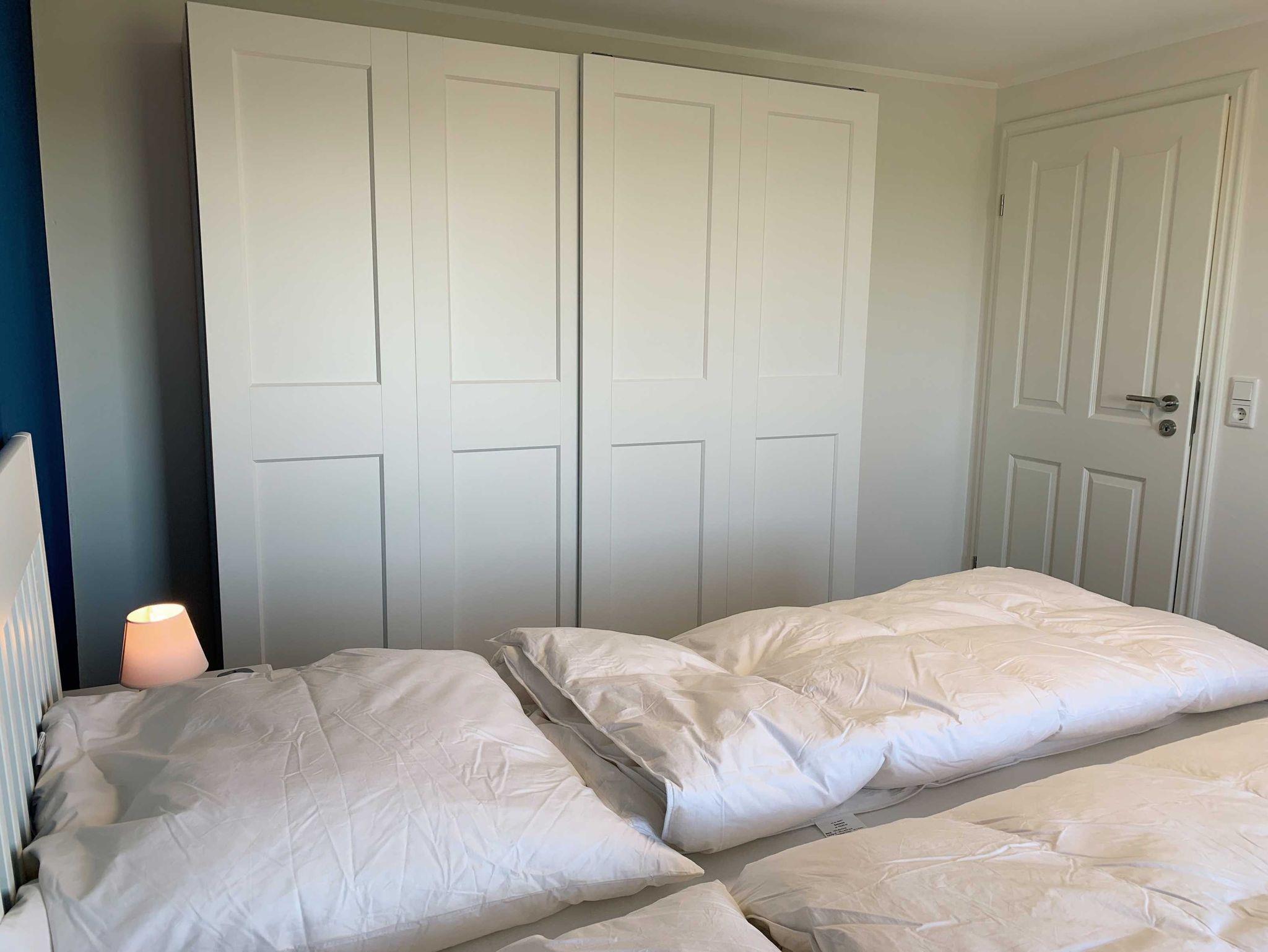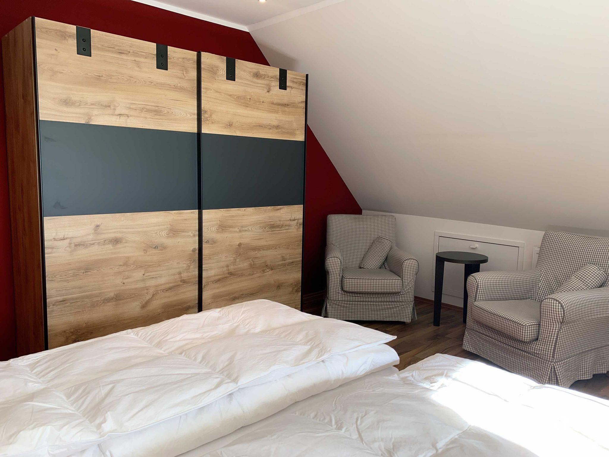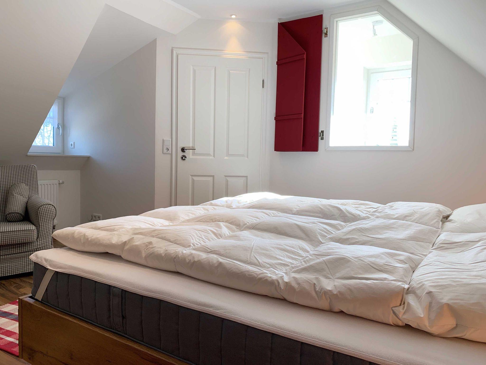 Im Obergeschoss befindet sich ein drittes großes Schlafzimmer mit 180cm Doppelbett und eine kleine Ecke um für sich zu sein. Zum Haus gehört ein Stellplatz und ein abschließbarer Schuppen, in dem Fahrräder sicher untergebracht werden können.