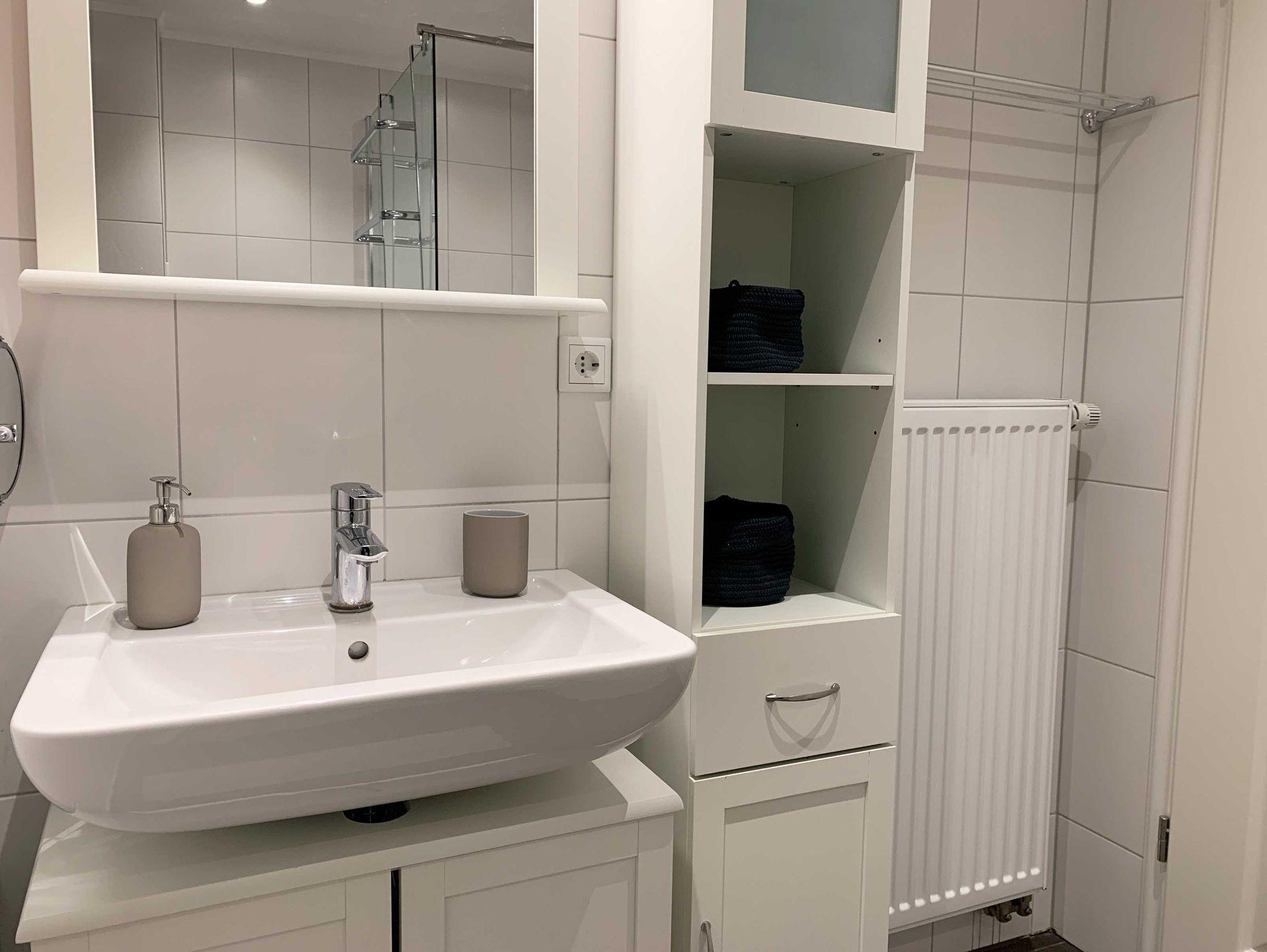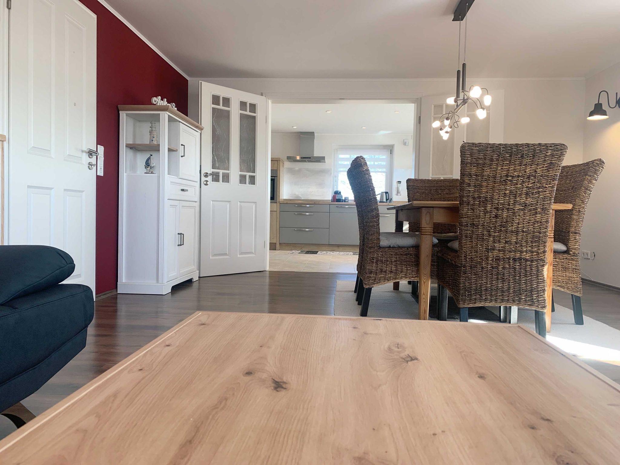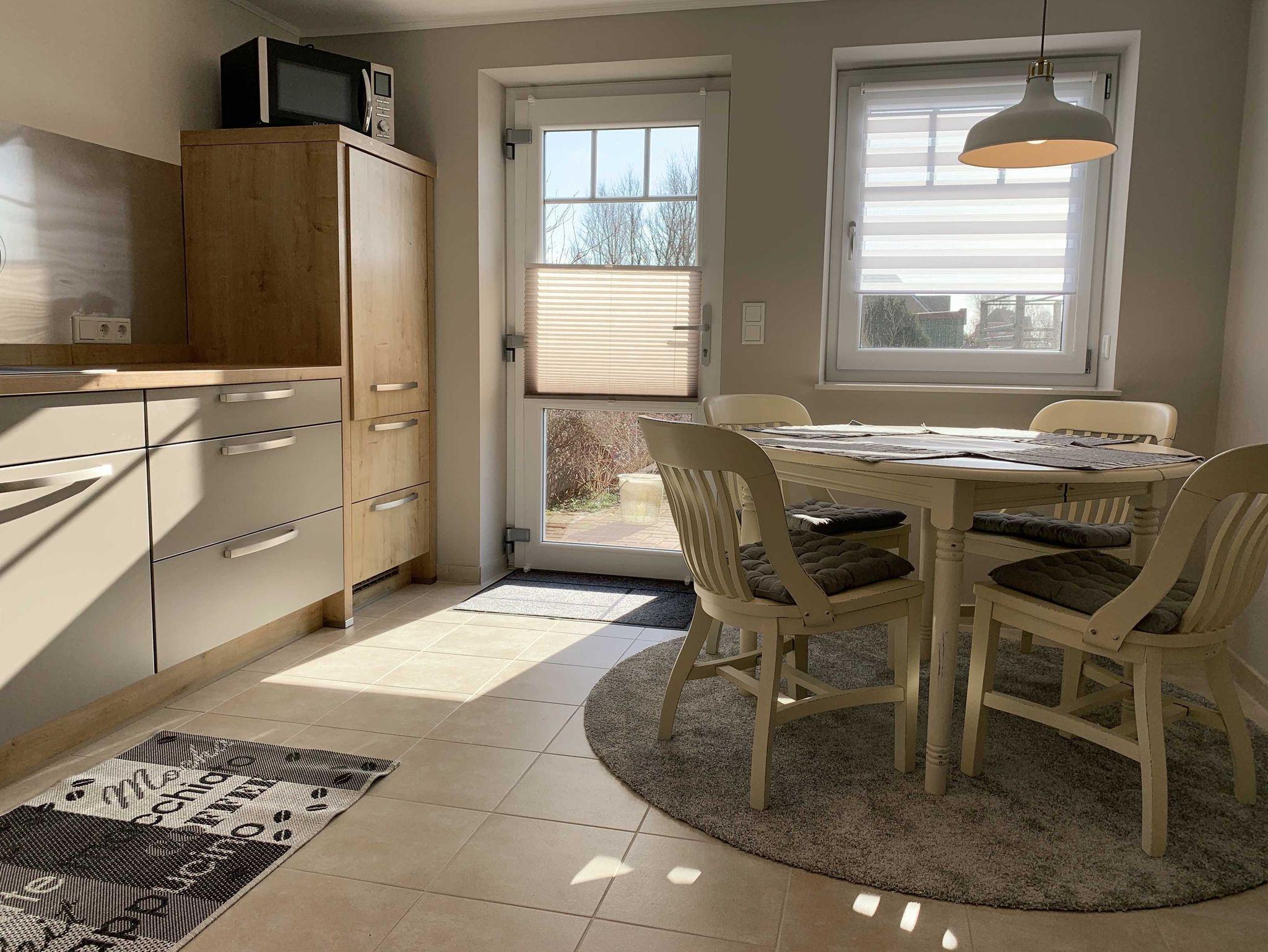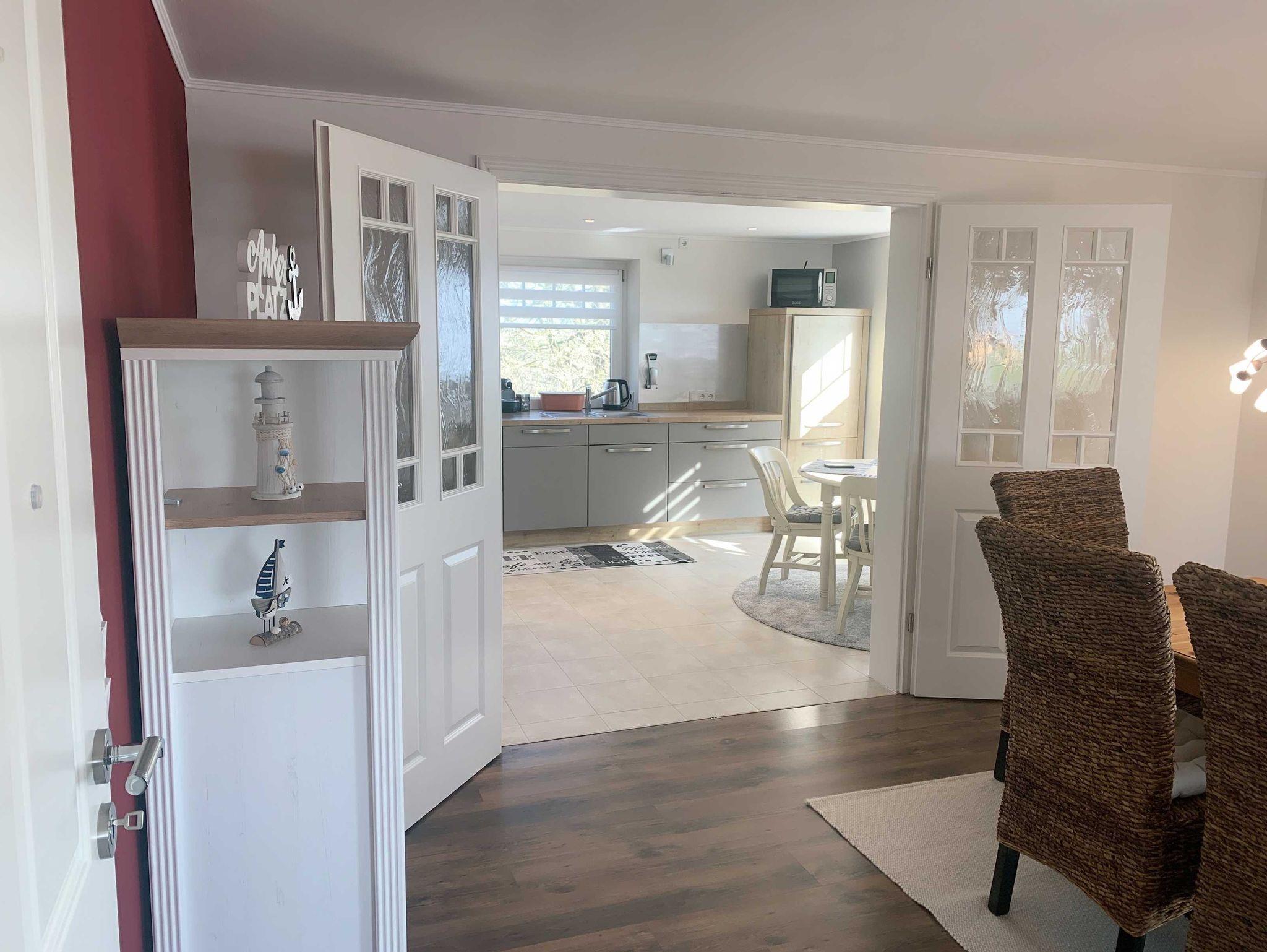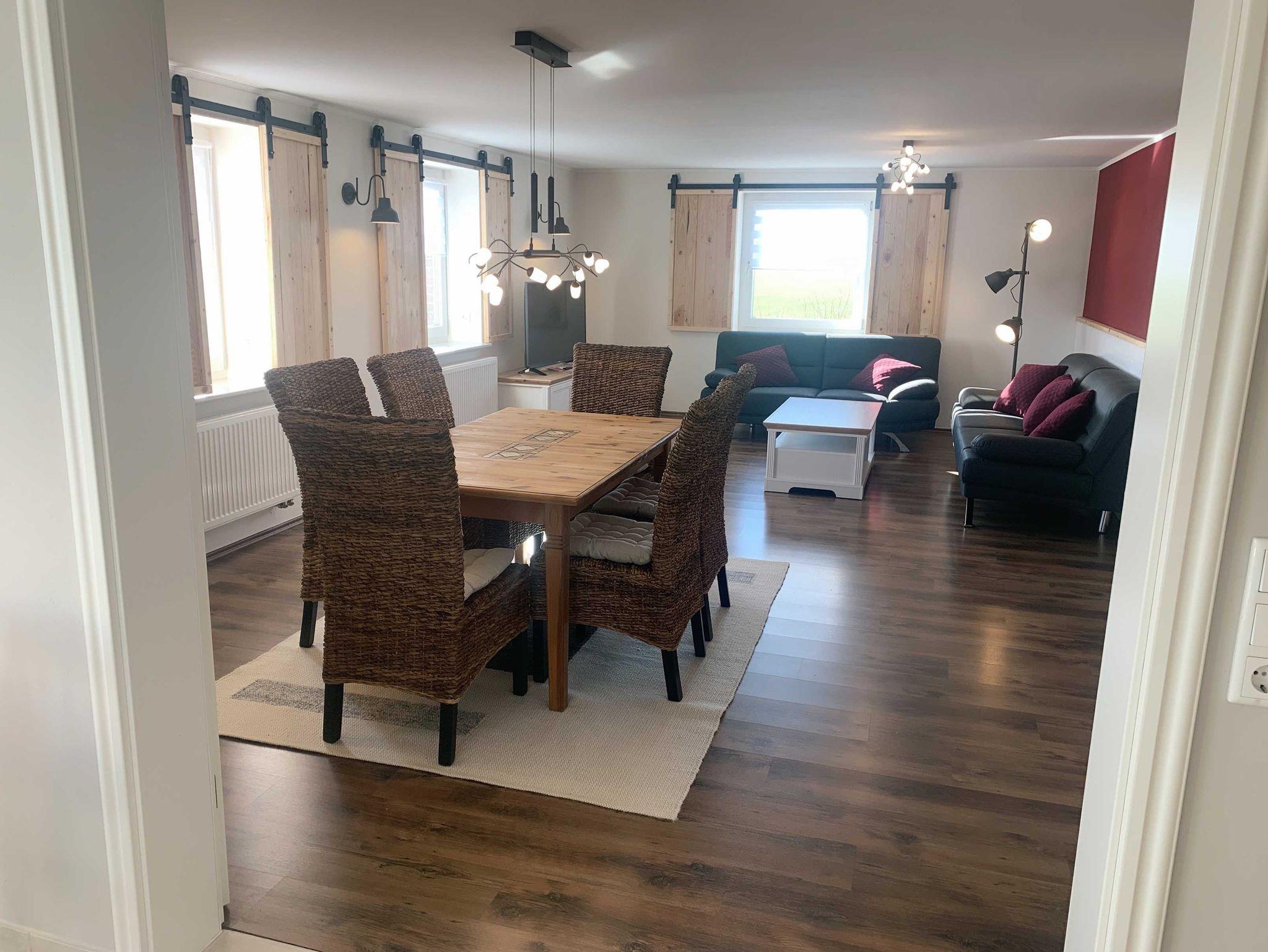 Das 120qm große, frisch renovierte Huus Veerundsüsti, zentral auf dem Osterdeich gelegen, ist für bis zu 5 Personen geeignet. Im Erdgeschoss ist das große, lichtdurchflutete Wohnzimmer mit Essecke und wunderschönem Blick auf die Felder und Natur Nordstrands. Mit Flügeltür verbunden ist die große vollausgestattete Küche, die sowohl separat, als auch eine offene Küche sein kann - so wie es eben beliebt Von dort aus gelangt man direkt auf die möblierte Sonnenterrasse mit eigenem Strandkorb. Weiterhin sind im Erdgeschoss 2 Schlafzimmer, eines mit Französischem Bett (160cm) und eines mit 80cm Schlafcouch, welche sich auf die doppelte Größe ausziehen lässt. Auch das Duschbad befindet sich unten.