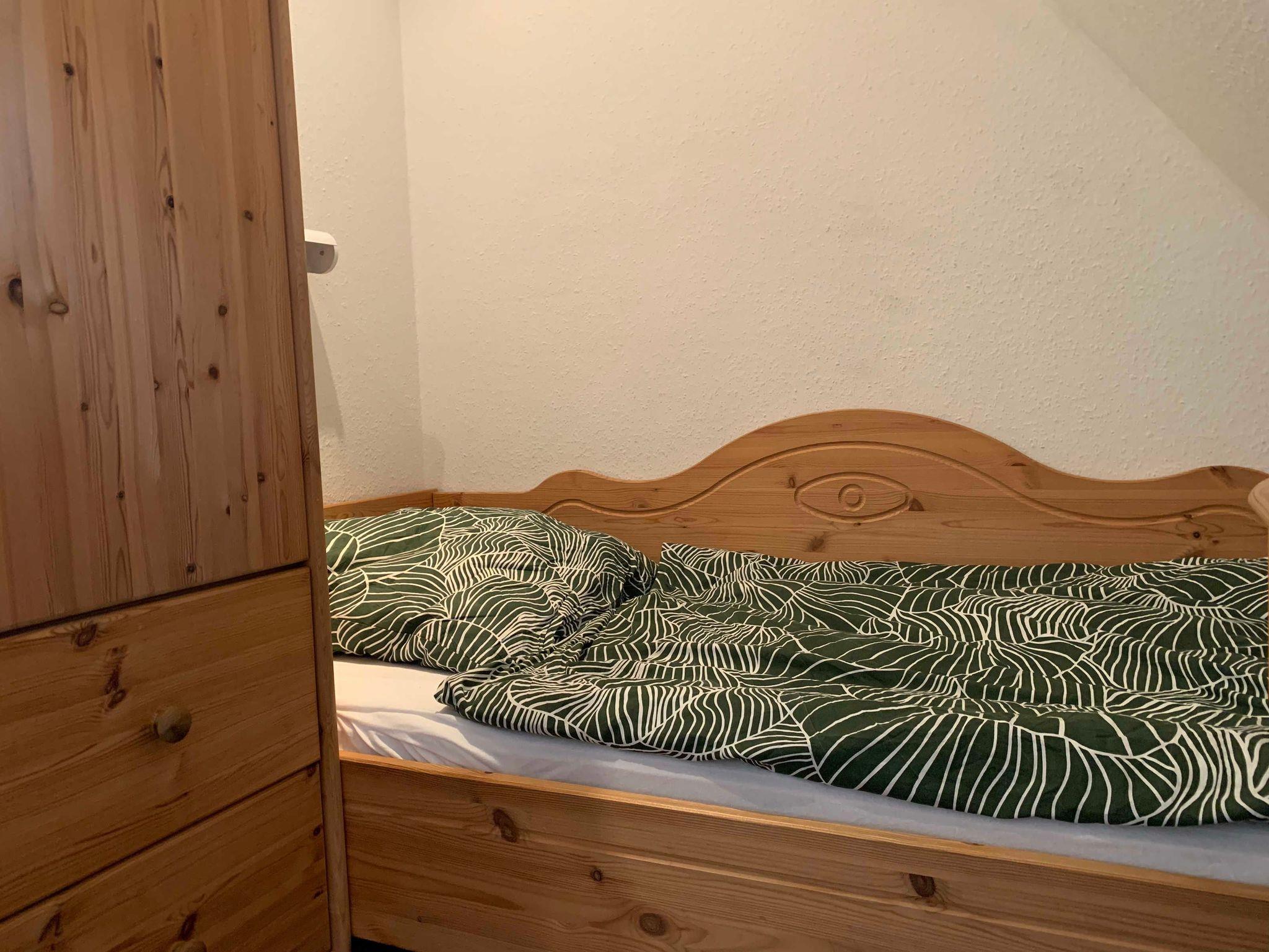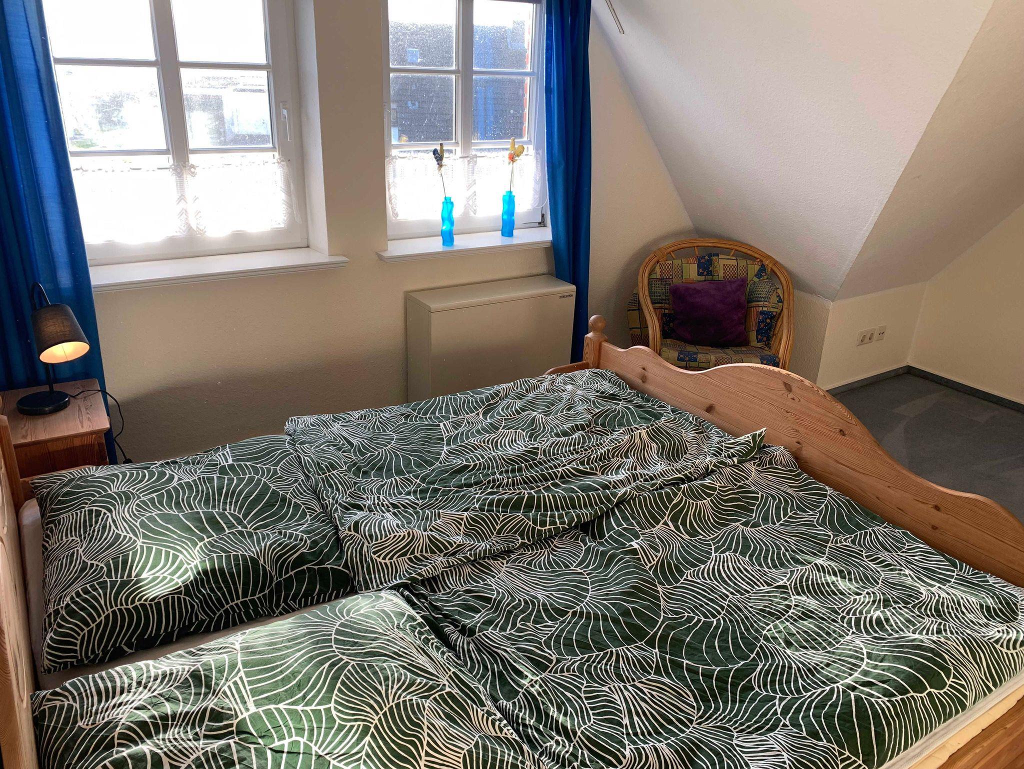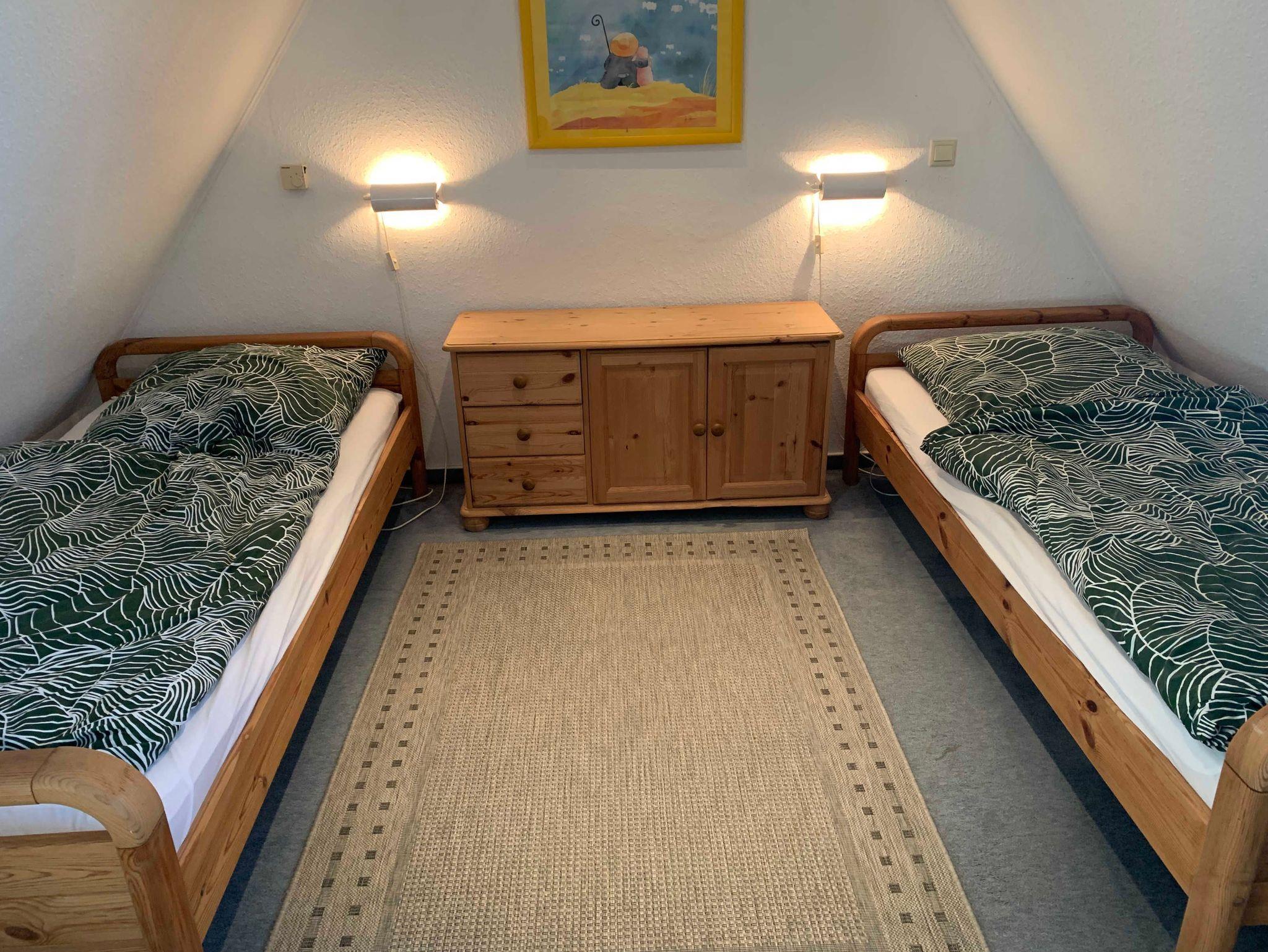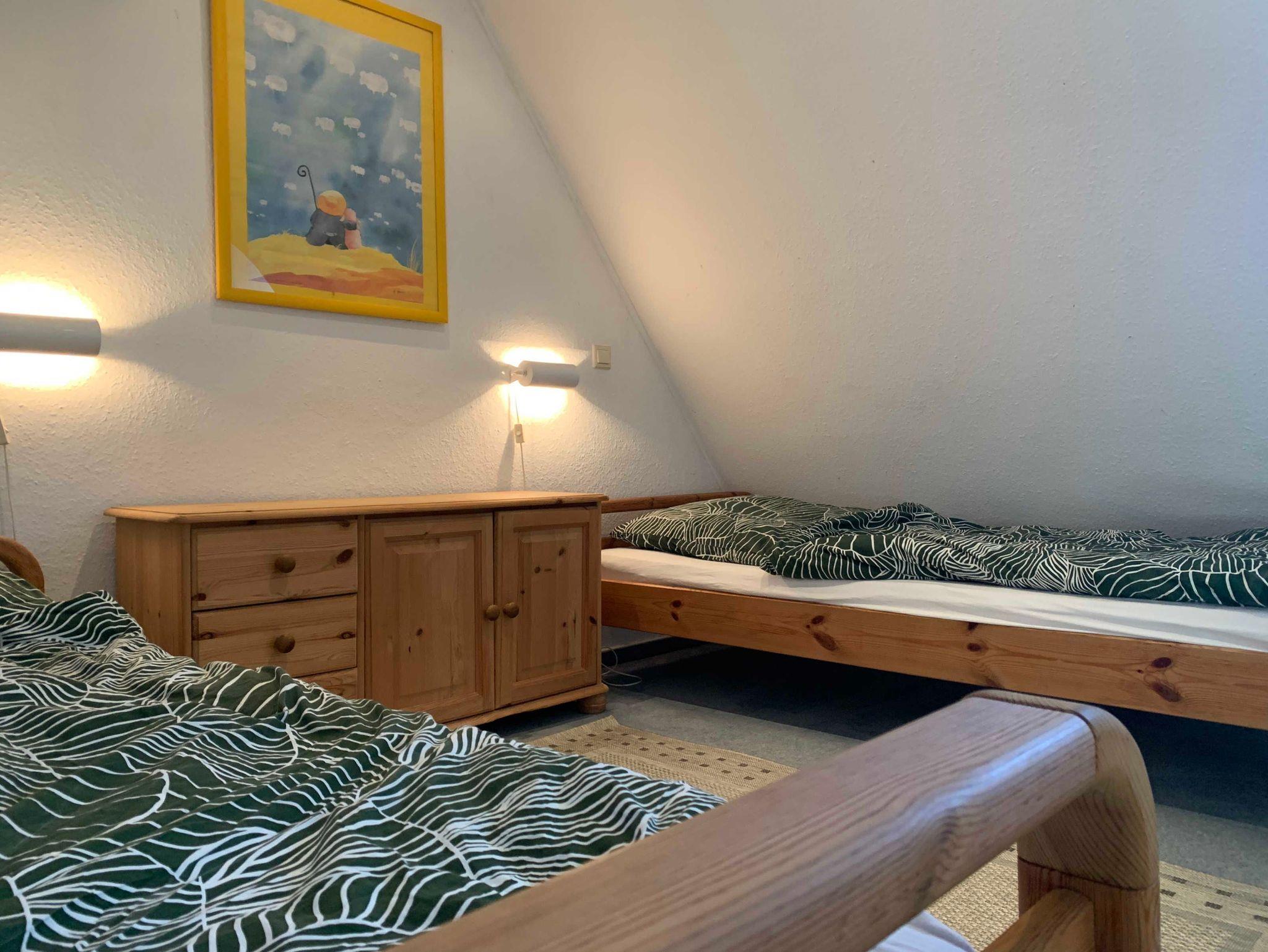 Im Obergeschoss befinden sich zwei gemütliche Schlafzimmer: eines mit Doppelbett und eines mit zwei Einzelbetten. Ebenfalls auf dieser Etage liegt das Badezimmer mit Dusche und WC. Ein weiteres Highlight ist das offene Giebelzimmer im Dachgeschoss, das als Galerie ausgebaut wurde und zwei weitere Einzelbetten bietet.
