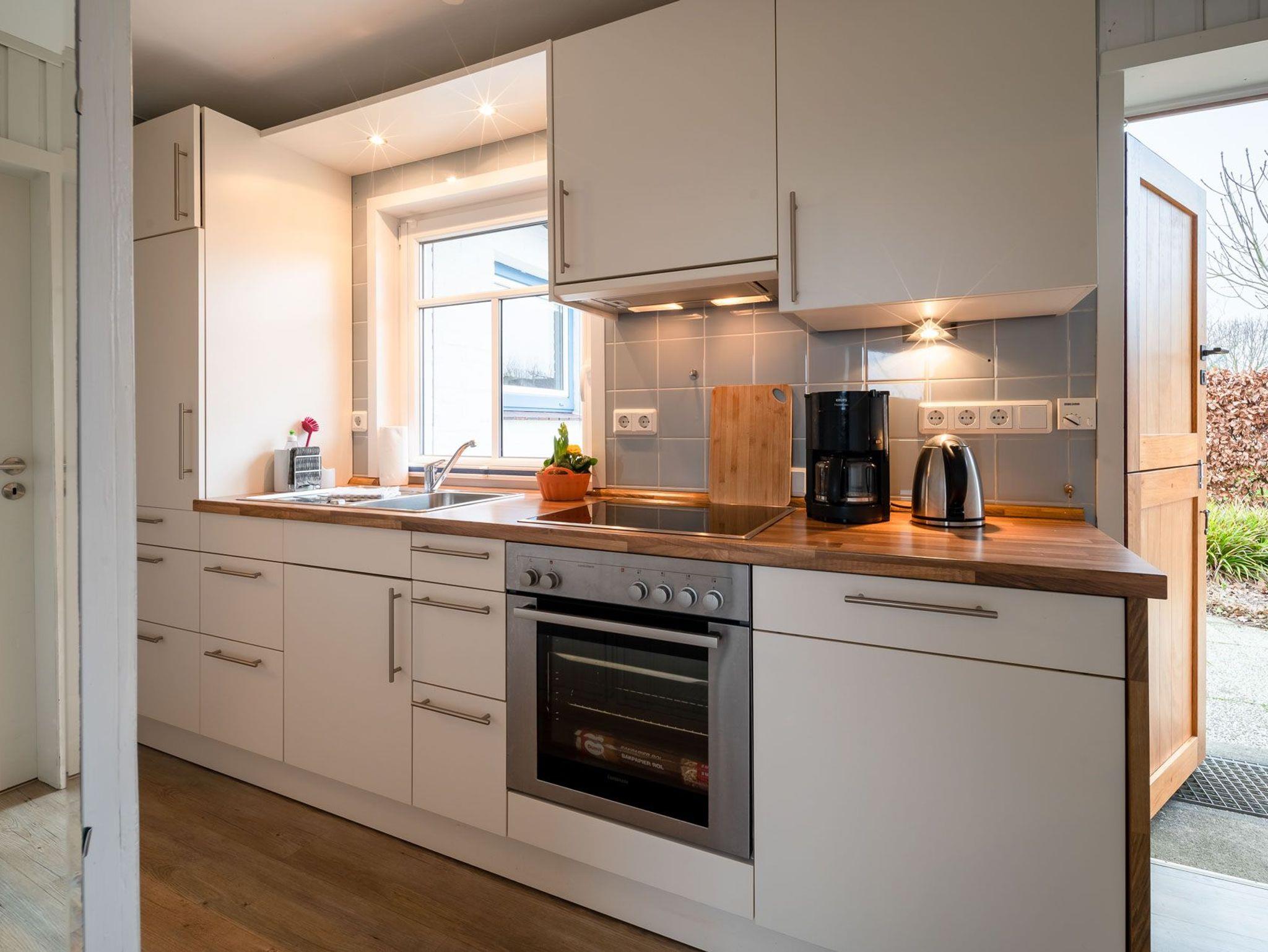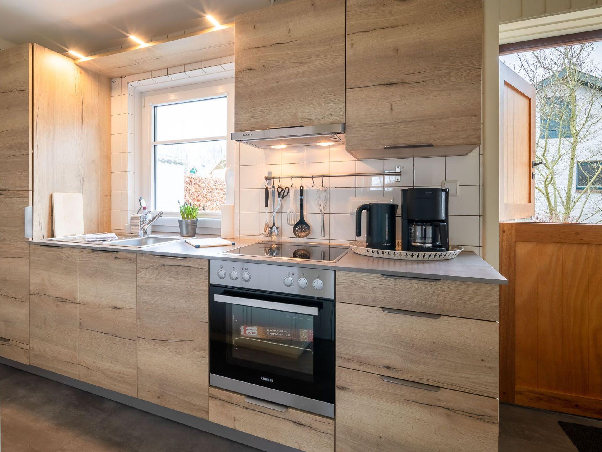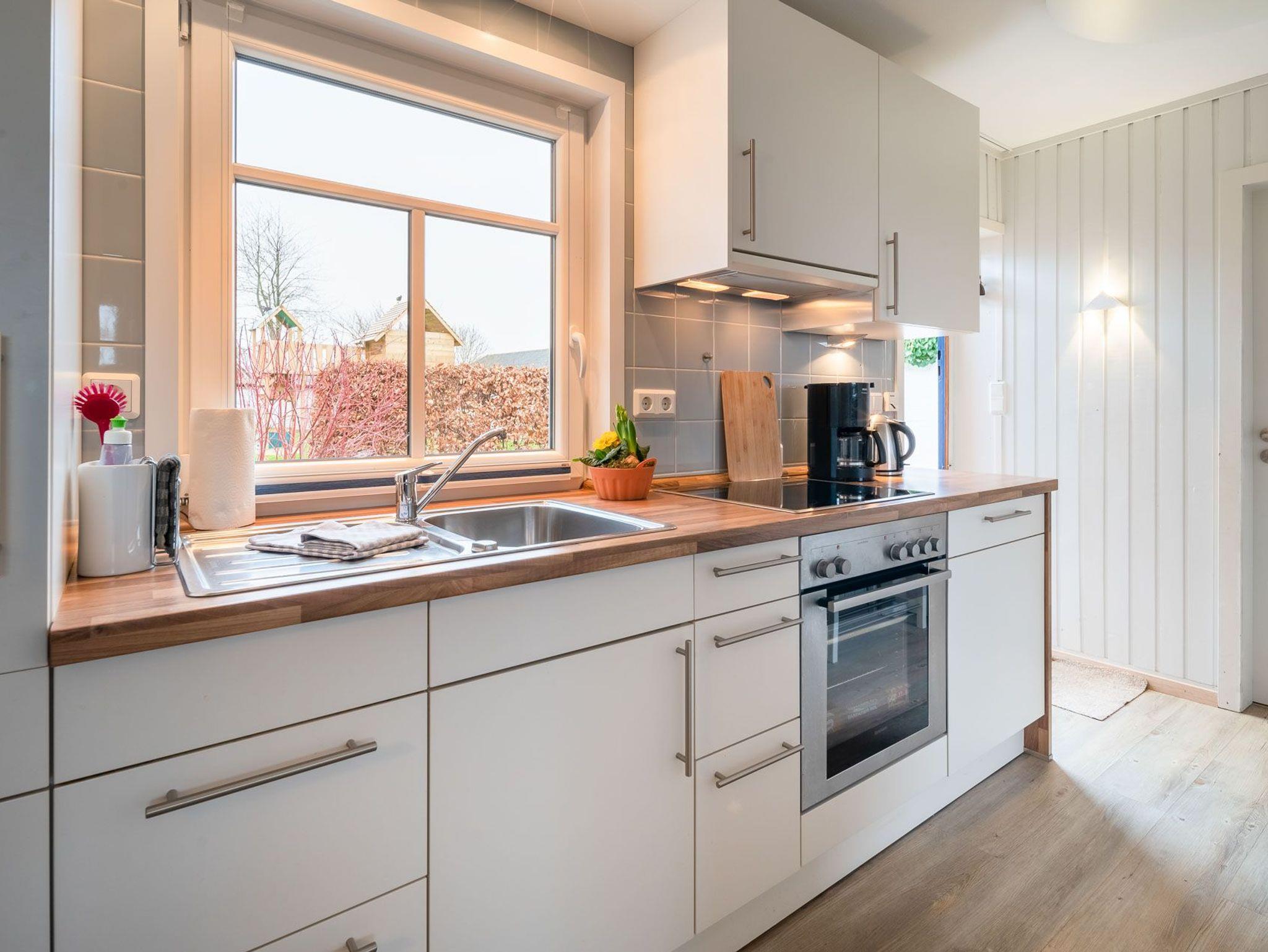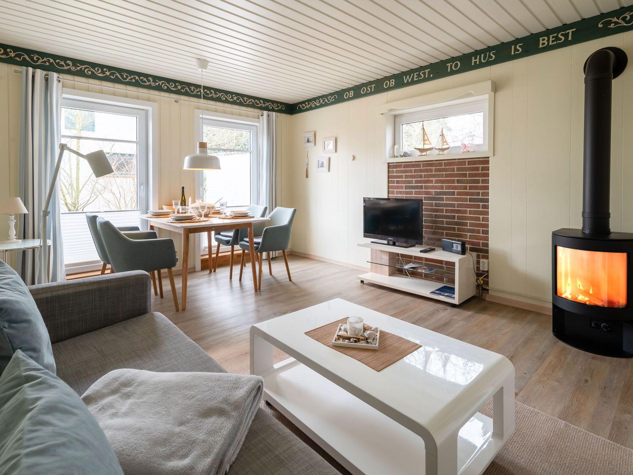 Erleben Sie einen erholsamen Urlaub in Haus Kai, einem eingeschossigen Ferienhaus für bis zu 4 Personen. Das Haus verfügt über ein Wohnzimmer, zwei Schlafzimmer, eine Küche und ein Duschbad. Ein Gaskaminofen im Wohnzimmer sorgt für wohlige Wärme. Die Einbauküche ist mit Herd/Ceranfeld, Backofen, Spülmaschine, Kaffeemaschine, Wasserkocher und Toaster ausgestattet.