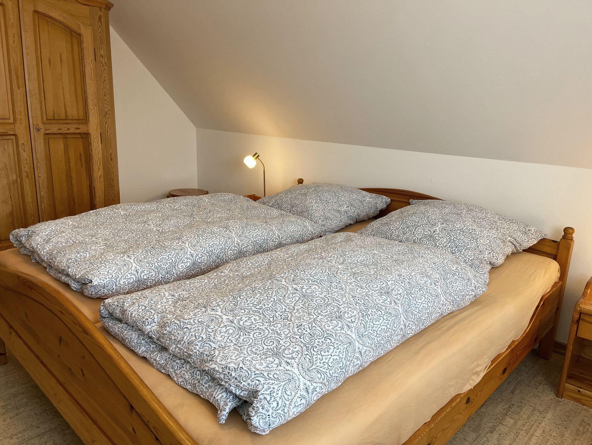 Die Fewo 2 ist ausgestattet für zwei Personen mit einem Schlafzimmer (1,8 x 2 m) und einem großzügigen Wohn/Esszimmer, sowie einer Küchenzeile und Duschbad. Die Wohnung liegt im zwar im 1. Stock, dennoch ist eine Terrasse samt Standkorb im Garten vorhanden.