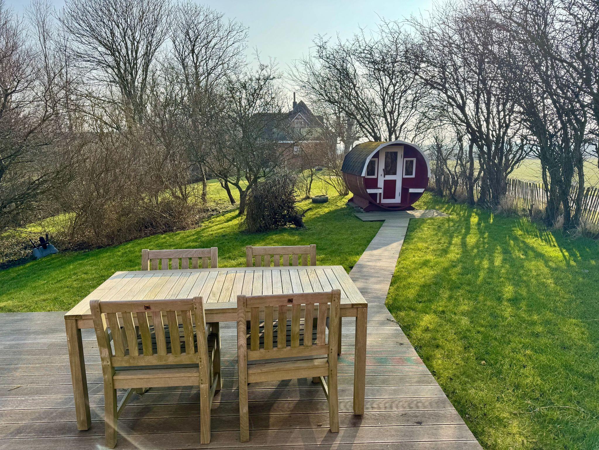 Die sonnige Terrasse lädt mit eleganten Gartenmöbeln, einem Grill und einem Strandkorb zum Verweilen und Genießen der frischen Luft ein. Das Highlight des Gartens ist die Fasssauna, die kostenfrei zur Verfügung steht.