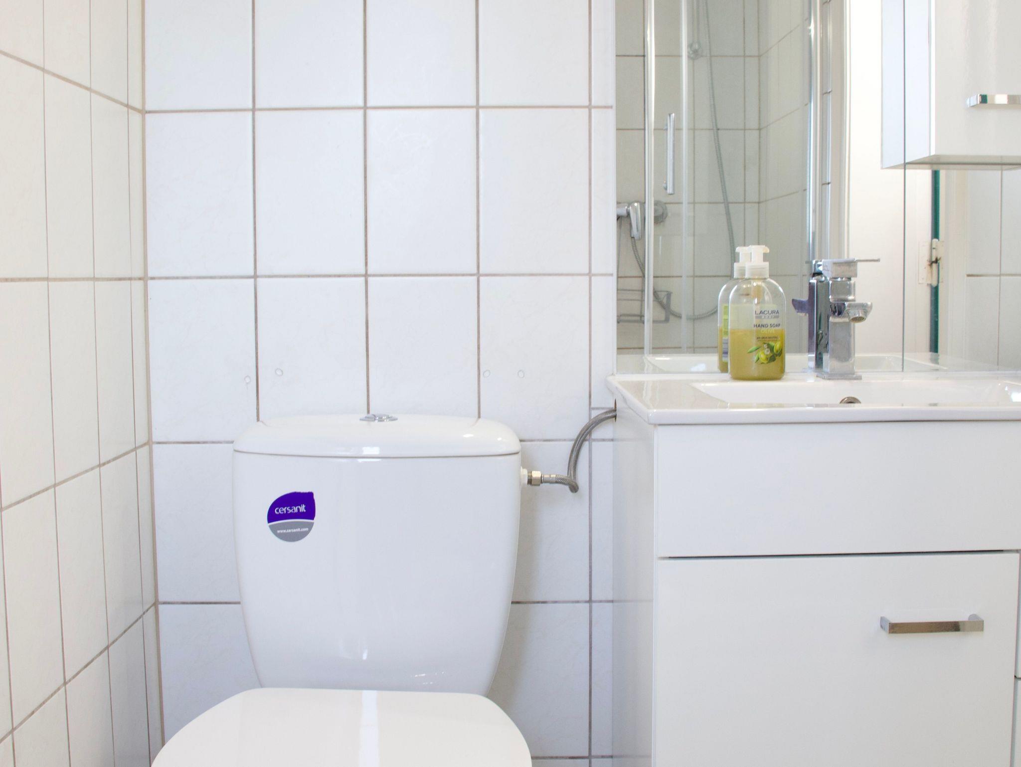 Die Wohnküche bildet den Mittelpunkt der Wohnung. Der Esstisch steht direkt am Fenster und ermöglicht einen freien Blick nach draußen, sodass Mahlzeiten stets von der Küstenlandschaft und dem Meer begleitet werden. Die Küche lässt keine Wünsche für die Selbstversorgung im Urlaub offen und verfügt unter anderem über eine Kaffeemaschine sowie eine Gefriermöglichkeit. Von der Wohnküche aus gelangen Sie direkt in das helle und freundlich gestaltete Duschbad.