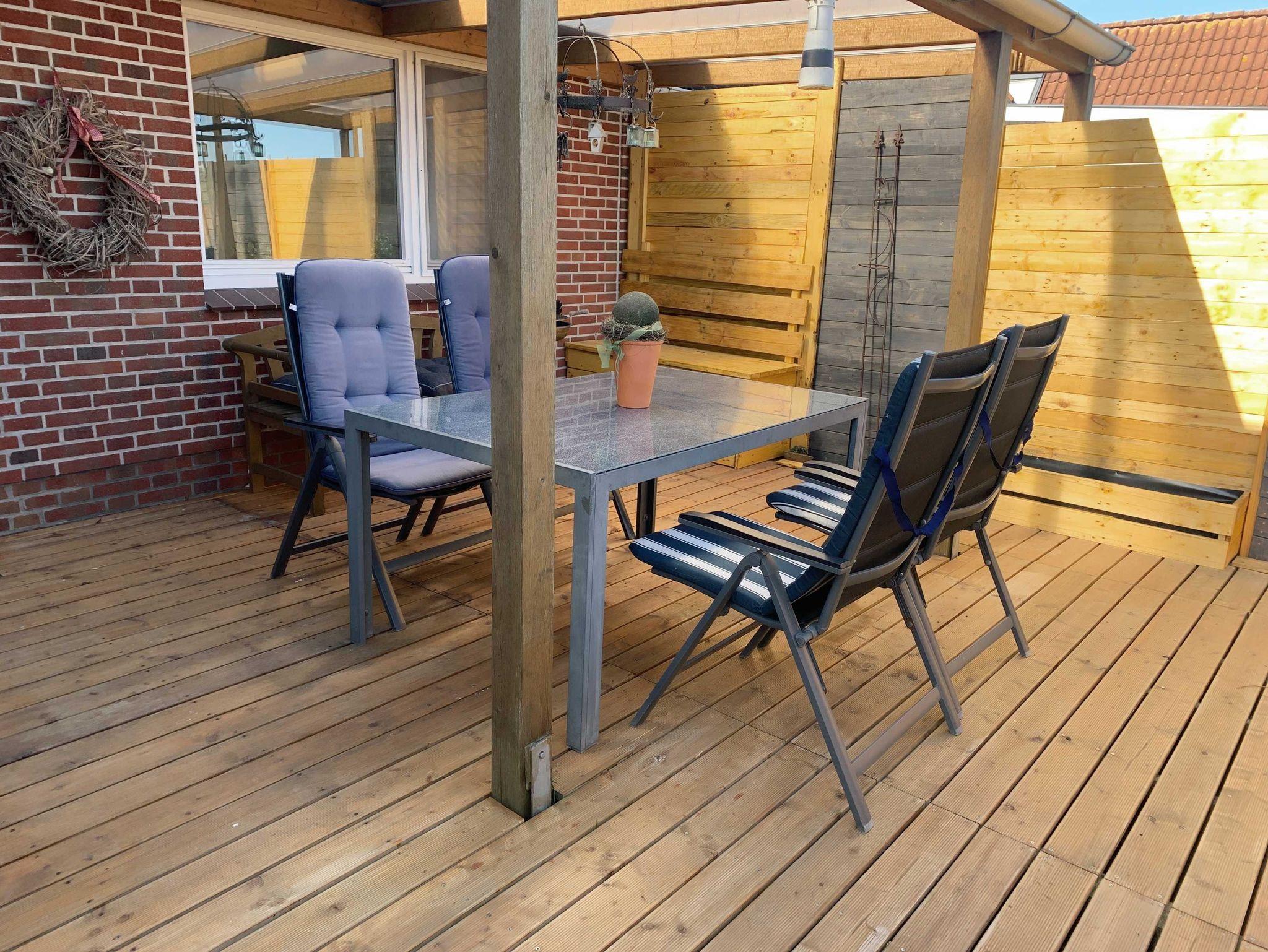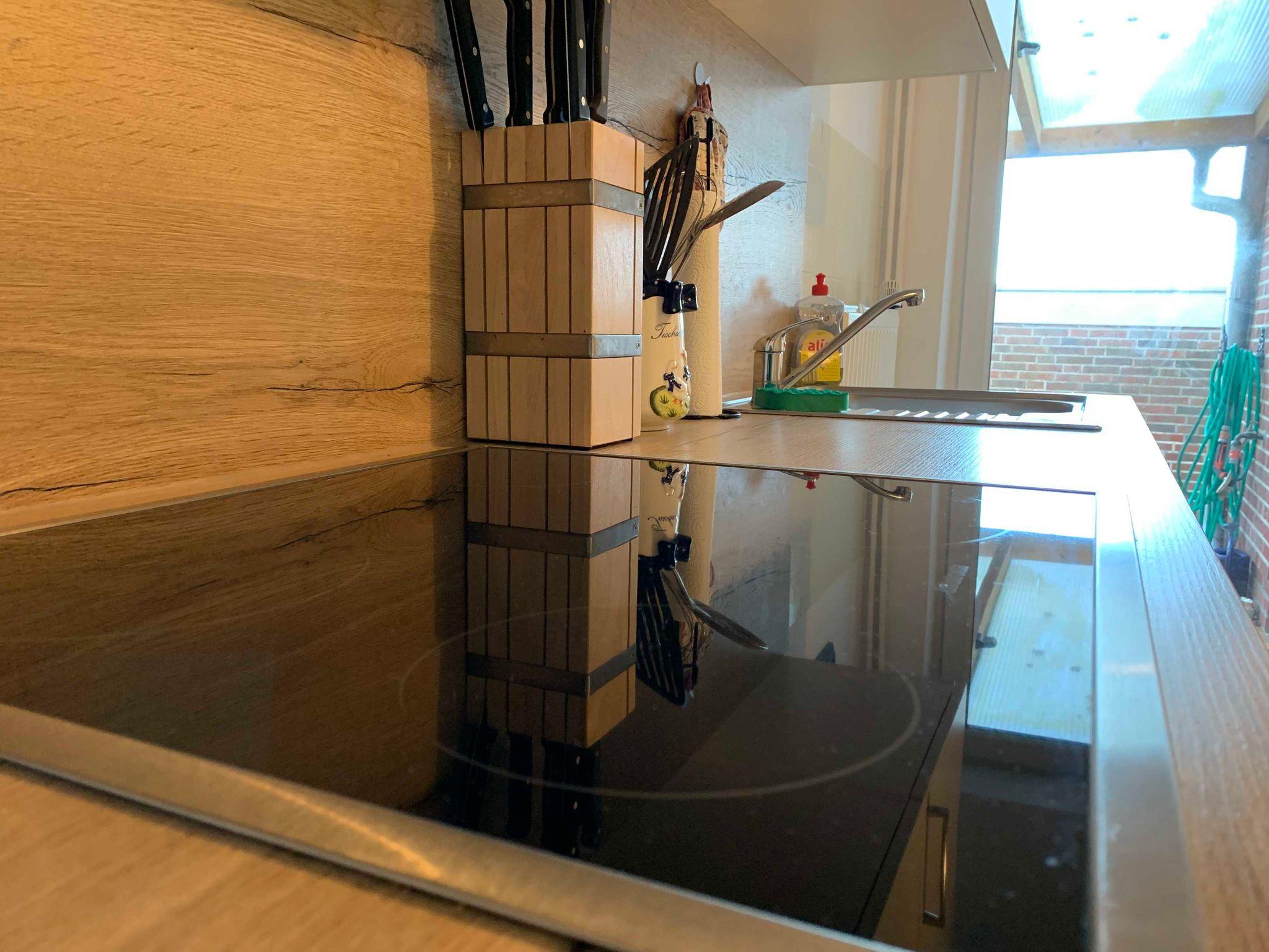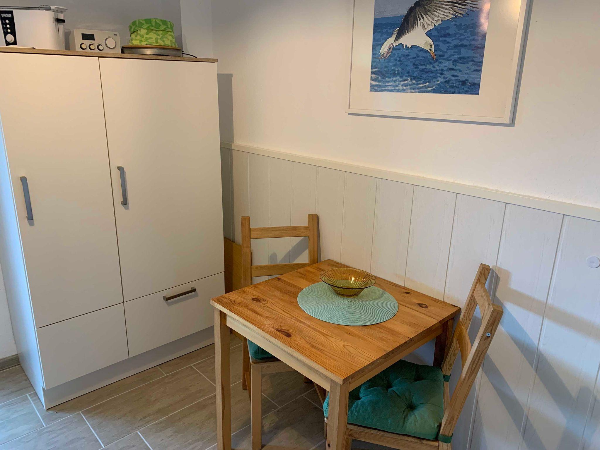 Das Wohnzimmer mit Essecke und Schreibtisch ist sehr geräumig und bietet einen Panoramablick auf die Felder und Wiesen Nordstrands. Die Küche, von der aus man auf die teilüberdachte Terrasse betreten kann, ist voll ausgestattet inklusive Backofen und Geschirrspüler.