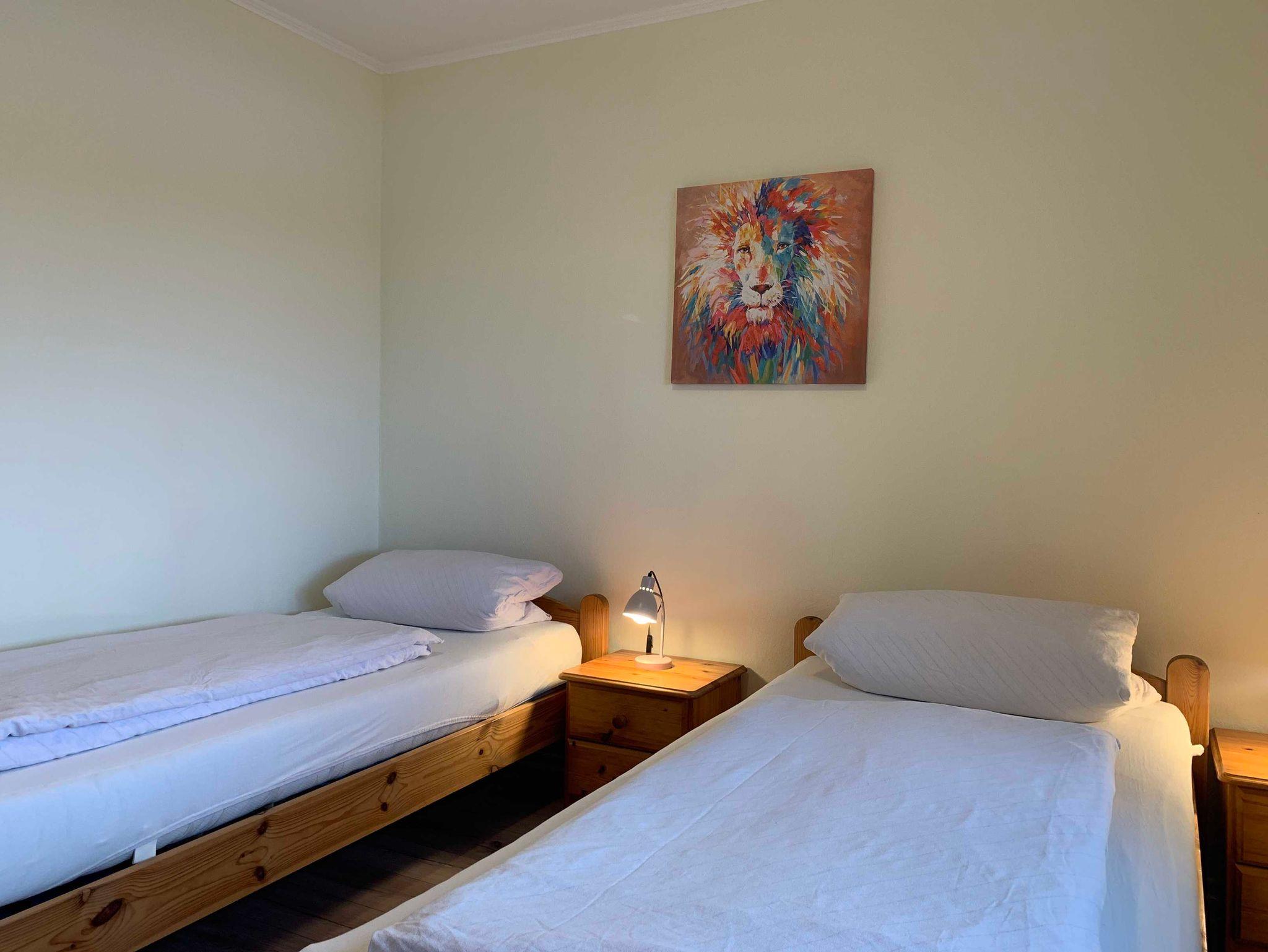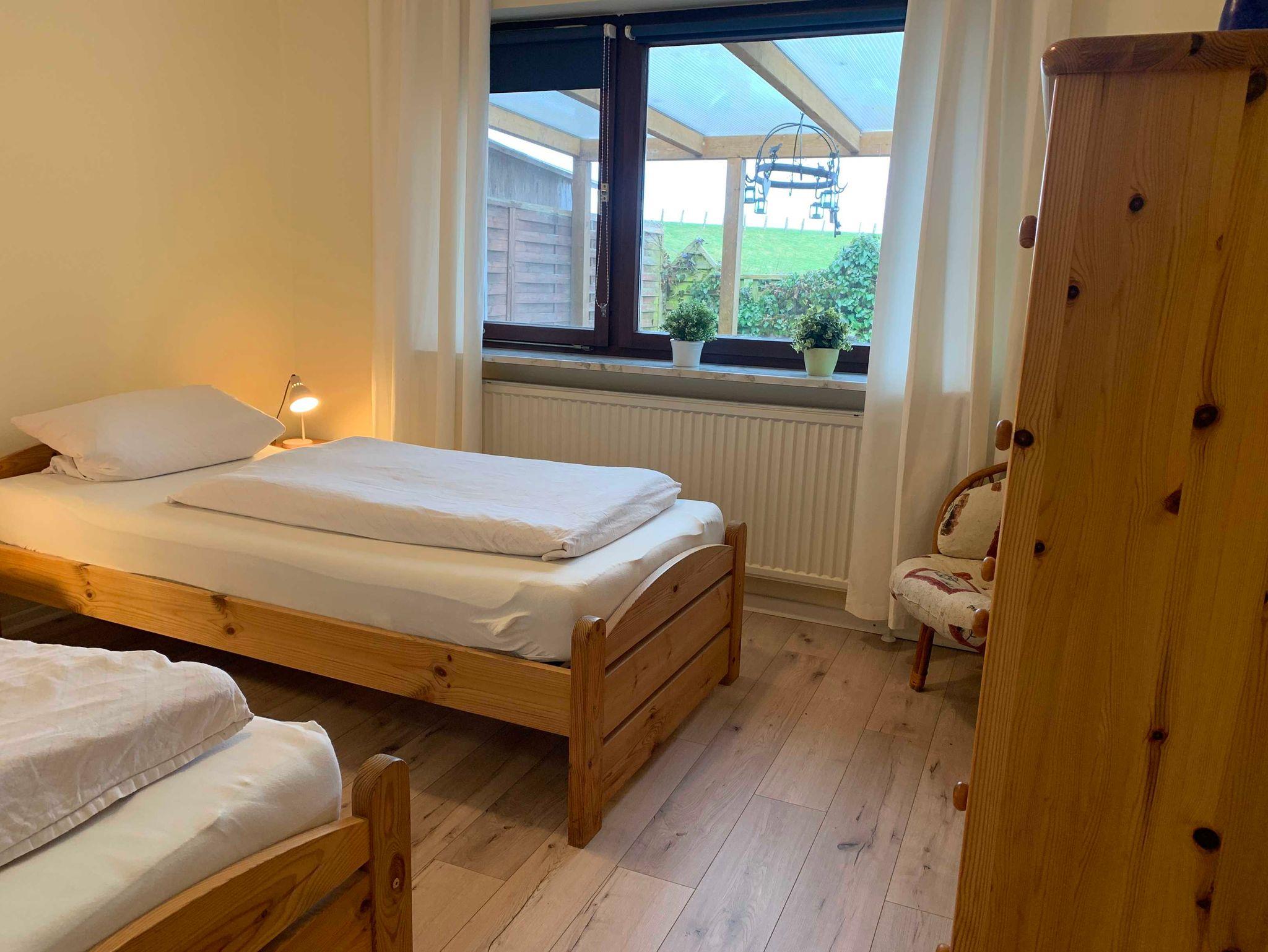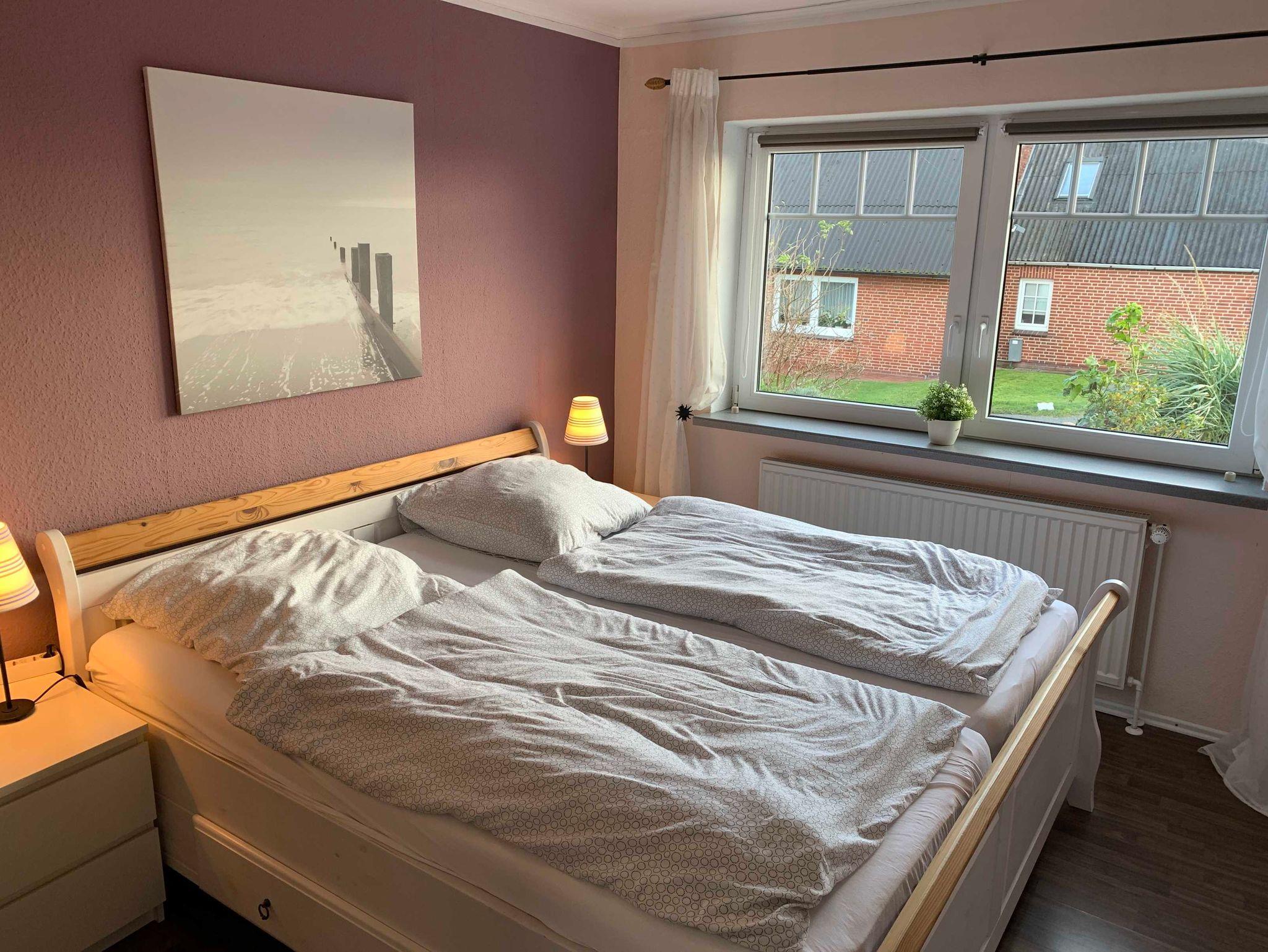 Unser Haus am Deich - Wohnung Deichblick, direkt am Nordstrander Aussendeich gelegen bietet Platz für bis zu 4 Personen. Die Erdgeschoßwohnung hat zwei Schlafzimmer, eines mit Doppelbett und eines mit zwei Einzelbetten.