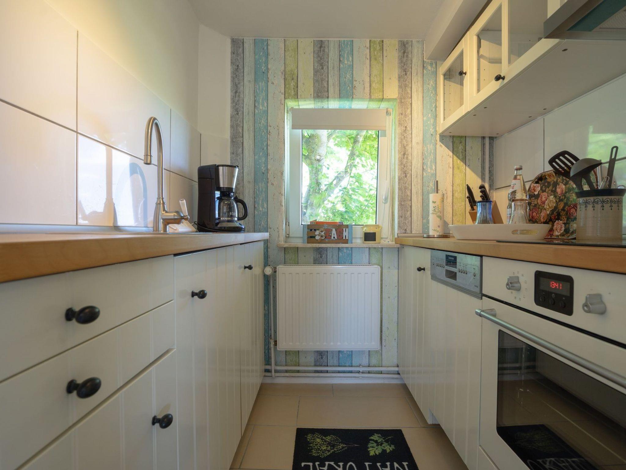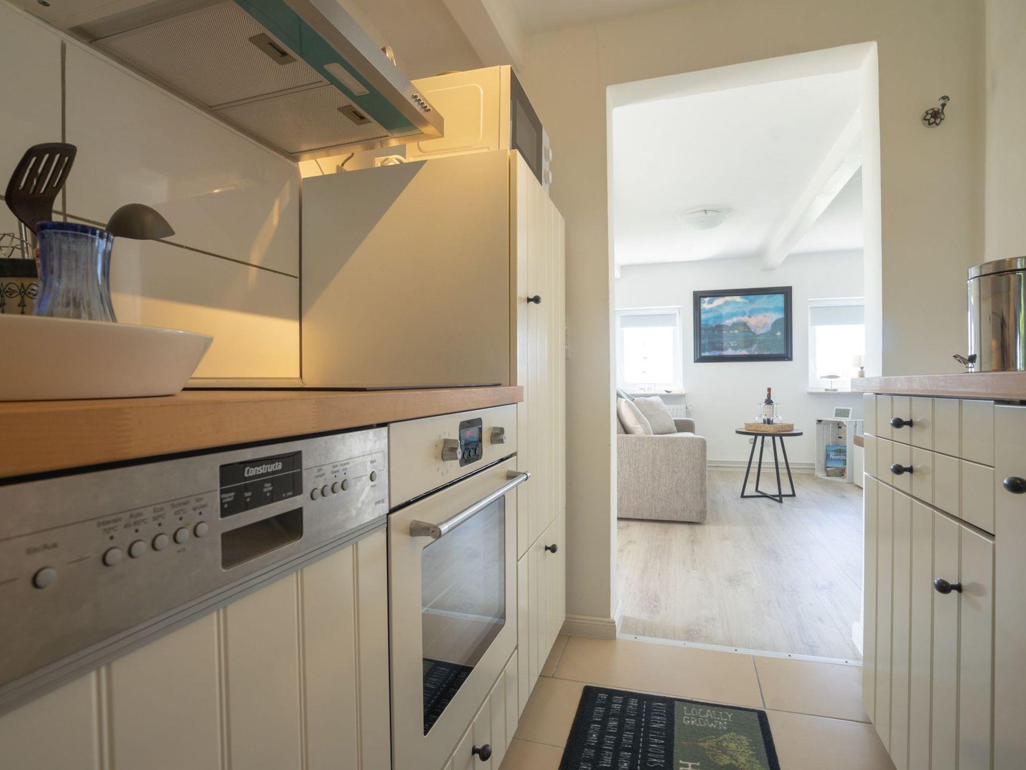 Die separate Küche bietet alles, was Sie zur Selbstversorgung brauchen. Modernes Bad, gemütlicher Essplatz und der Zugang zur eigenen Terrasse machen Lütje Knutt zu einer kleinen Wohlfühloase für zwei.