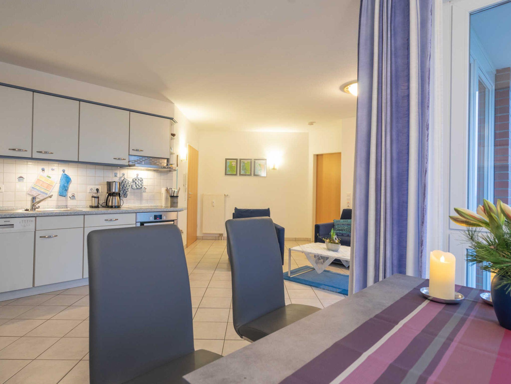 Die offene Einbauküche bietet sämtlichen Komfort, sodass Sie sich in Ihrem Urlaub komplett selbständig versorgen können. Hier stehen Ihnen unter anderem eine Kaffeemaschine, ein Backofen, Geschirrspüler und Gefrierschrank zur Verfügung. Direkt neben der Küchenzeile können bis zu 4 Personen am Esstisch Platz nehmen.