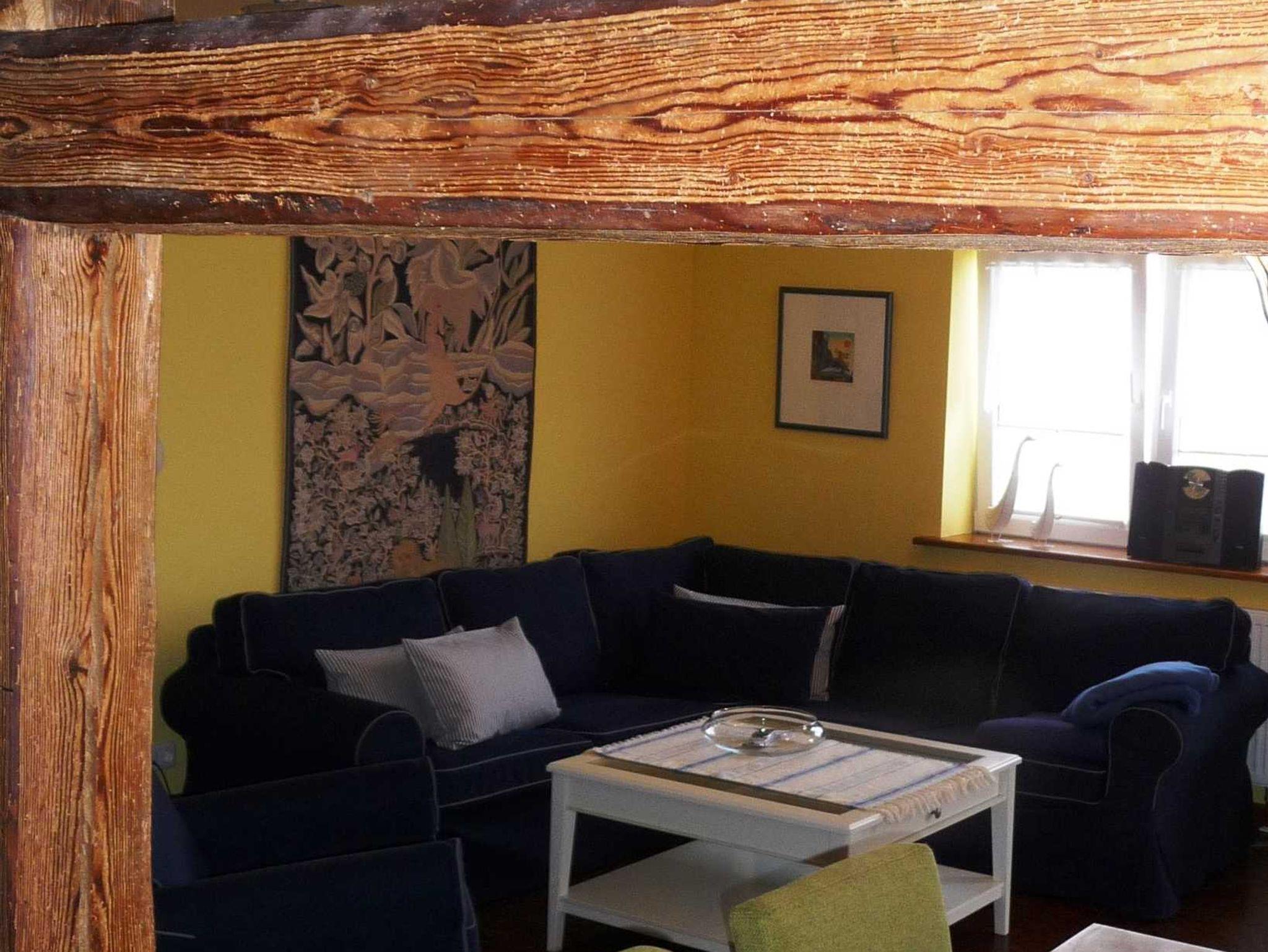 einer durch alte Holzbalken abgegrenzten Küche sowie einer supergemütlichen Schlafecke, die sich hinter einem Flächenvorhang