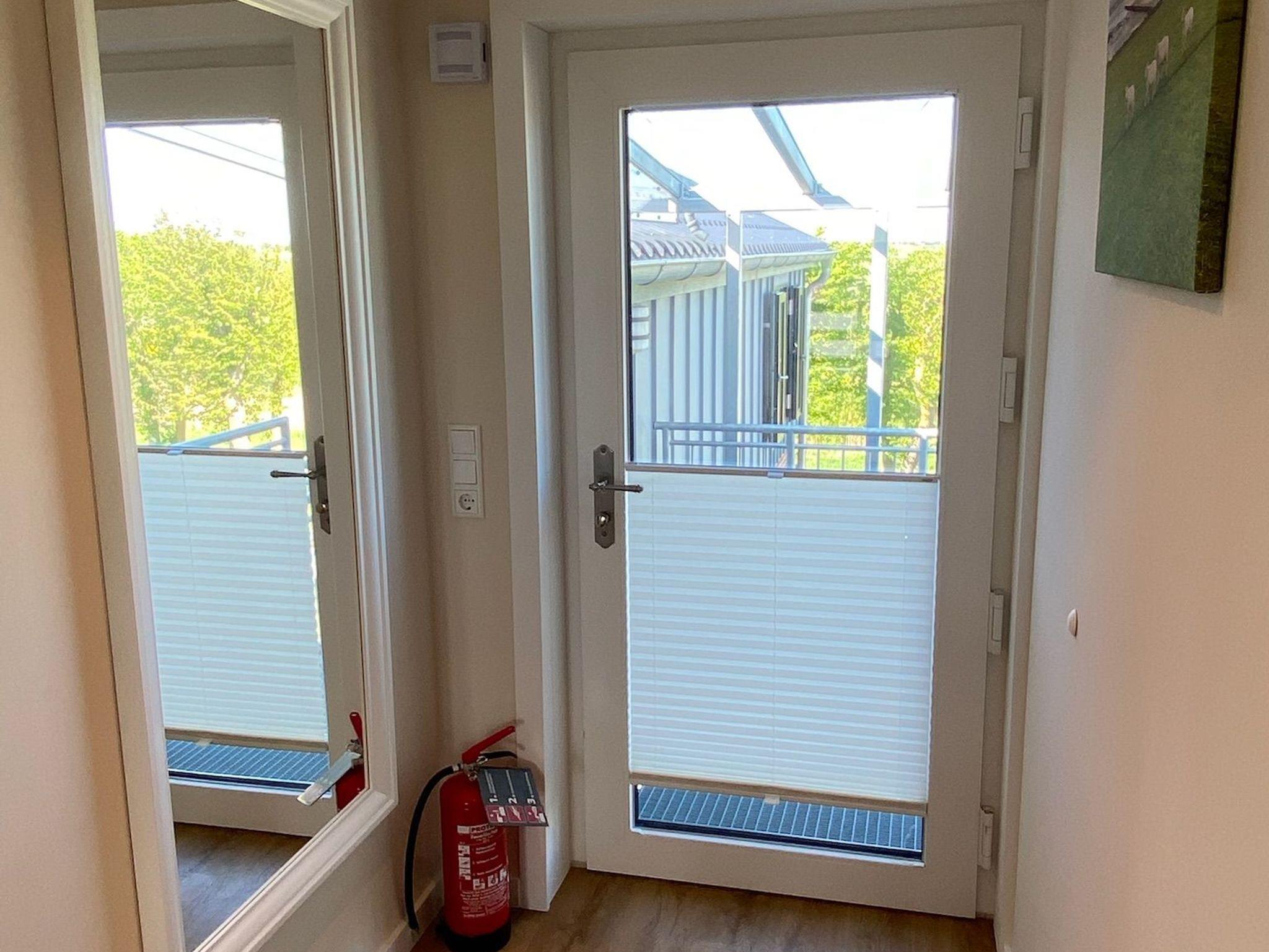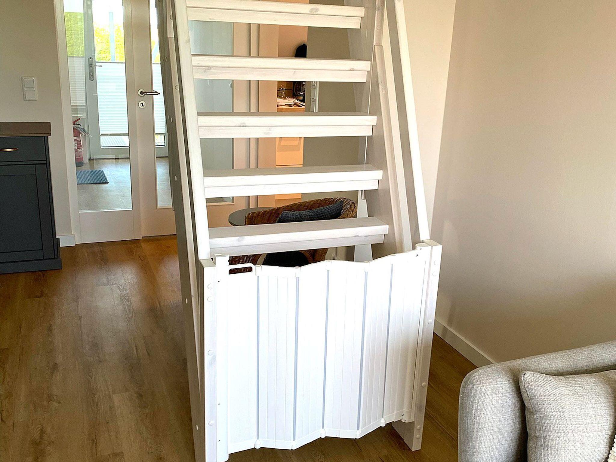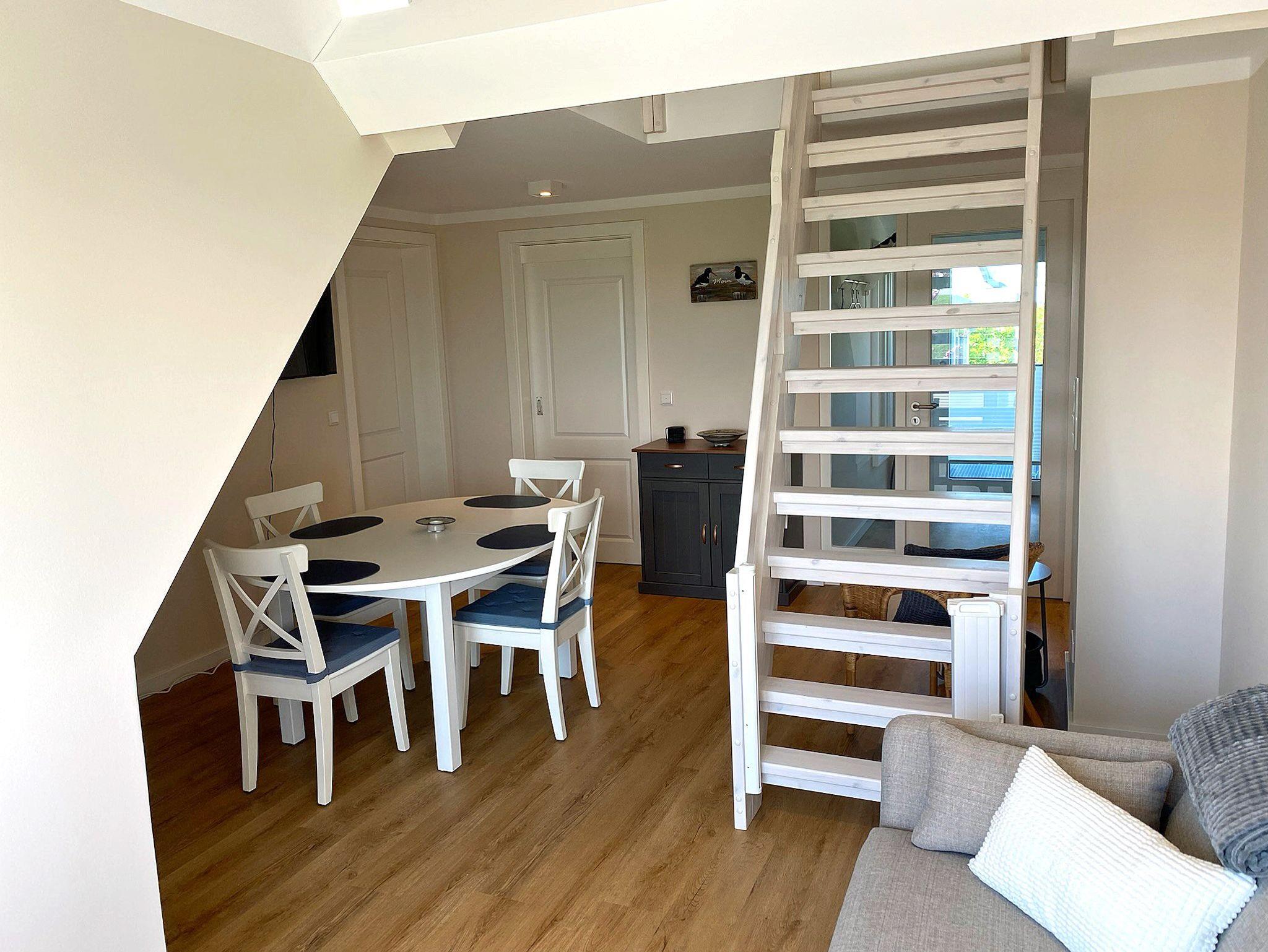 Über eine Außentreppe betreten Sie die Wohnung Austernfischer. Sie bietet Platz für bis zu 4 Erwachsene und 3 Kinder.