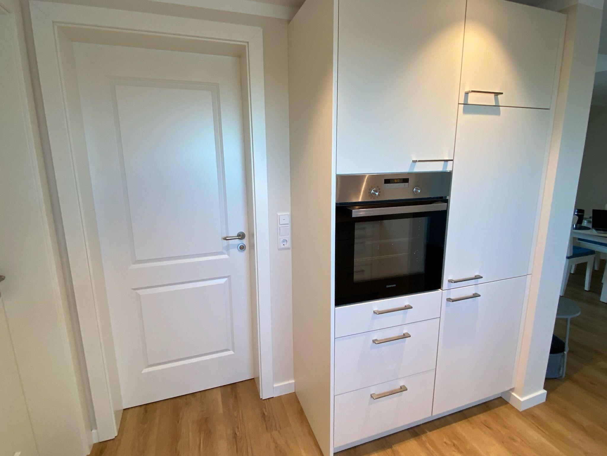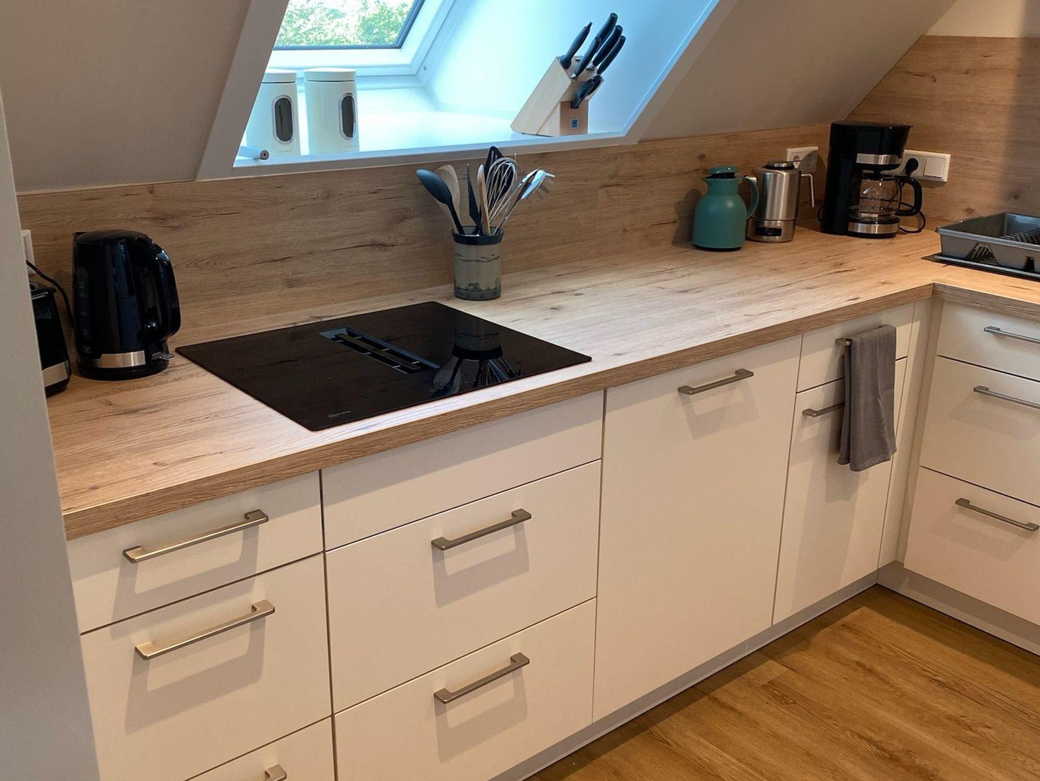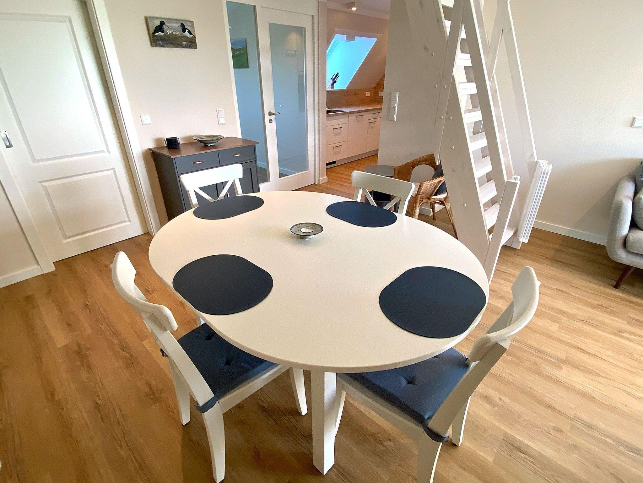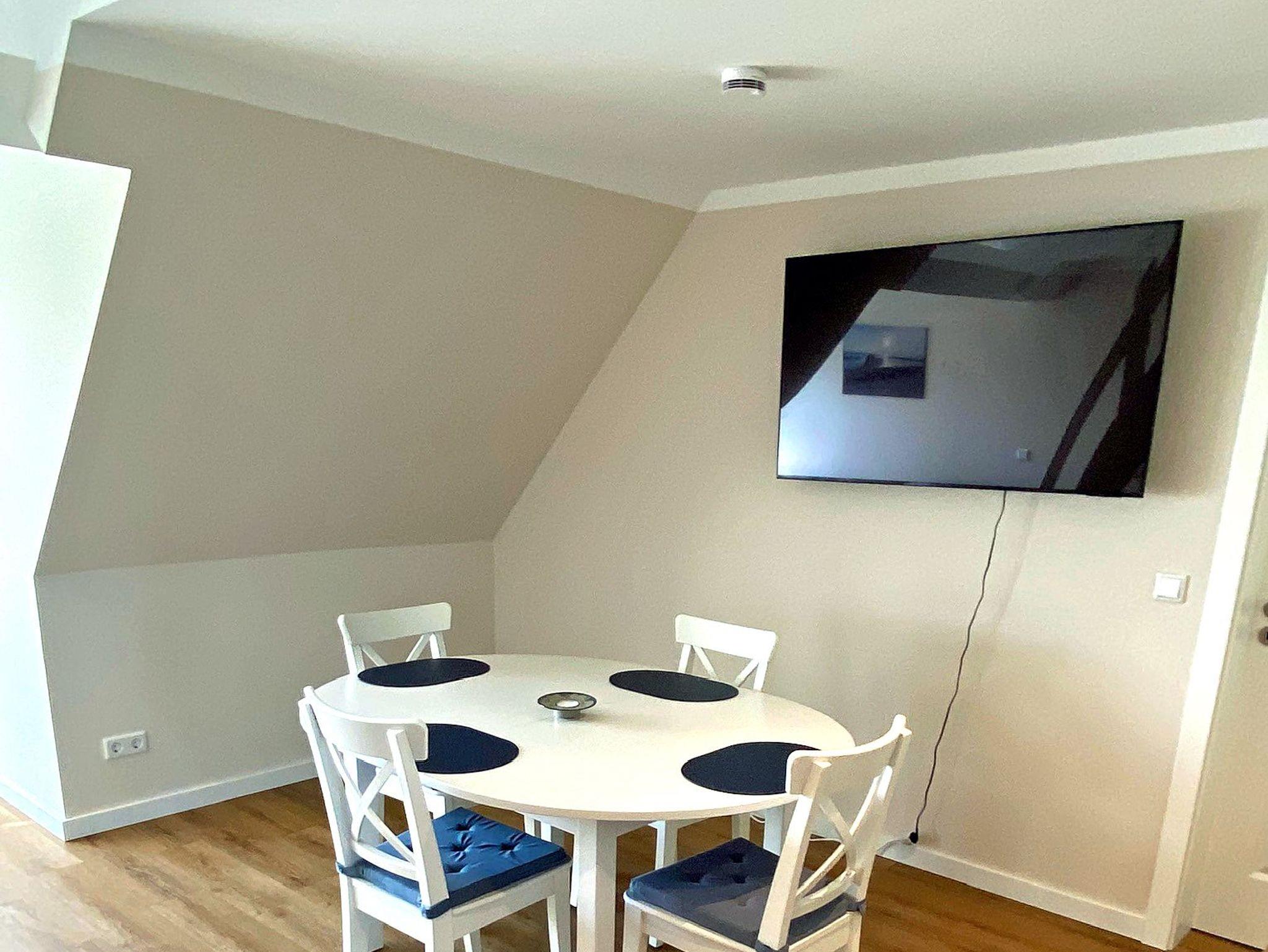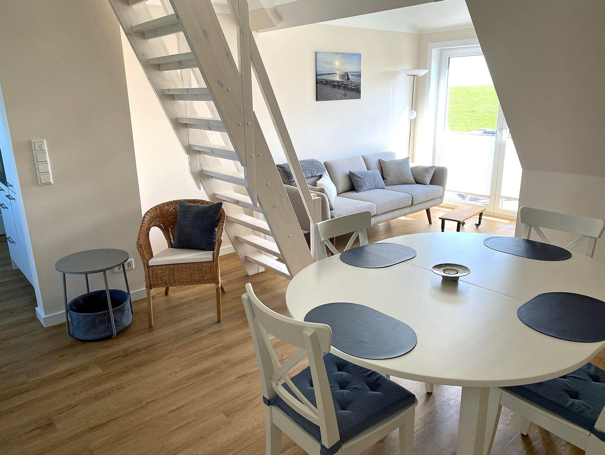 Der große Wohnraum, mit offener voll ausgestatteter Küche, wartet mit gemütlicher Couch, Smart-TV und Esstisch auf. Von dort aus geht es auch auf den Balkon mit Deichblick.