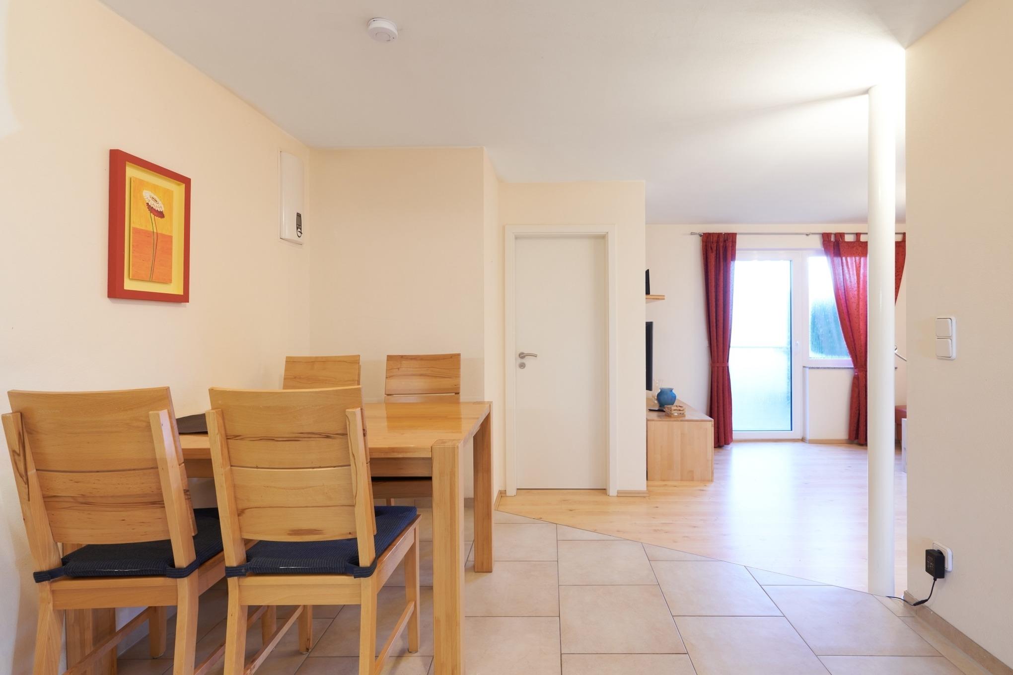Die Küchenzeile ist perfekt ausgestattet mit Cerankochfeld, Backofen, Geschirrspüler, Mikrowelle und Kaffeemaschine (Filtergröße 4). Der Essbereich und das Duschbad runden das Bild ab.