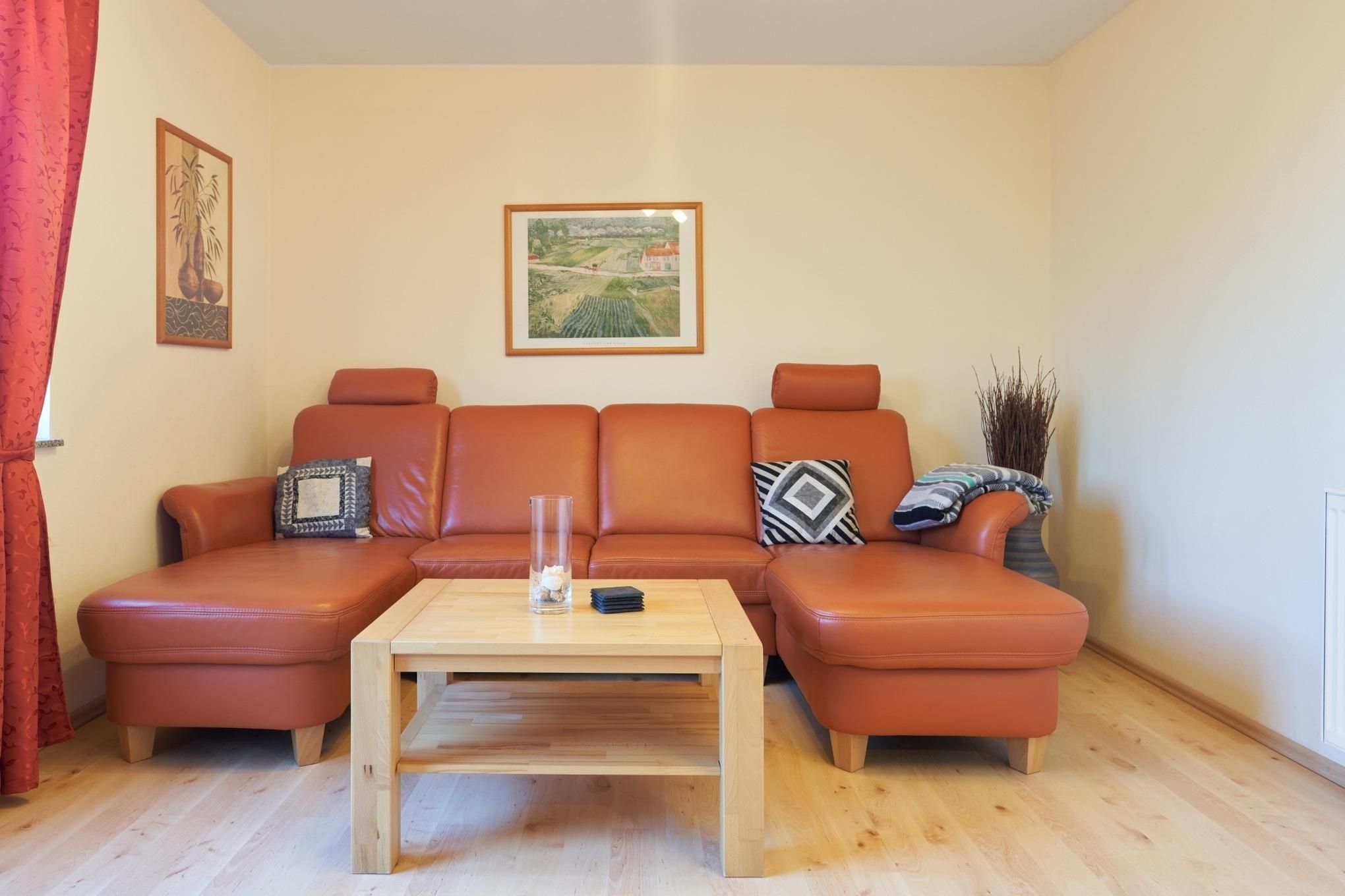 Das geräumige Wohnzimmer verfügt über SAT-TV, WLAN und einen CD-Player für Ihre Unterhaltung. Von hier aus haben Sie Zugang zur geschützten Terrasse (45 qm) mit Gartenmöbeln, wo Sie den Tag ausklingen lassen können.