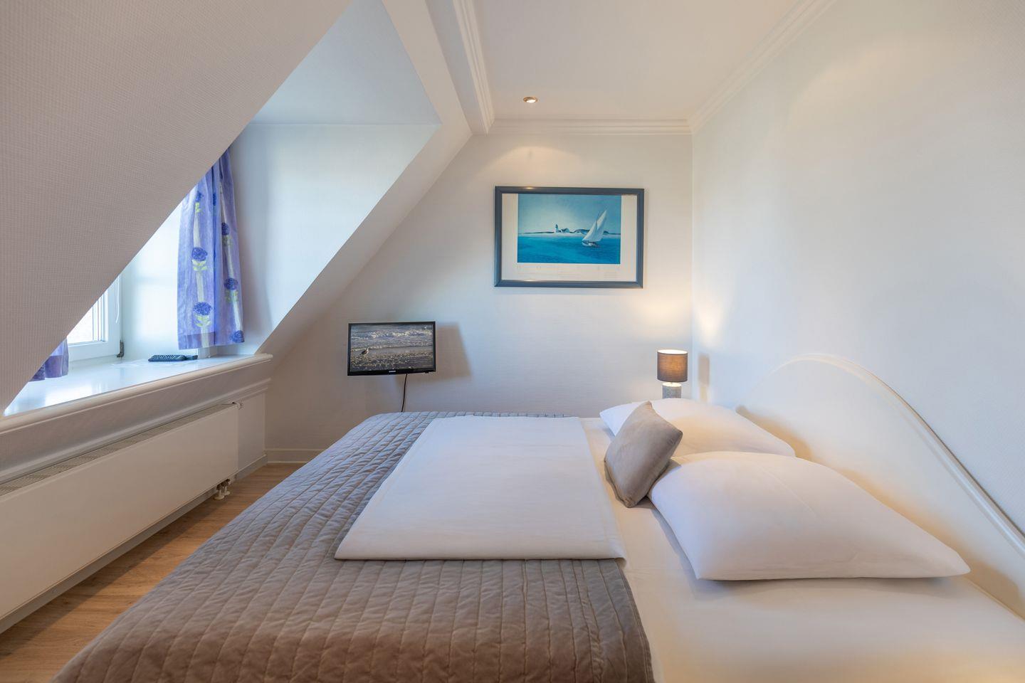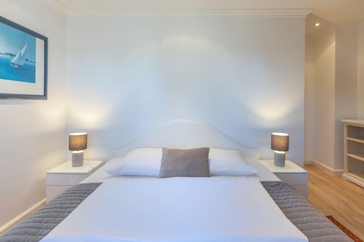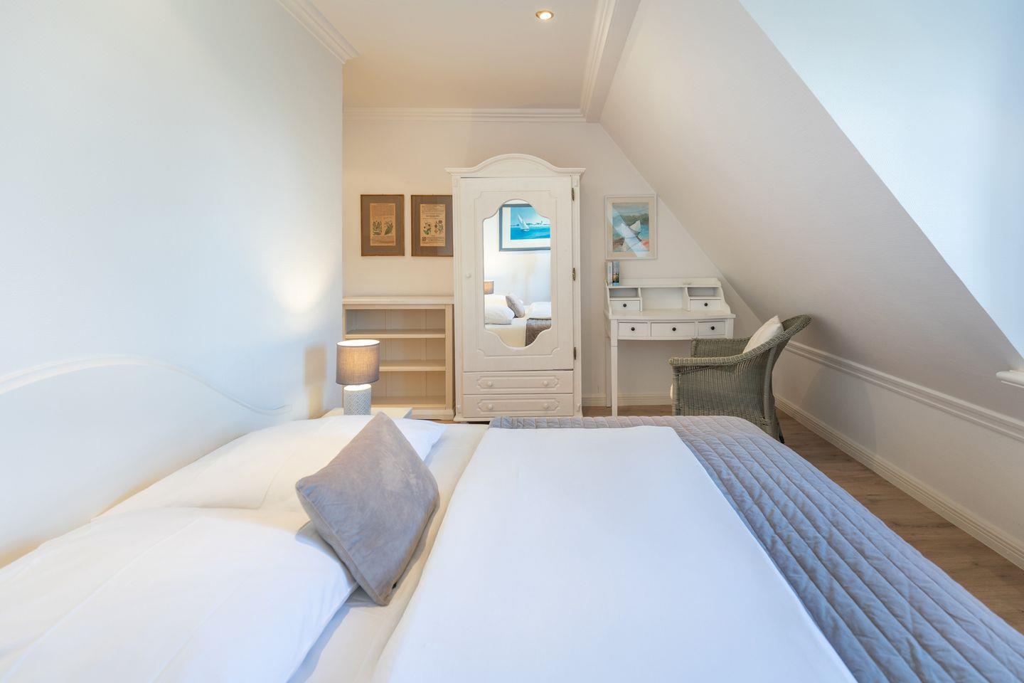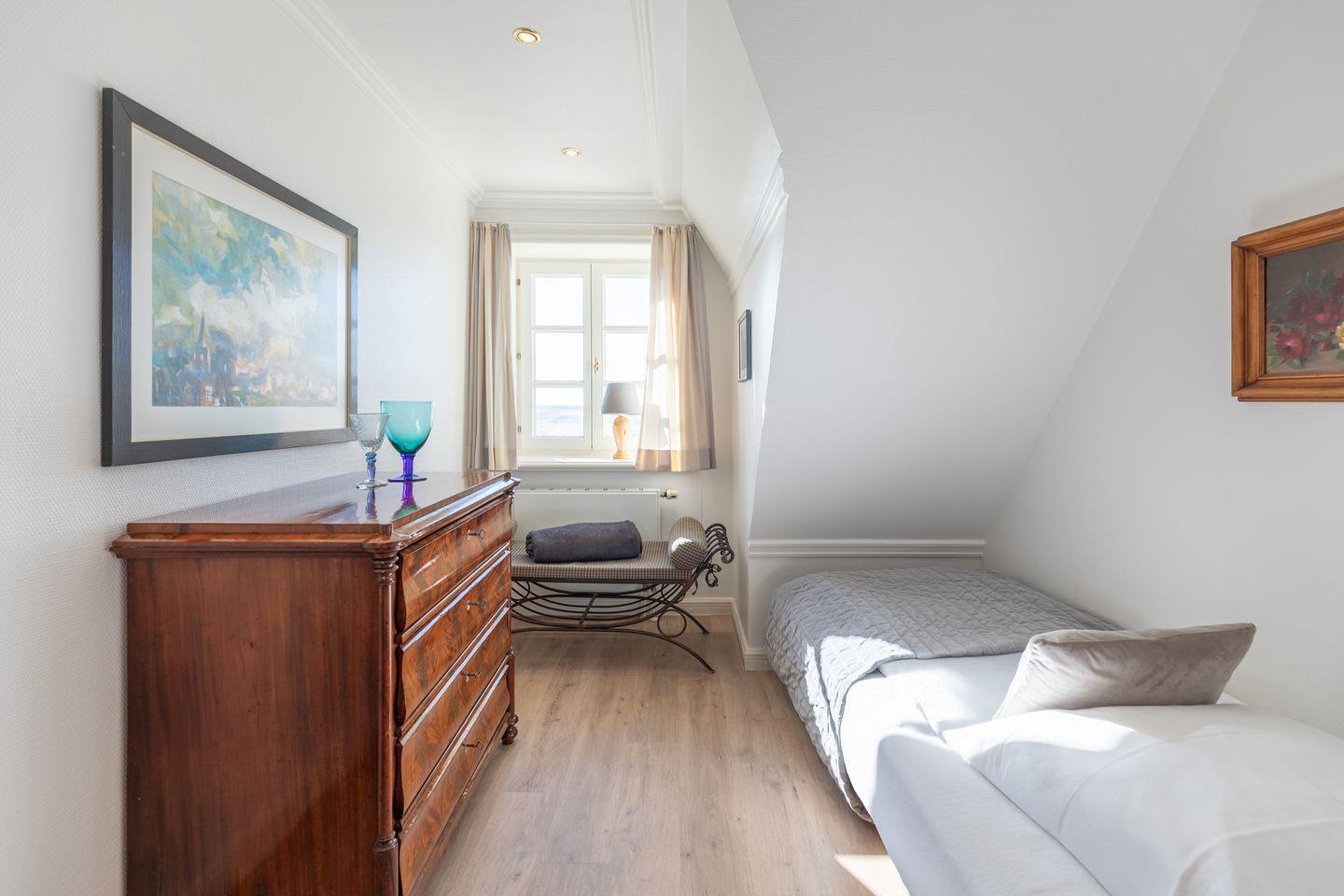 Das Schlafzimmer im ersten Obergeschoss bietet mit einem bequemen Doppelbett (180 x 200) Platz für bis zu zwei Personen. Ein Einzelbett (je 90 x 200), welches sich ebenfalls im ersten Obergeschoss befindet, stellt eine weitere Schlafmöglichkeit dar.