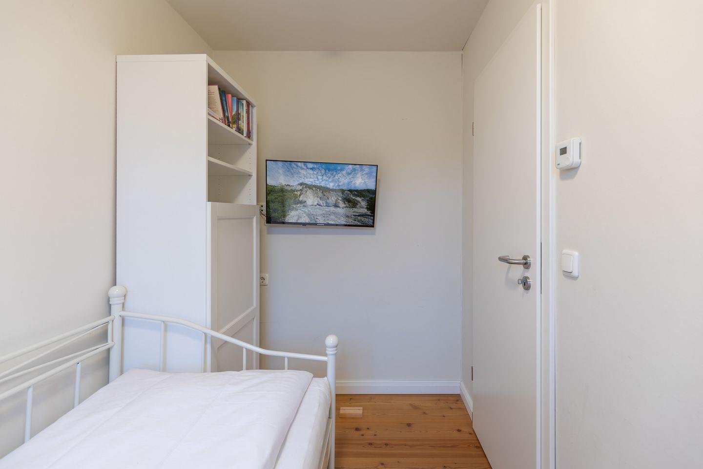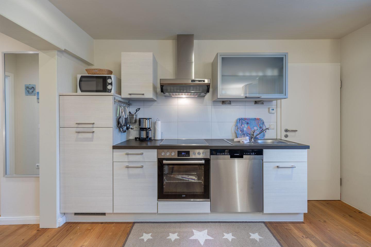Auf 42 m² bietet die Ferienwohnung Platz für bis zu drei Personen und verfügt über zwei gemütliche Schlafzimmer. Die offene, voll ausgestattete Küche mit Ceranfeld, Backofen, Spülmaschine und Mikrowelle lädt zum gemeinsamen Kochen ein. Der angrenzende Essbereich sorgt für gesellige Stunden, während der Wohnbereich mit Sofa und TV zum Entspannen einlädt. Das moderne Badezimmer ist mit Dusche, Waschbecken und WC ausgestattet.