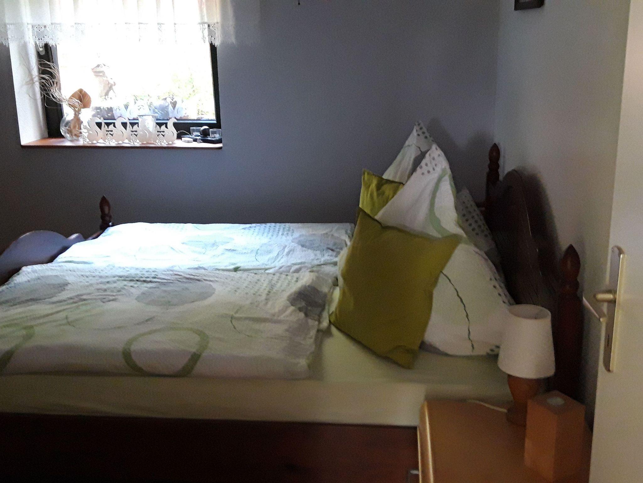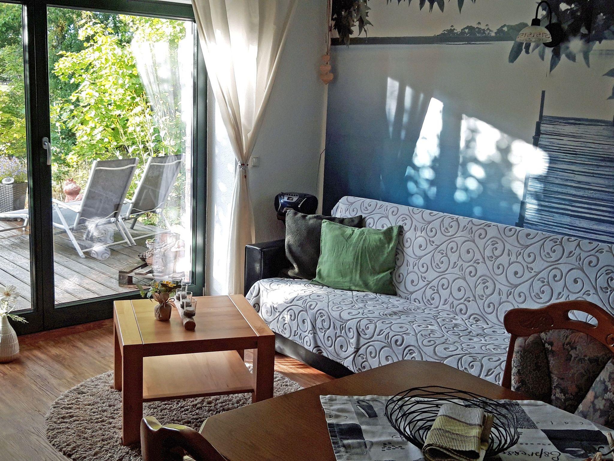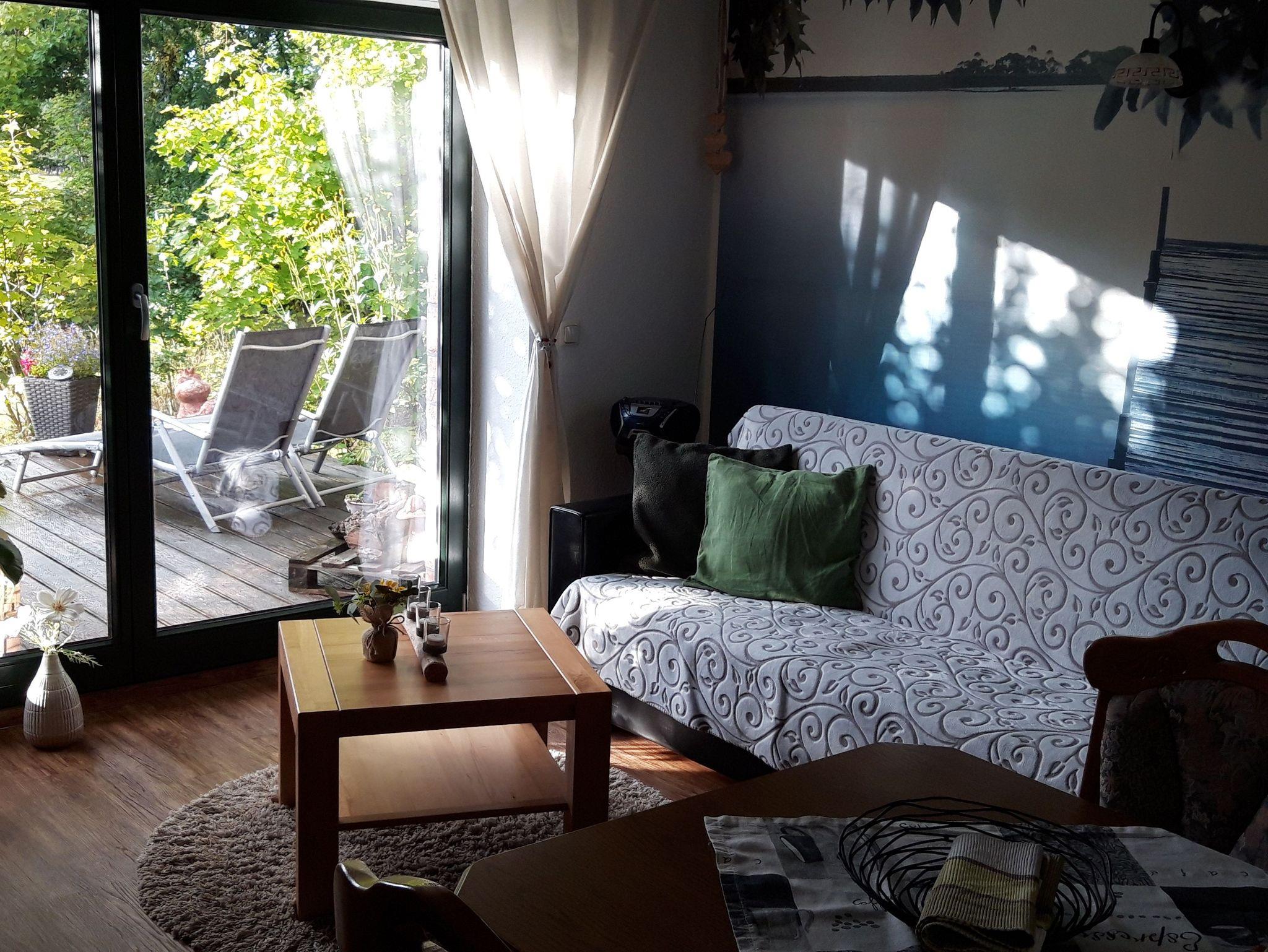 Die Ferienwohnung befindet sich in einem Einfamilienhaus direkt am Wald. Über einen eigenen Eingang betreten Sie die Erdgeschoss-Wohnung durch einen kleinen Flur. Im Wohnzimmer steht eine Couch gegenüber dem Fernseher sowie ein Esstisch nahe der offenen Küche. Vom Wohn- und Esszimmer kommen Sie direkt auf die große Terrasse mit dem schönen Naturblick. Im Schlafzimmer befindet sich neben dem Doppelbett ein 3-türiger Kleiderschrank mit Spiegel. Der dritte Gast kann auf dem klappbaren Gästebett (0,80m x 1,90m) schlafen, ein Kleinkind bis 2 Jahre im Kinderreisebett/Babybett kann kostenlos übernachten. Die Nichtraucherwohnung wird durch ein Duschbad mit WC komplettiert. WLan ist vorhanden, leider empfangen Sie nur das D1-Mobil-Netz. Alle Fenster der Ferienwohnung sind mit Außenrollläden ausgestattet. Ihre Räder haben Platz in einem Fahrrad-Abstellraum. Ihr Pkw parkt auf dem Grundstück am Haus.