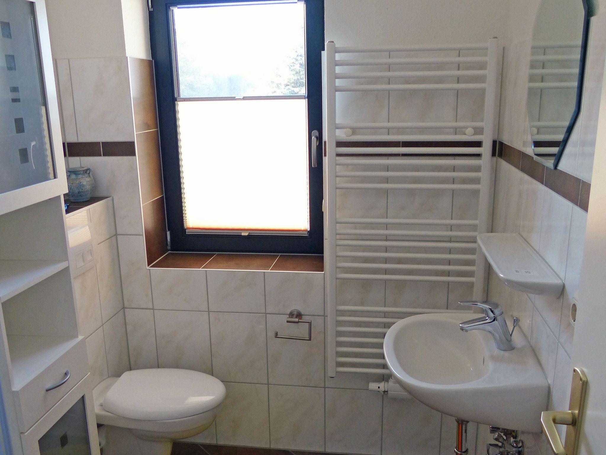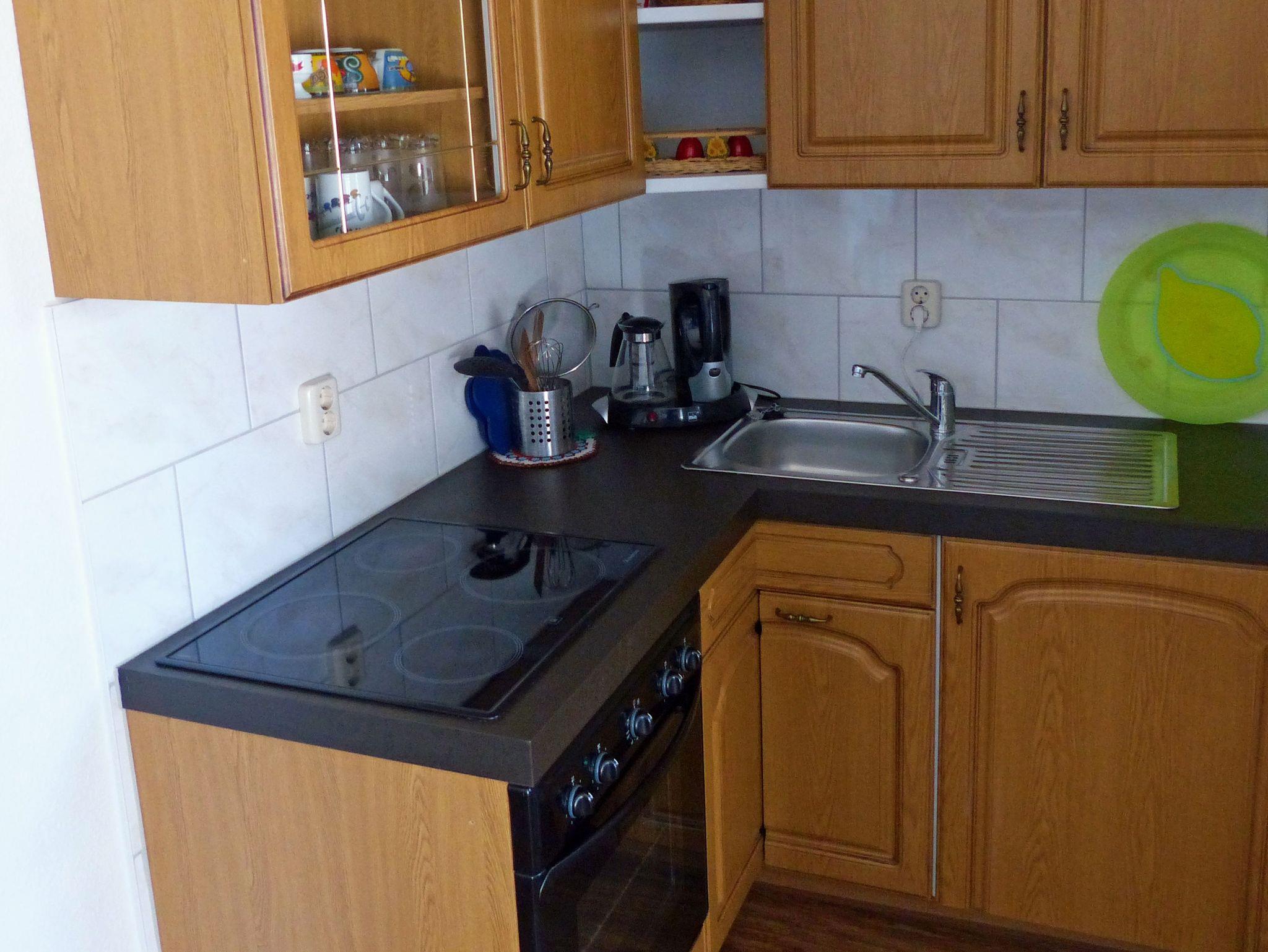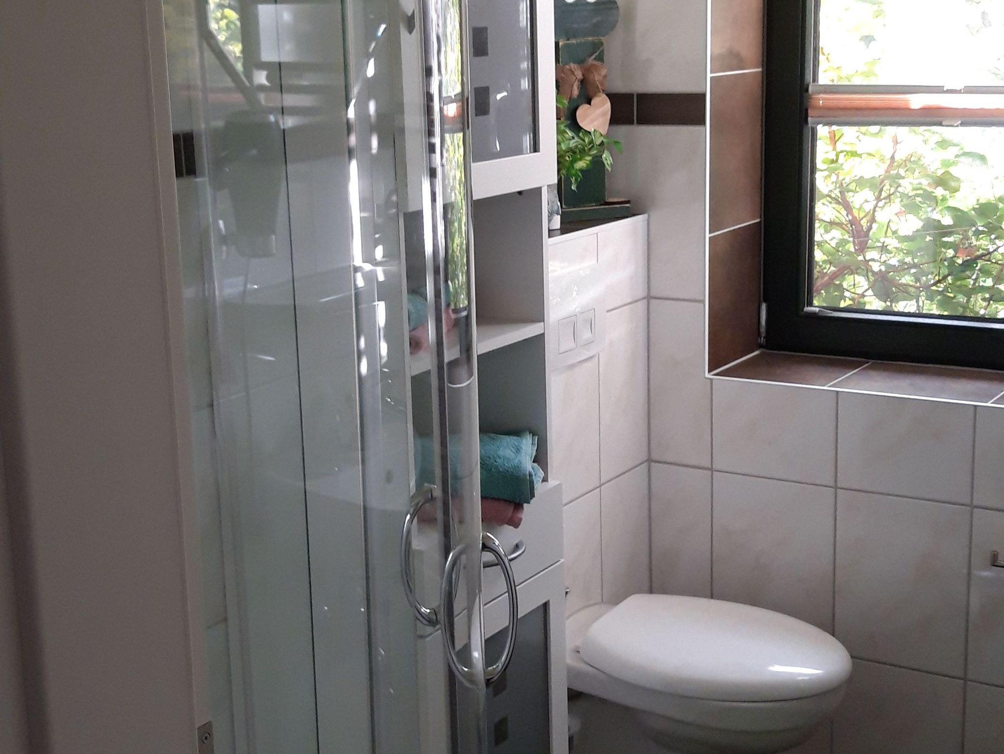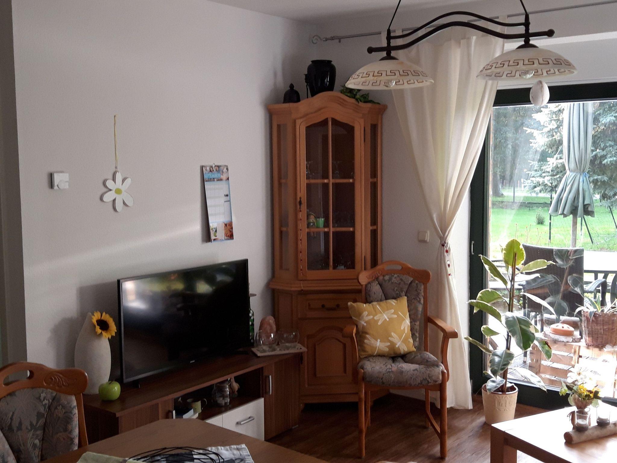 Die Ferienwohnung befindet sich in einem Einfamilienhaus direkt am Wald. Über einen eigenen Eingang betreten Sie die Erdgeschoss-Wohnung durch einen kleinen Flur. Im Wohnzimmer steht eine Couch gegenüber dem Fernseher sowie ein Esstisch nahe der offenen Küche. Vom Wohn- und Esszimmer kommen Sie direkt auf die große Terrasse mit dem schönen Naturblick. Im Schlafzimmer befindet sich neben dem Doppelbett ein 3-türiger Kleiderschrank mit Spiegel. Der dritte Gast kann auf dem klappbaren Gästebett (0,80m x 1,90m) schlafen, ein Kleinkind bis 2 Jahre im Kinderreisebett/Babybett kann kostenlos übernachten. Die Nichtraucherwohnung wird durch ein Duschbad mit WC komplettiert. WLan ist vorhanden, leider empfangen Sie nur das D1-Mobil-Netz. Alle Fenster der Ferienwohnung sind mit Außenrollläden ausgestattet. Ihre Räder haben Platz in einem Fahrrad-Abstellraum. Ihr Pkw parkt auf dem Grundstück am Haus.