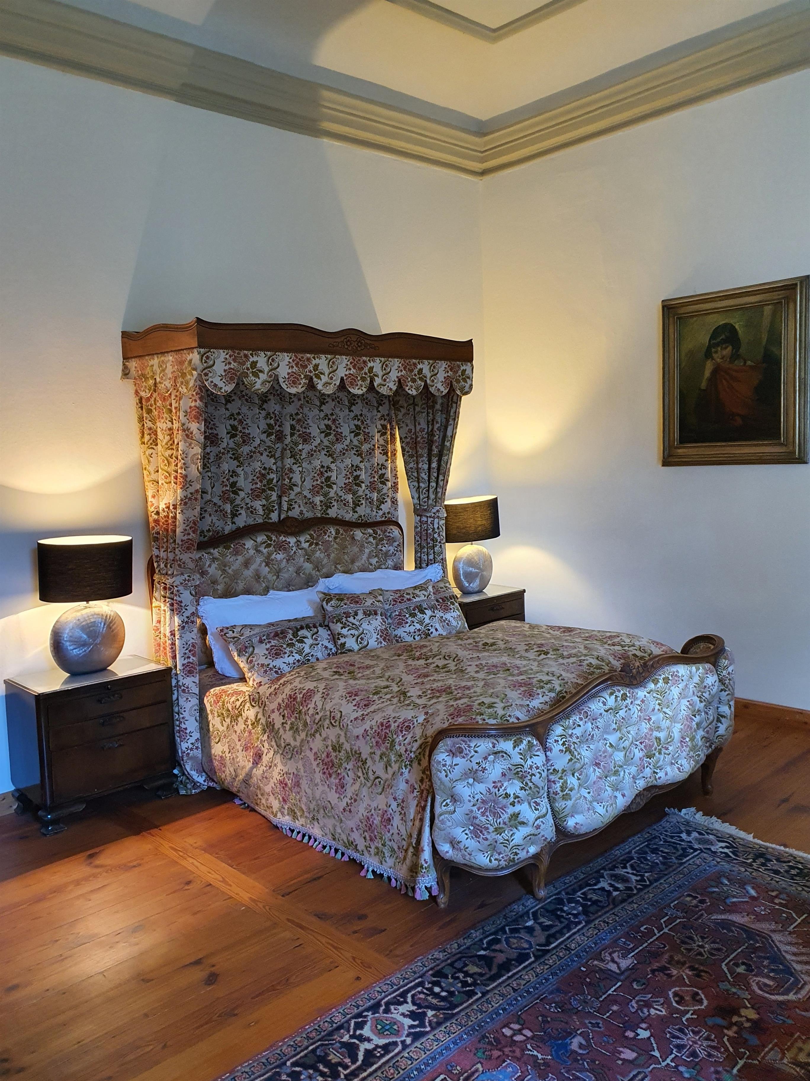 Die 60 qm große Suite Steinort verfügt über ein großes Himmeldoppelbett (1,6mx2,0m), eine Sofaecke, einen Sekretär sowie einen Bauernschrank. Das Bad ist ausgestattet mit einem großen Whirlpool für 2 Personen mit Licht- und Ozontherapie und einem Bidet.