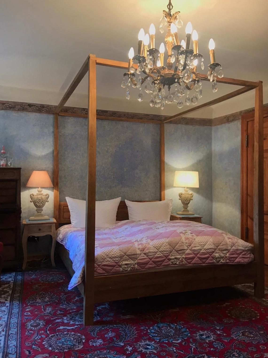 Das 28 qm große Zimmer verfügt über eine Himmeldoppelbett (1,6mx1,8m), einen Fernseher, einen Sekretär und ein separates Duschbad. Zudem zeichnet es eine wunderschöne und faszinierende historische Wandrestaurierung aus.
