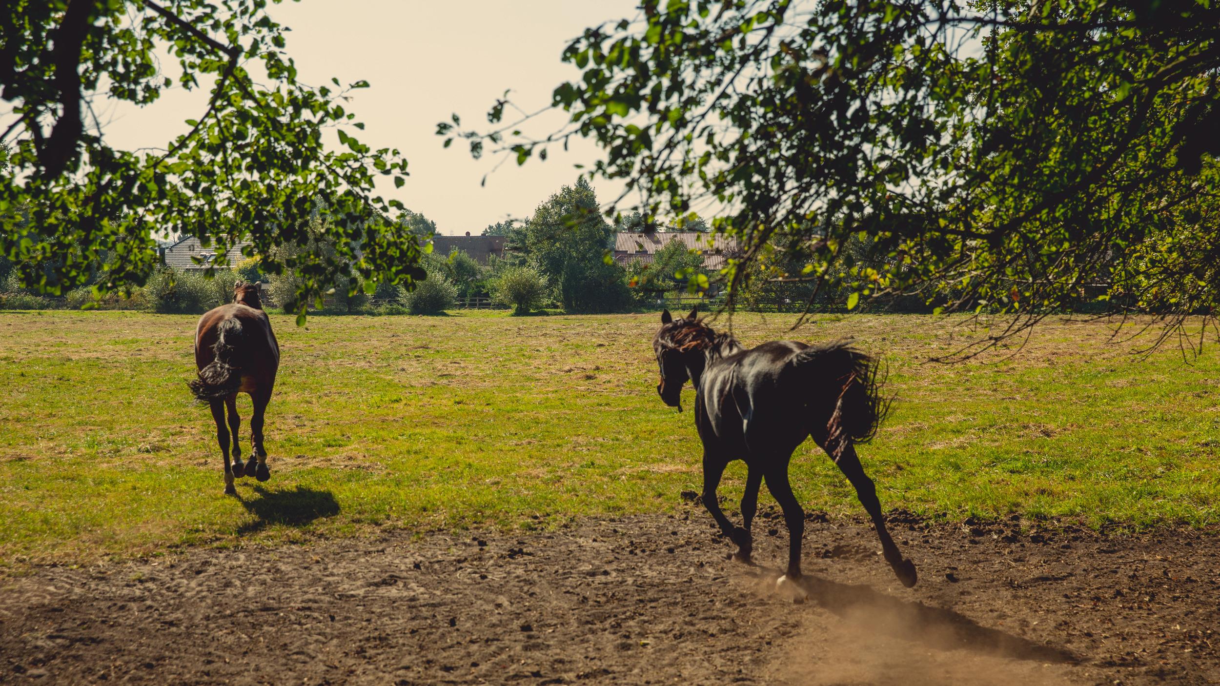 Das 27,8 qm große Zimmer hat ein Schlafzimmer im 30iger Jahre Stil mit Doppelbett (2,0mx2,0m) und großem Wand-TV, einen kleinen Arbeitsbereich auf dem Flur, ein separates Duschbad und verfügt zudem über einen Ausblick auf die Pferdeweide.